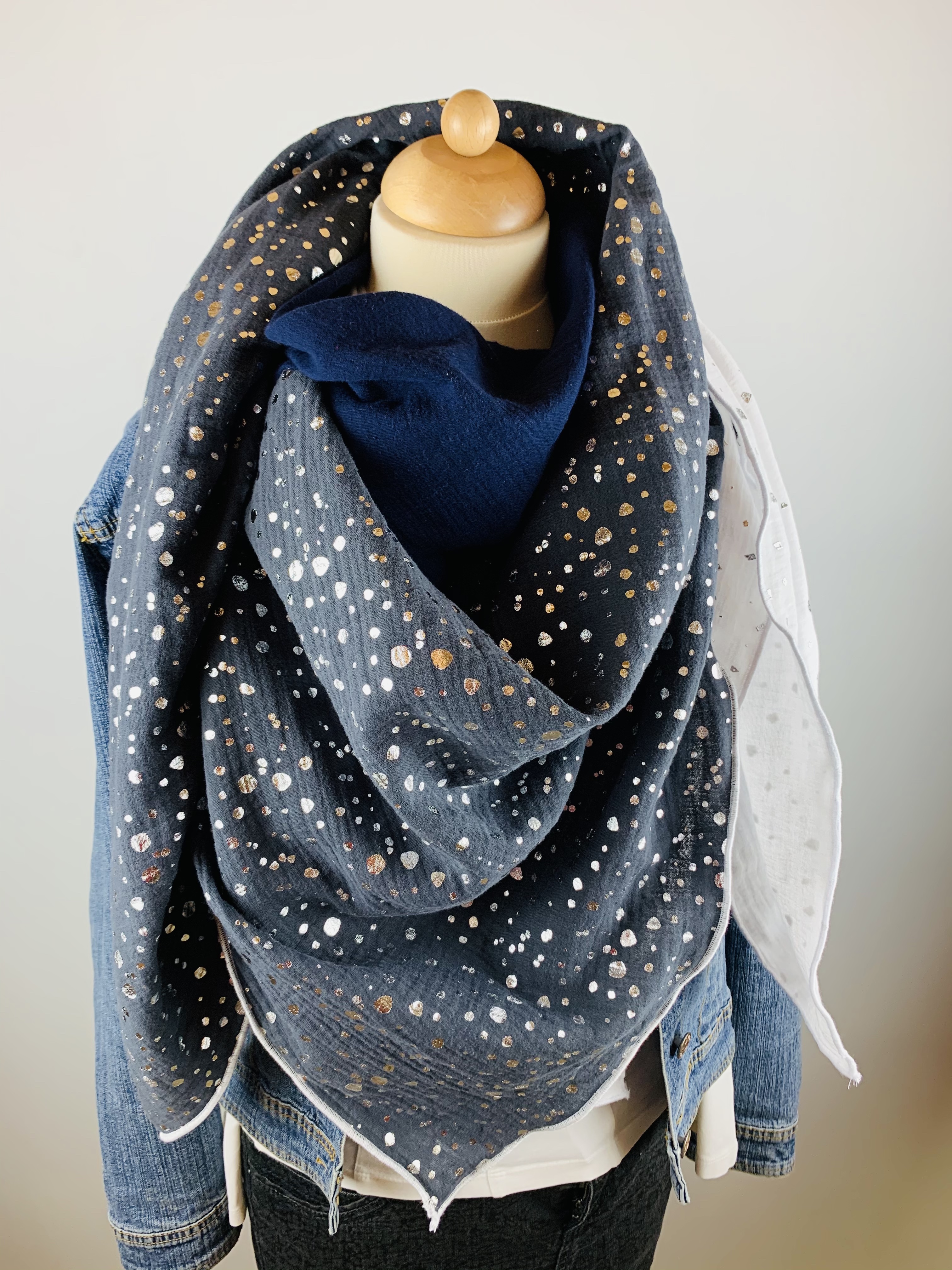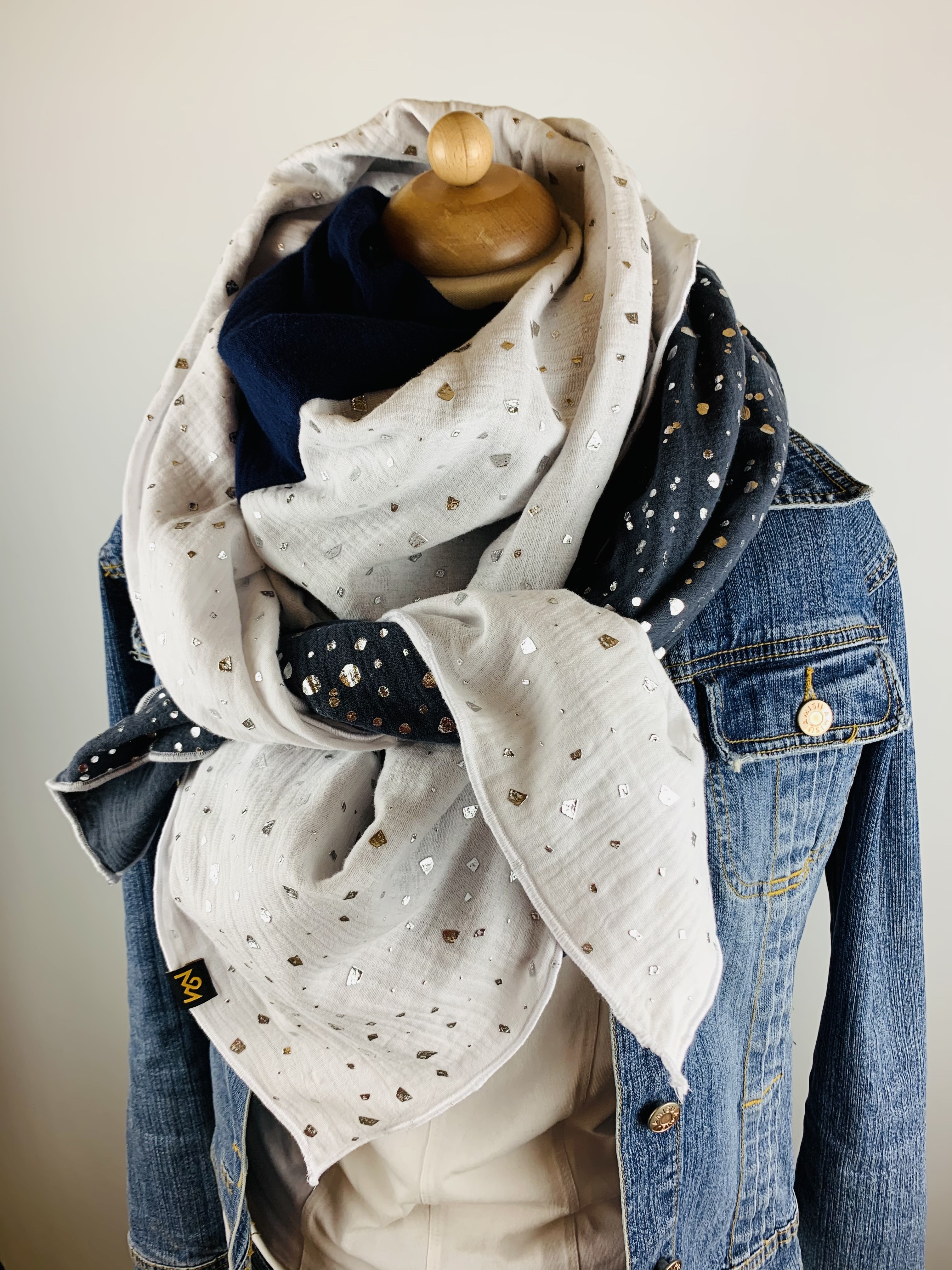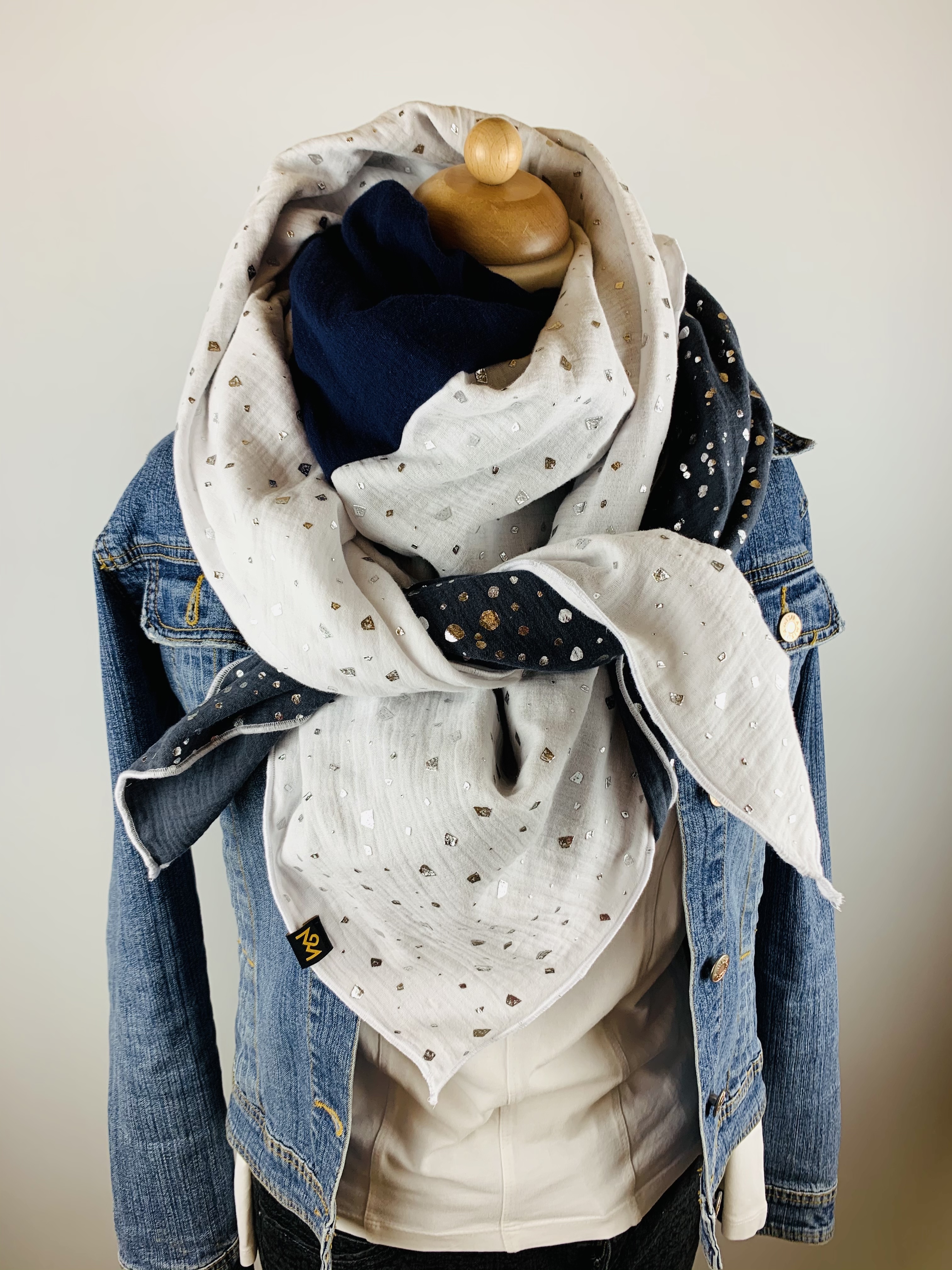 Dieser hochwertige, doppelt gewebte Schal aus 100 % Baumwollmusselin wurde in der Farbe weiß mit Glitzerflakes, marineblau und graublau mit silbernen Punkten gefertigt.