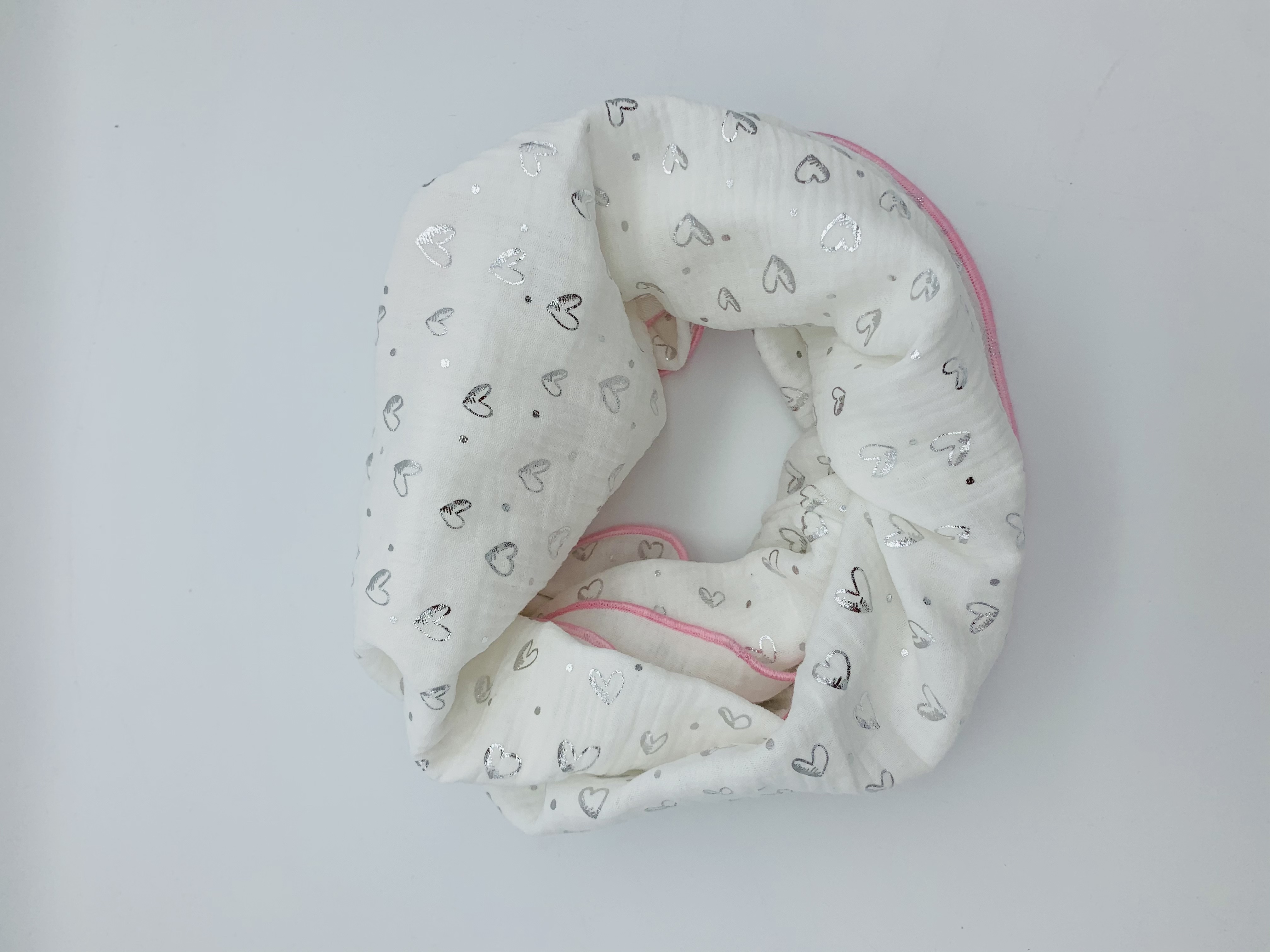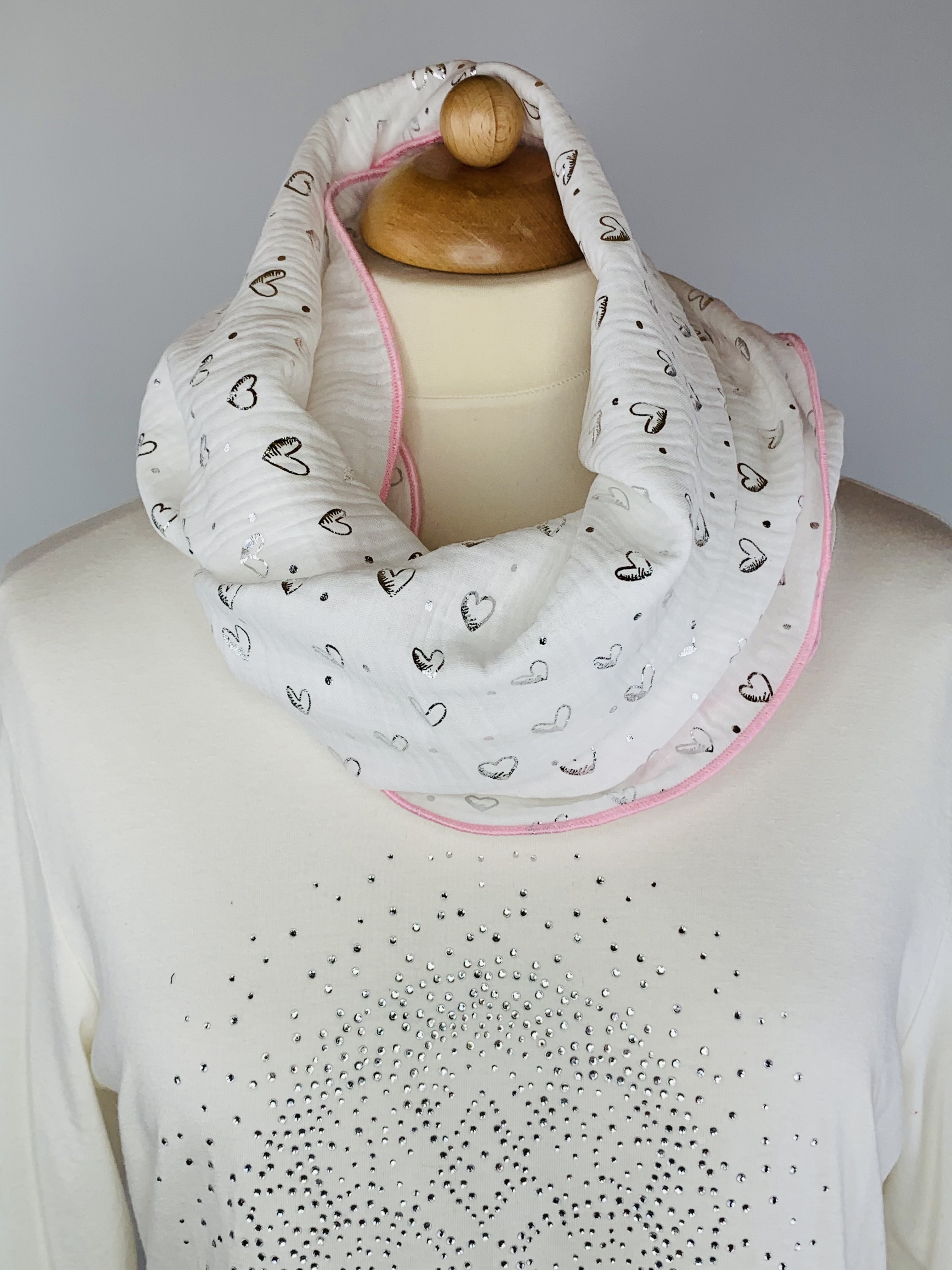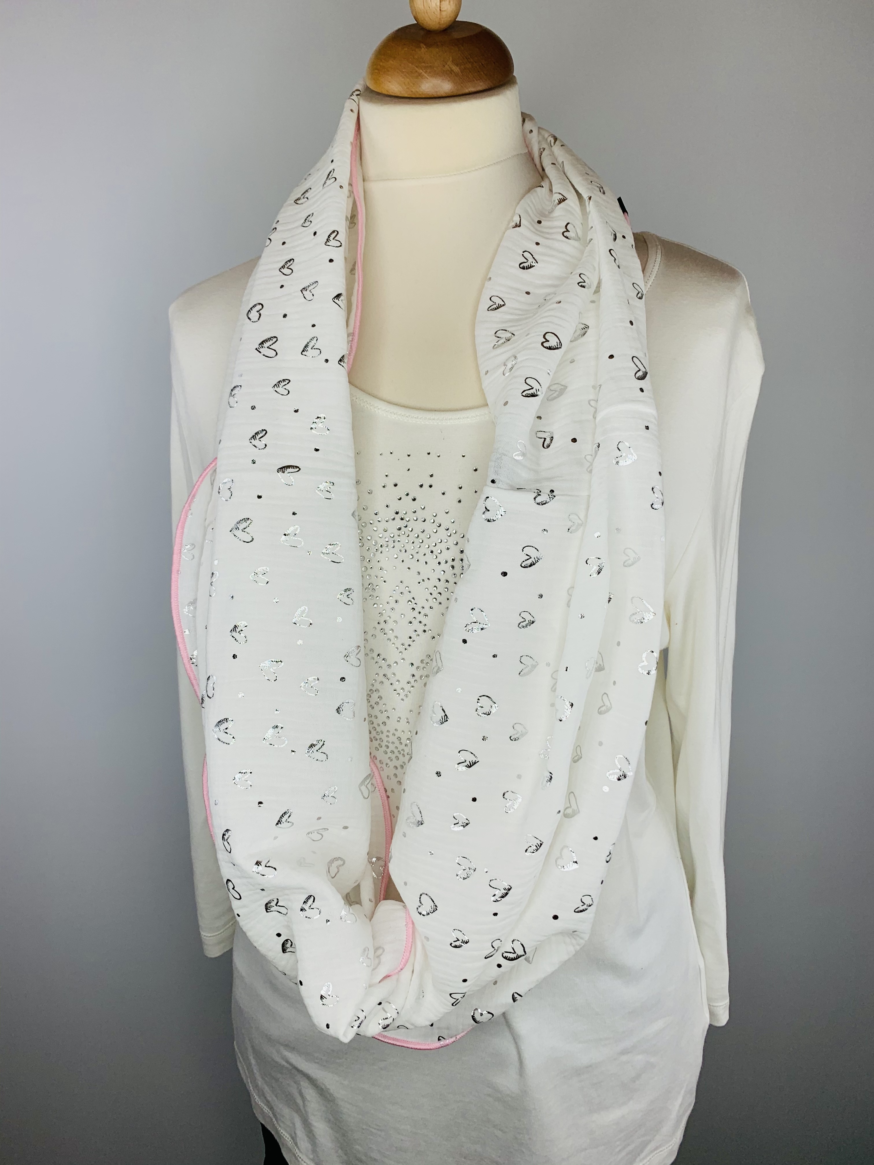 Hochwertiger, doppelt gewebter Schlauchschal aus 100 % Baumwollmusselin in weiß mit silbernen Herzchen .