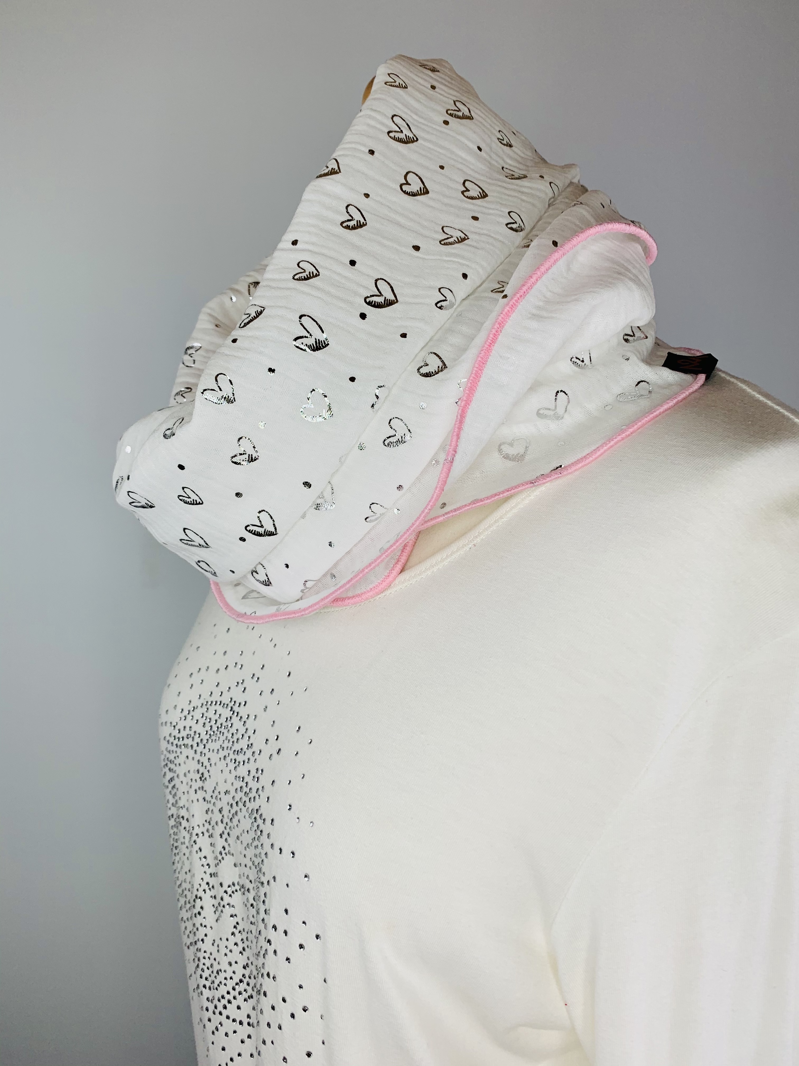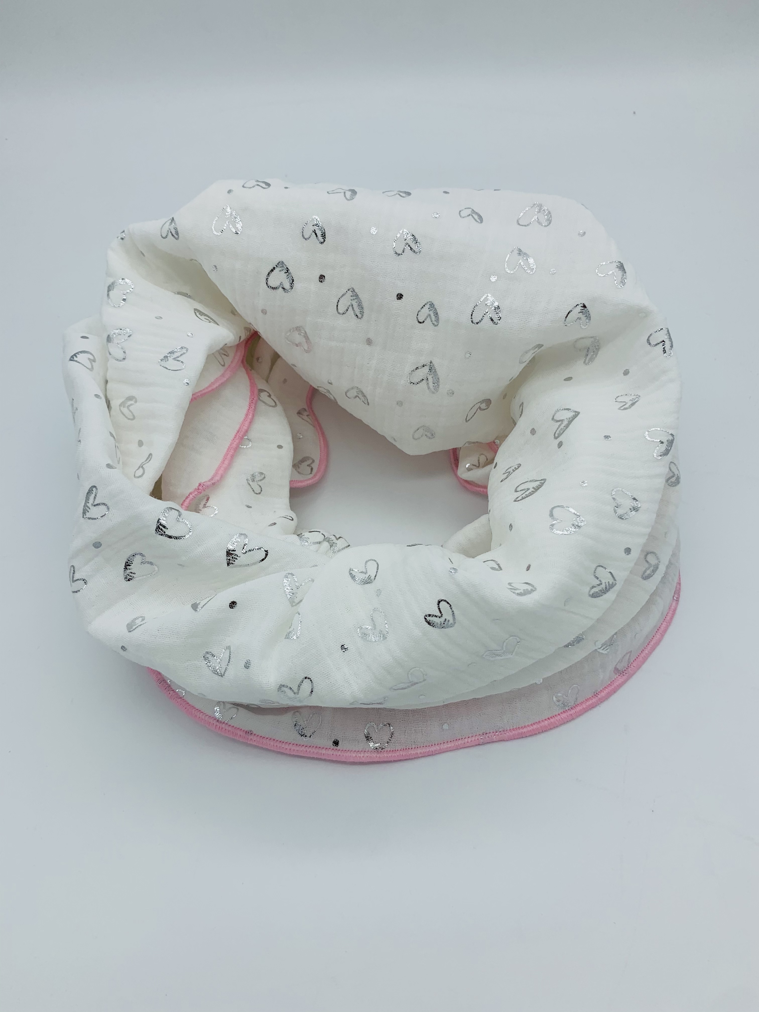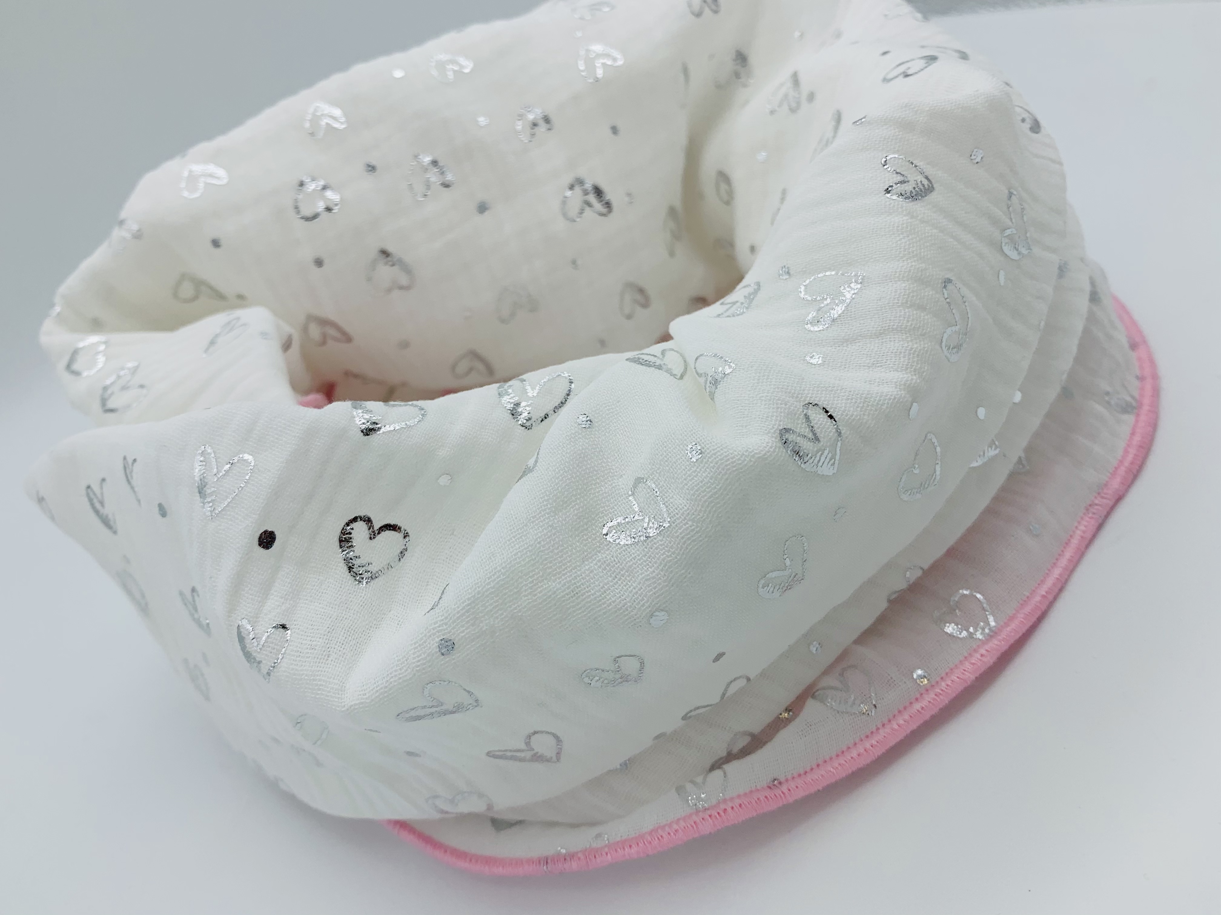 Hochwertiger, doppelt gewebter Schlauchschal aus 100 % Baumwollmusselin in weiß mit silbernen Herzchen .