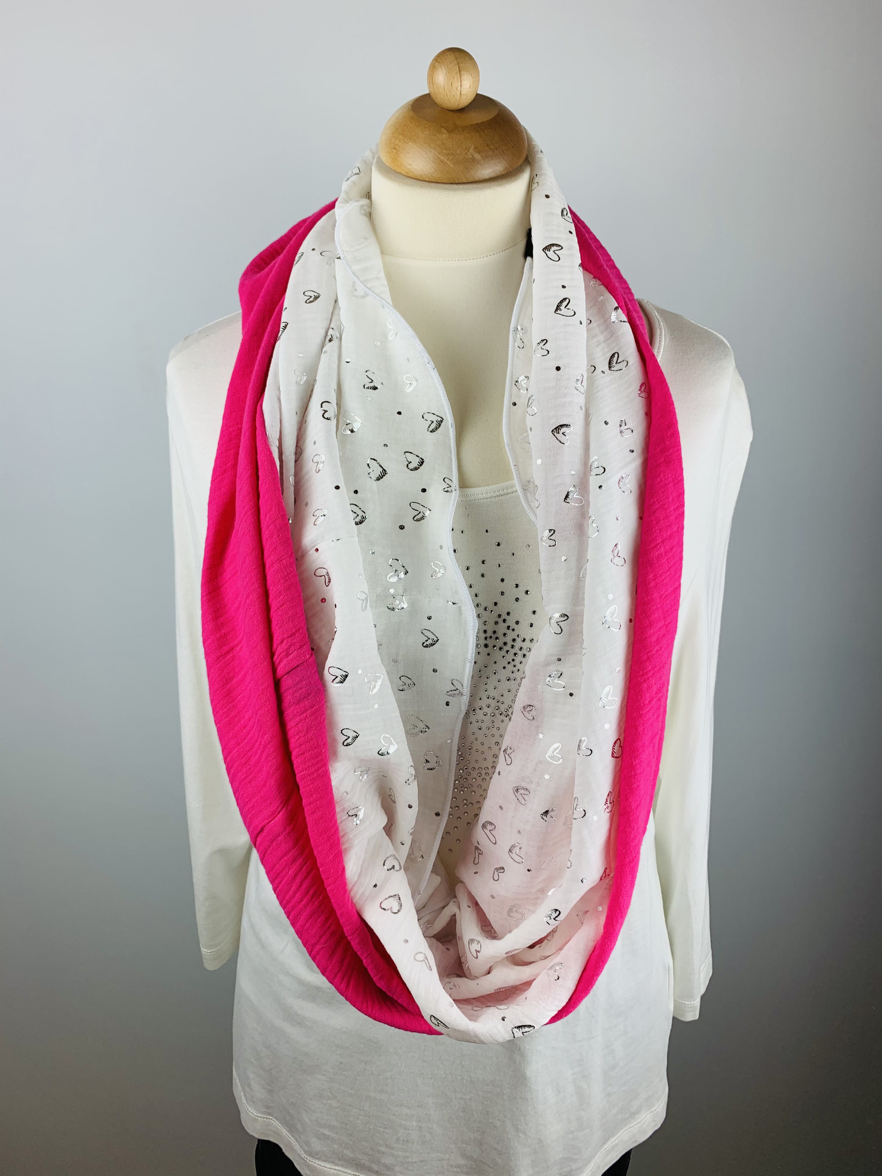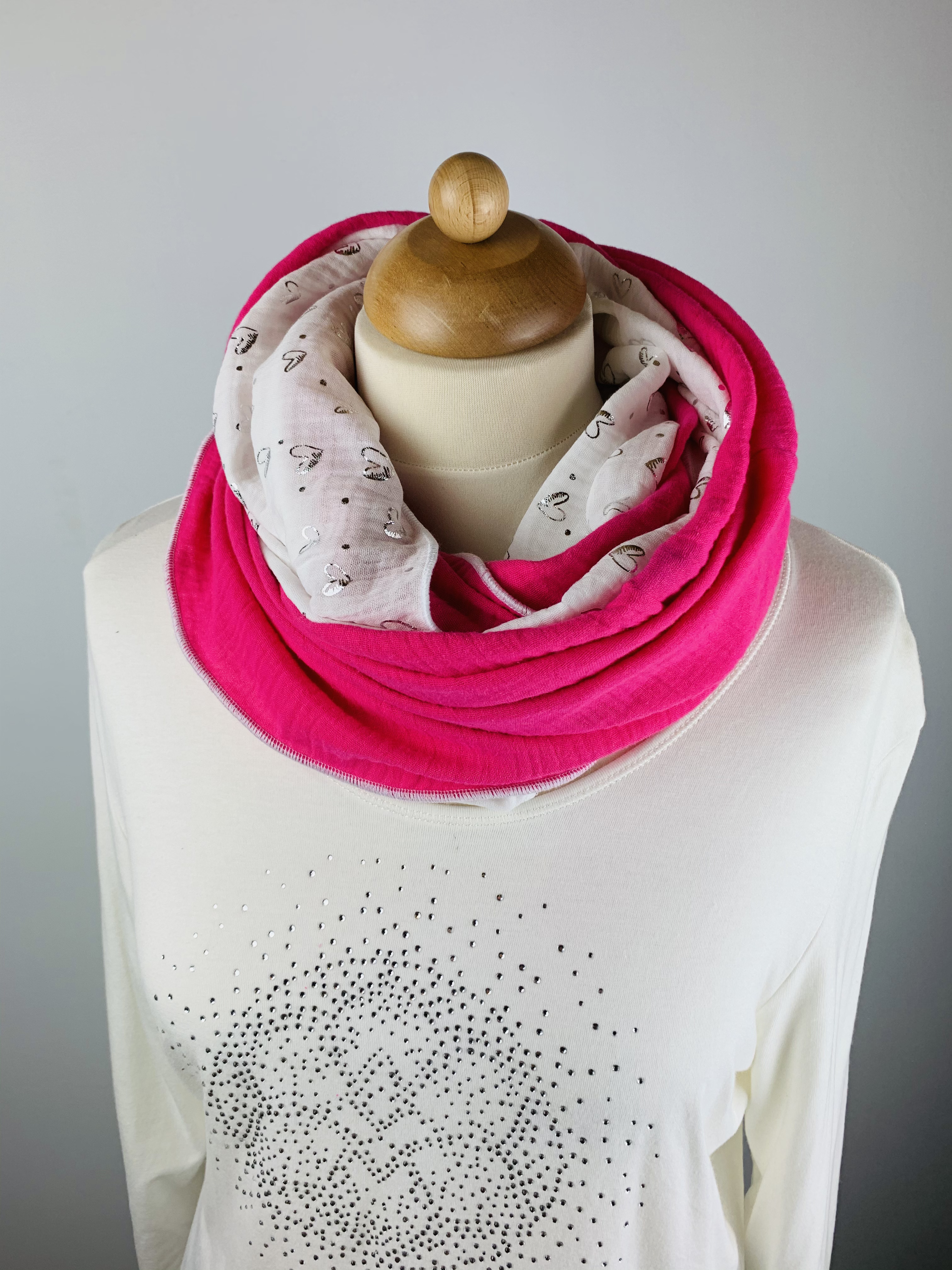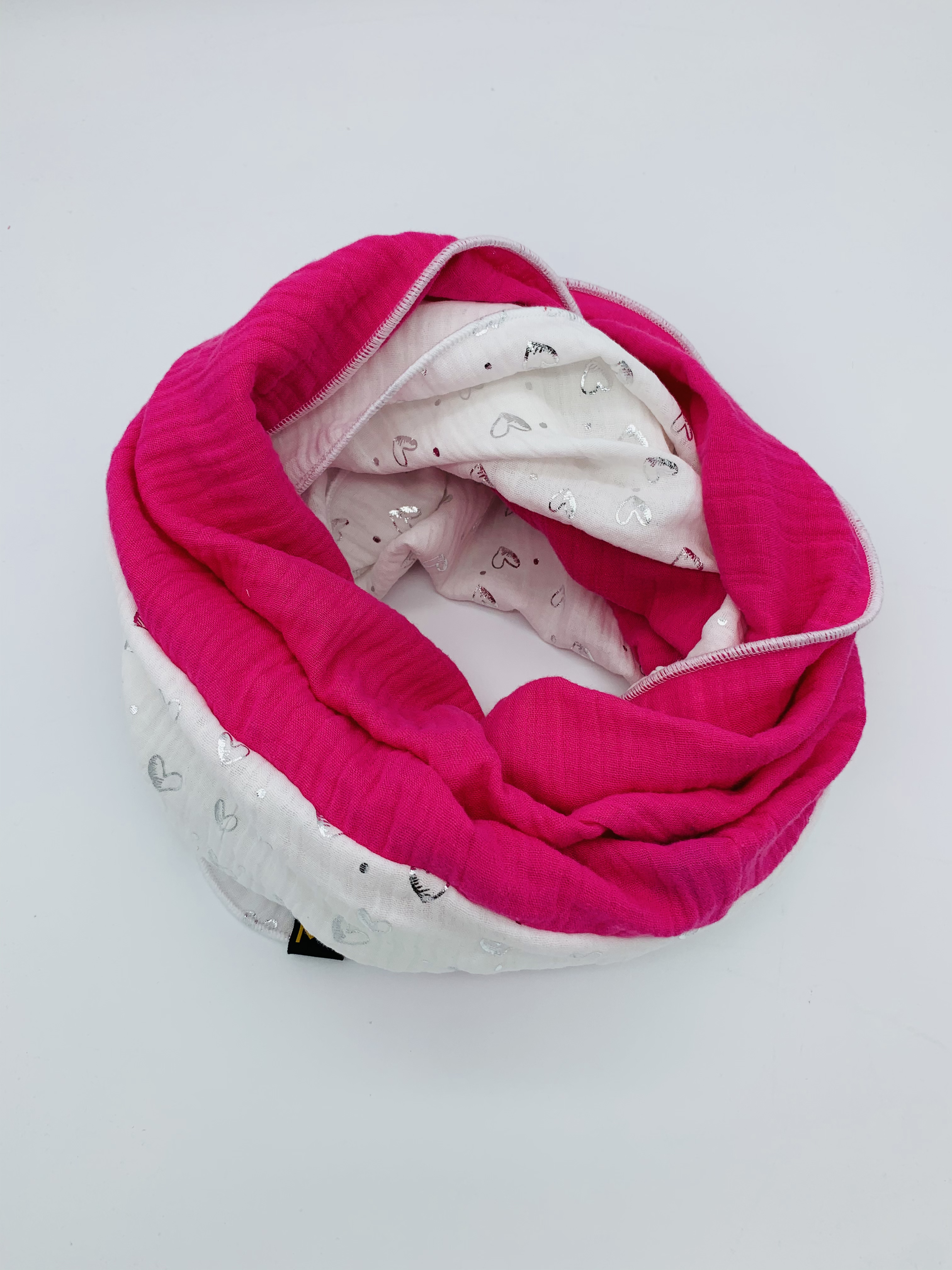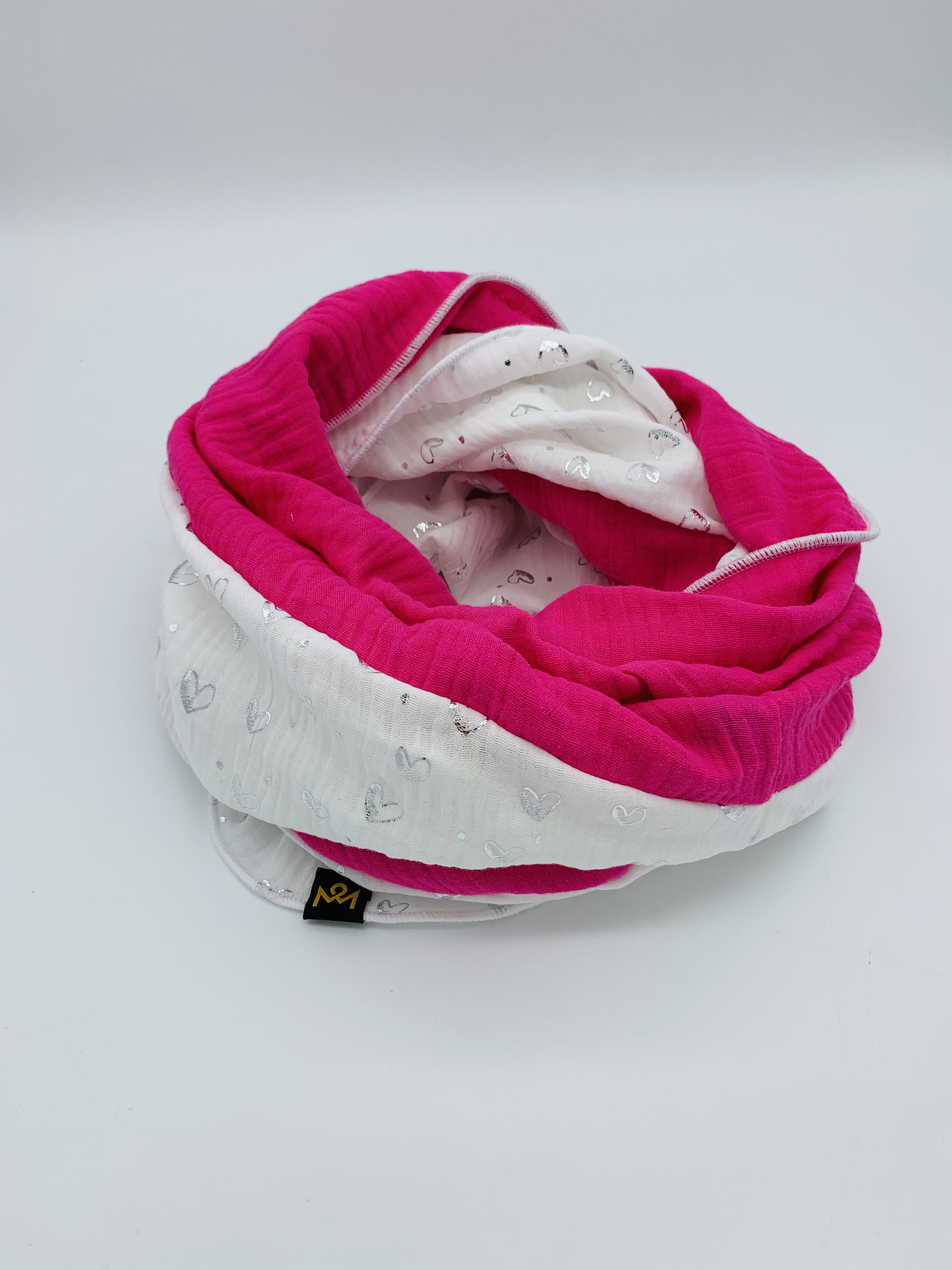 Hochwertiger, doppelt gewebter Schlauchschal aus 100 % Baumwollmusselin in weiß mit silbernen Herzchen und pink.