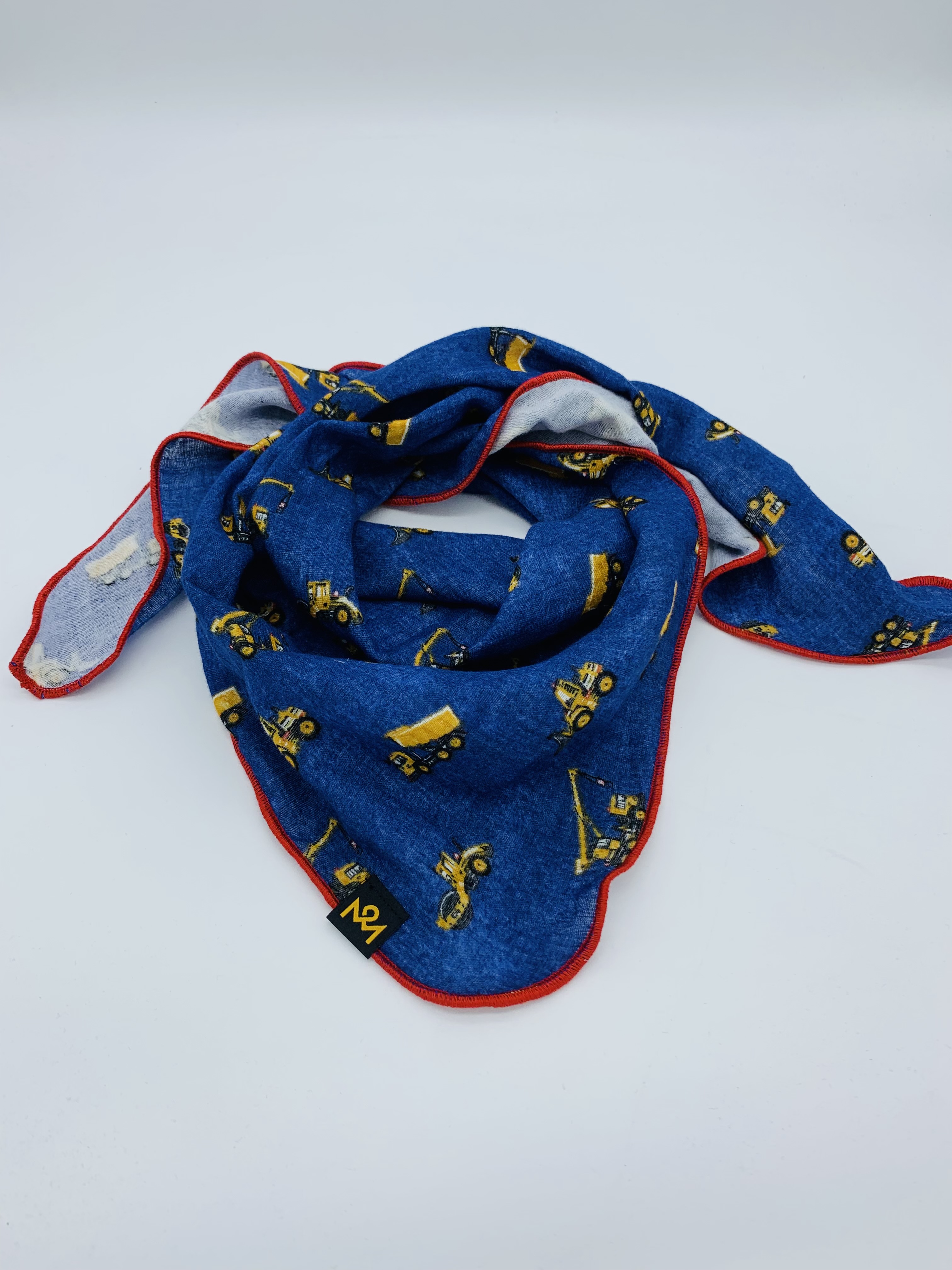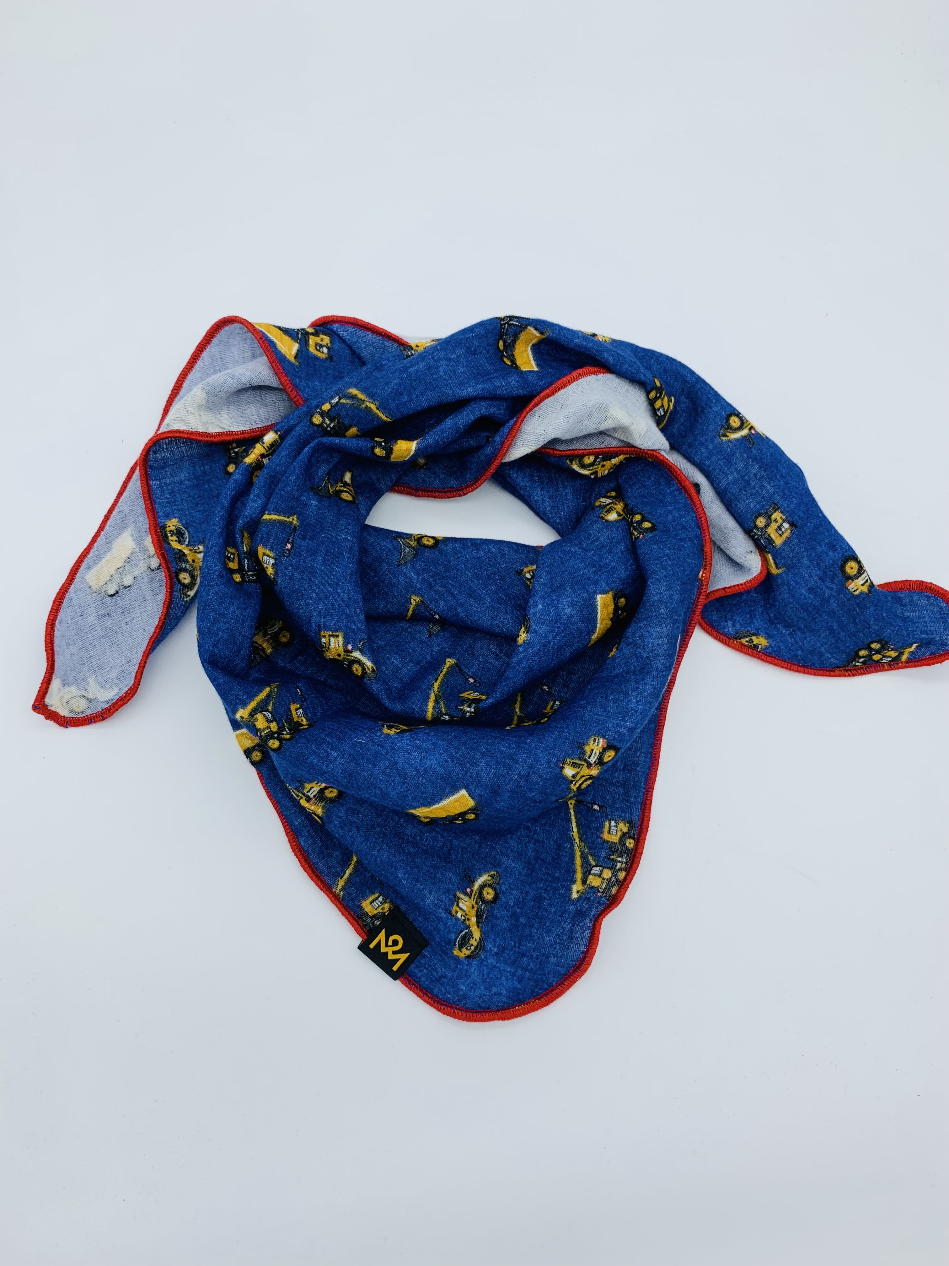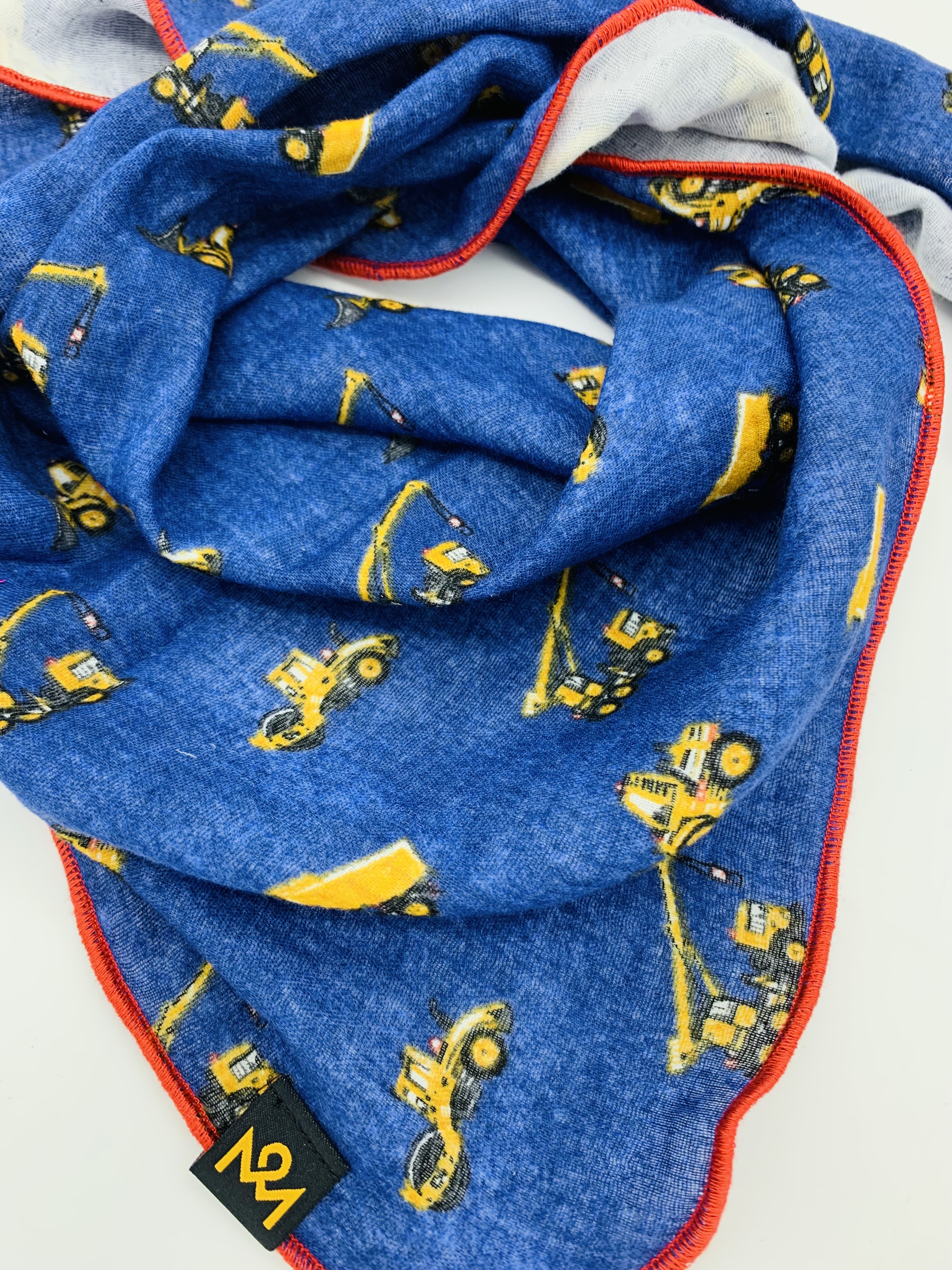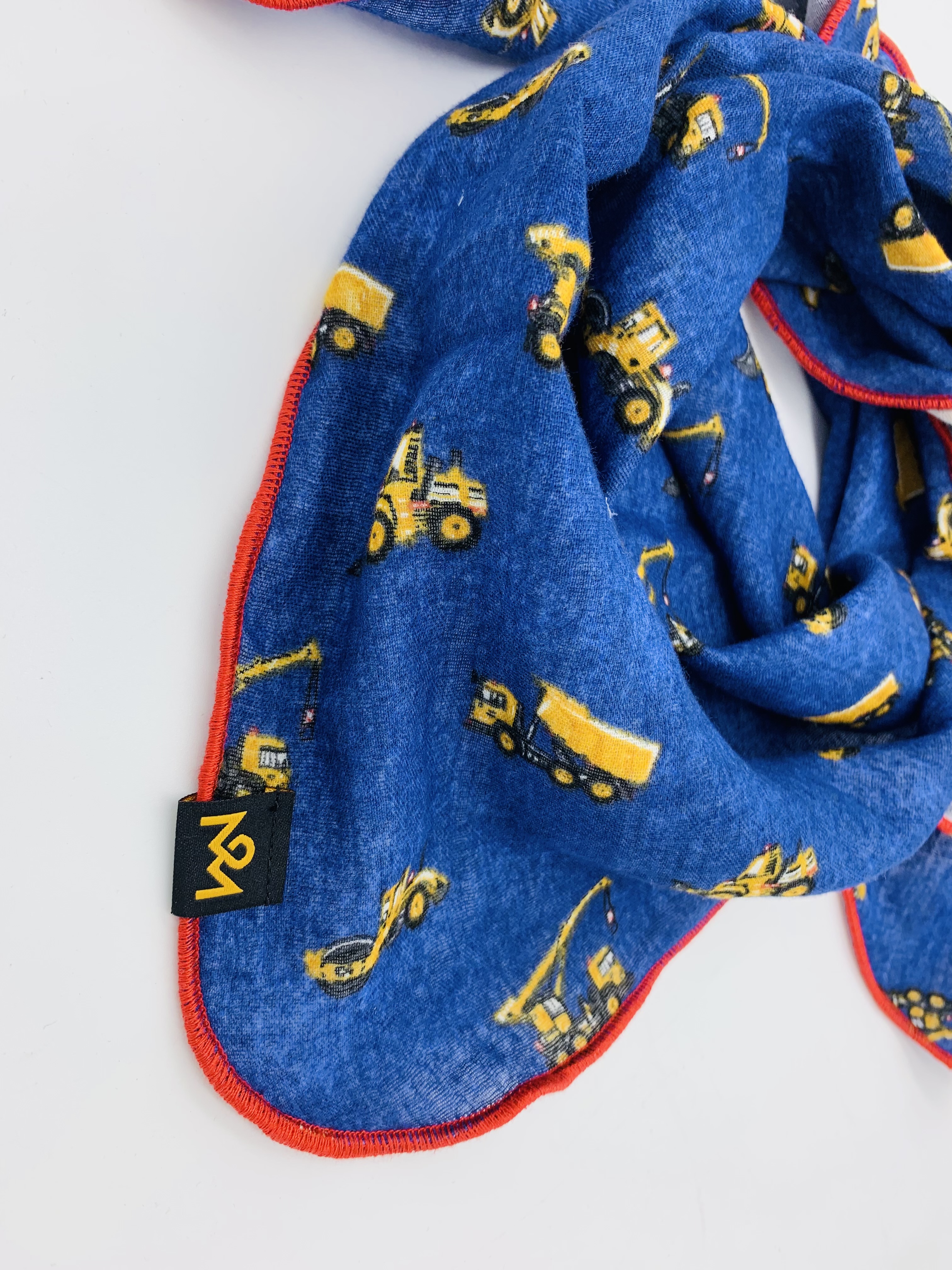 Dieser hochwertige, doppelt gewebte Schal wurde aus 100 % Baumwollmusselin in der Farbe dunkelblau mit gelben Baustellenfahrzeugen