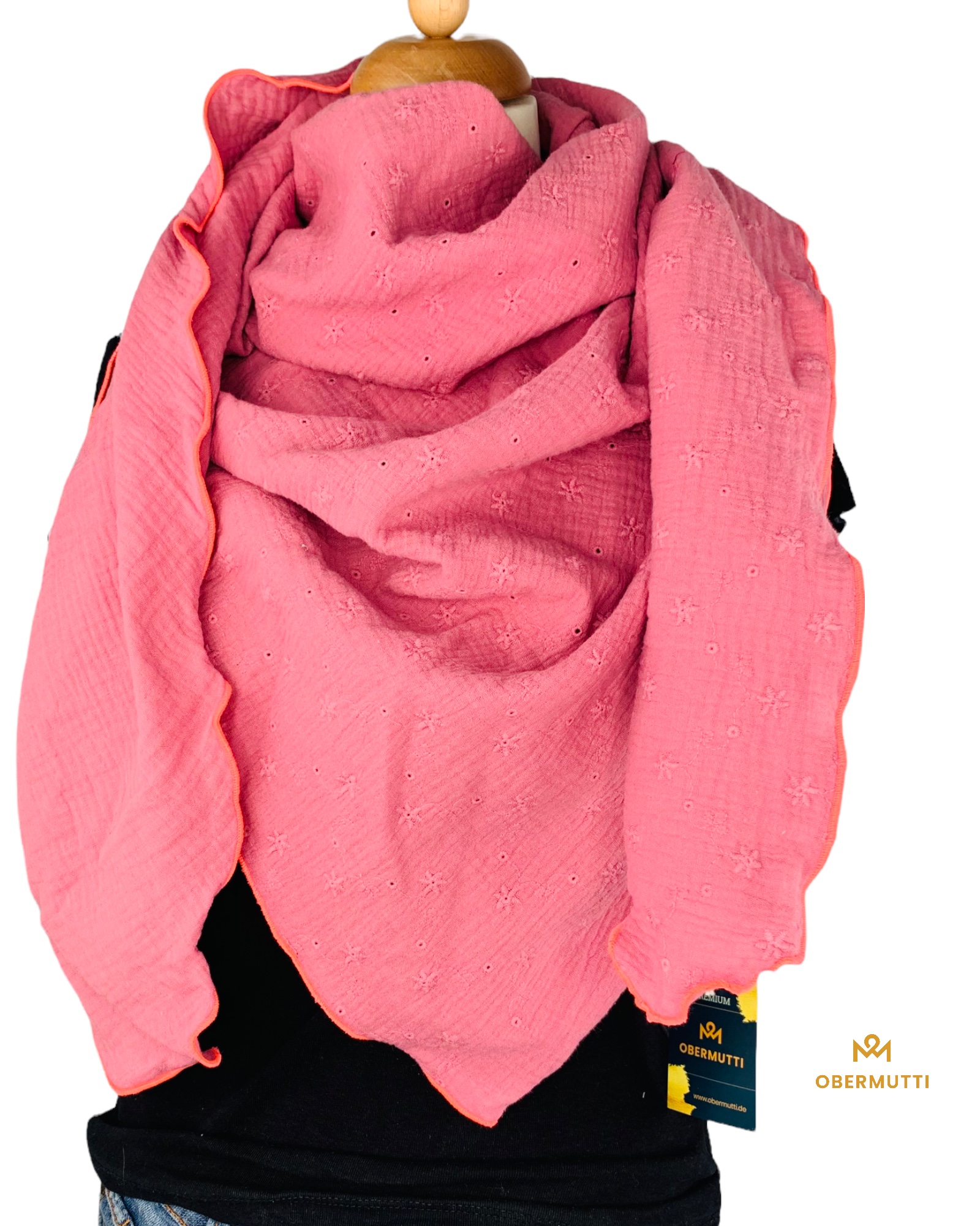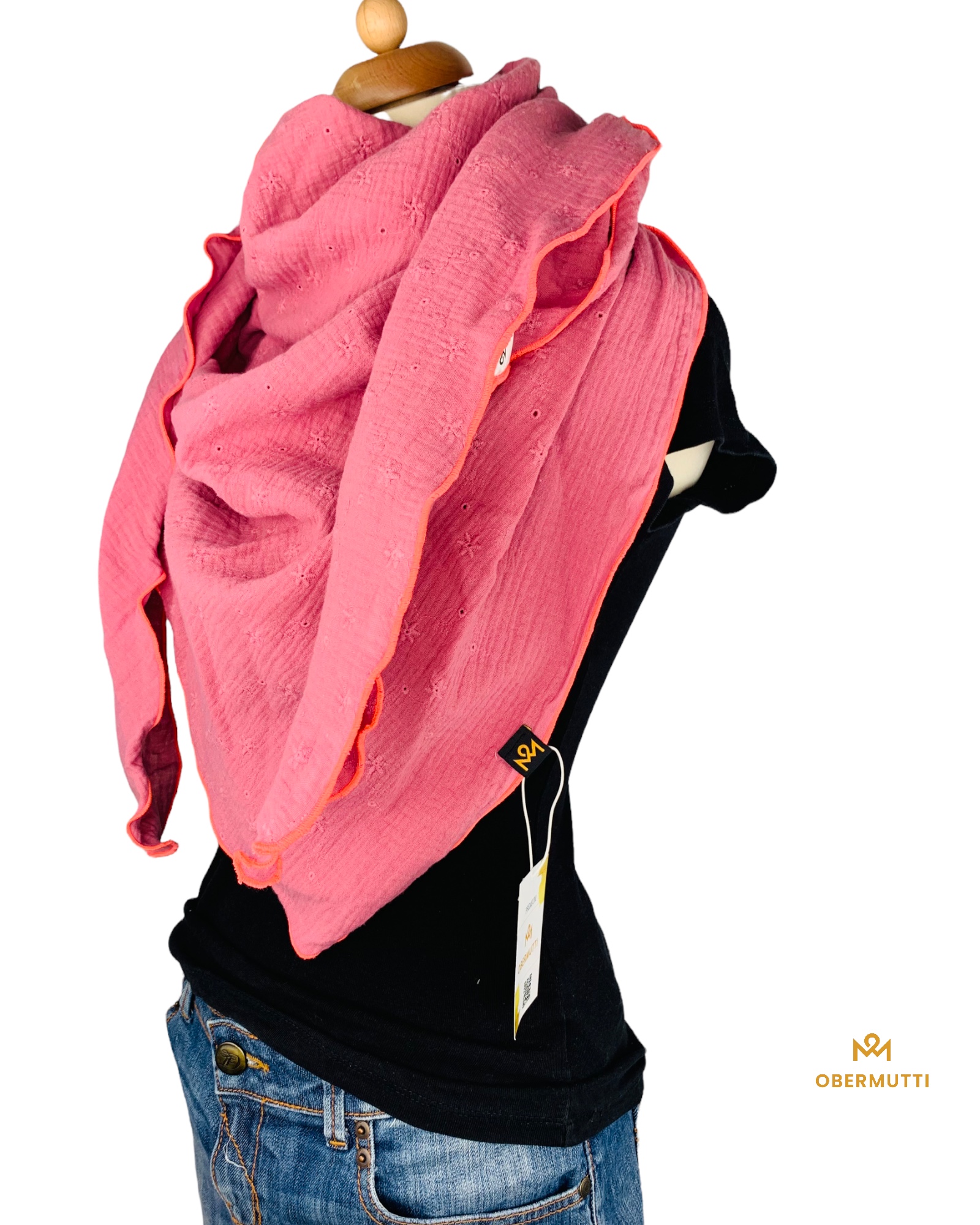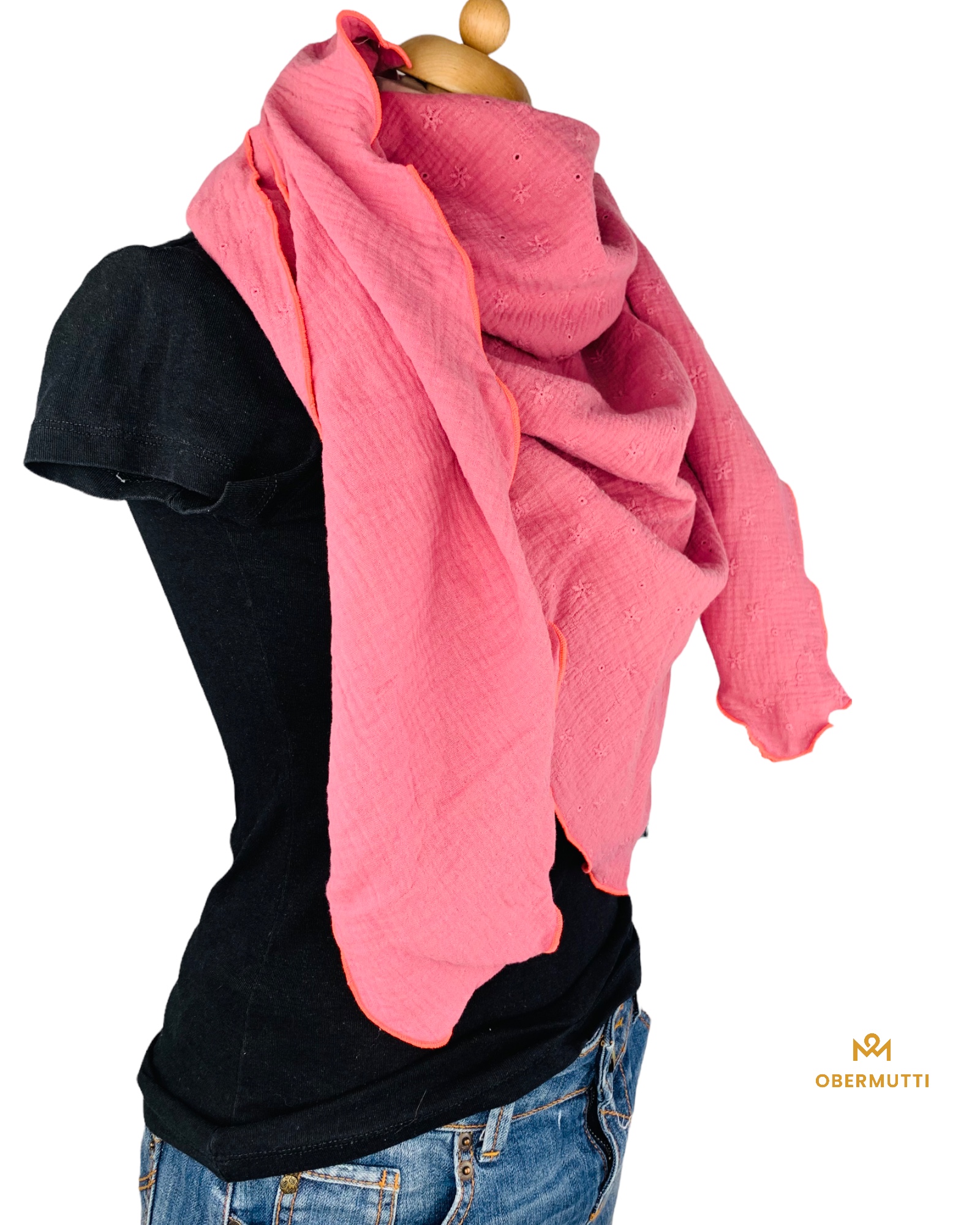 Die Einzigartigkeit des Designs wird durch die Struktur des weichen Baumwollmusselins in Kombination mit der Gewebekante in den Farben "Neonpink" bestimmt.