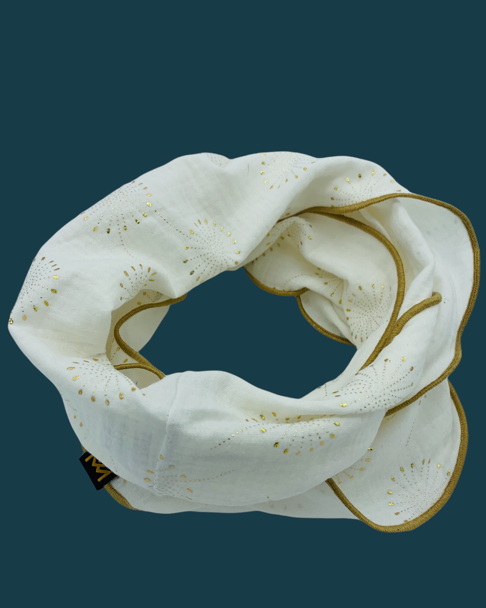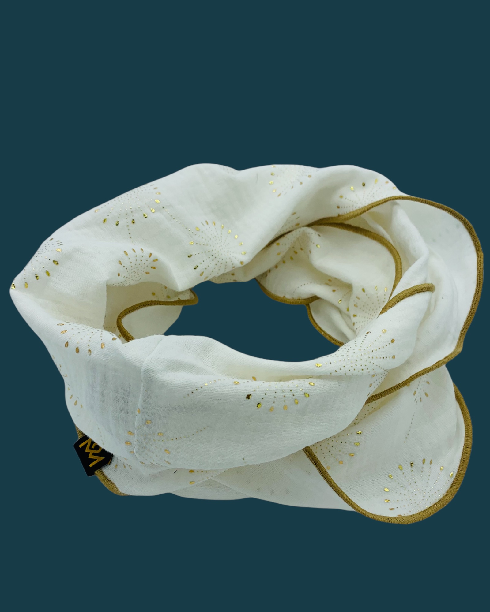 Dieser hochwertige, doppelt gewebte Schlauchschal aus 100% Baumwollmusselin wurde in den Farben "Creme mit goldenen Pusteblumen" gefertigt.