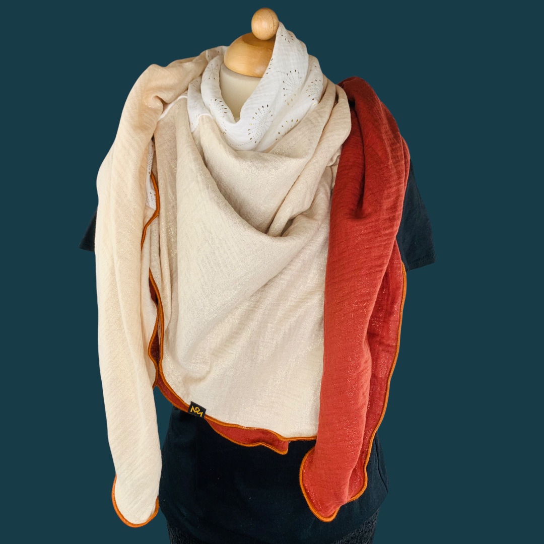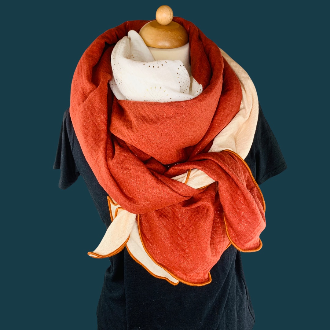 Die Einzigartigkeit des Designs wird durch die Struktur des weichen Baumwollmusselins in Kombination mit der Gewebekante in den Farben "Rostrot" bestimmt.