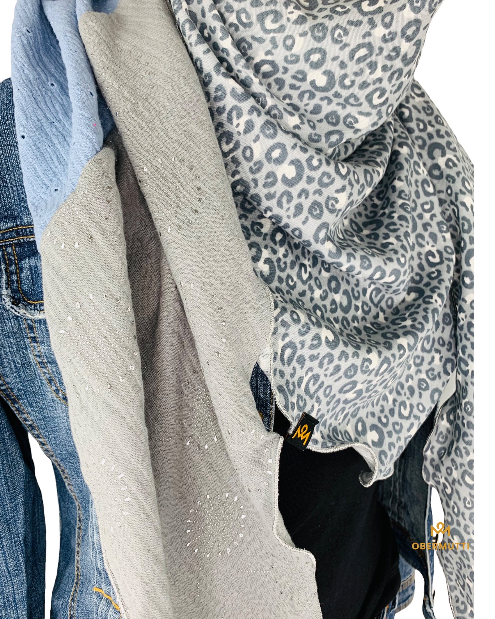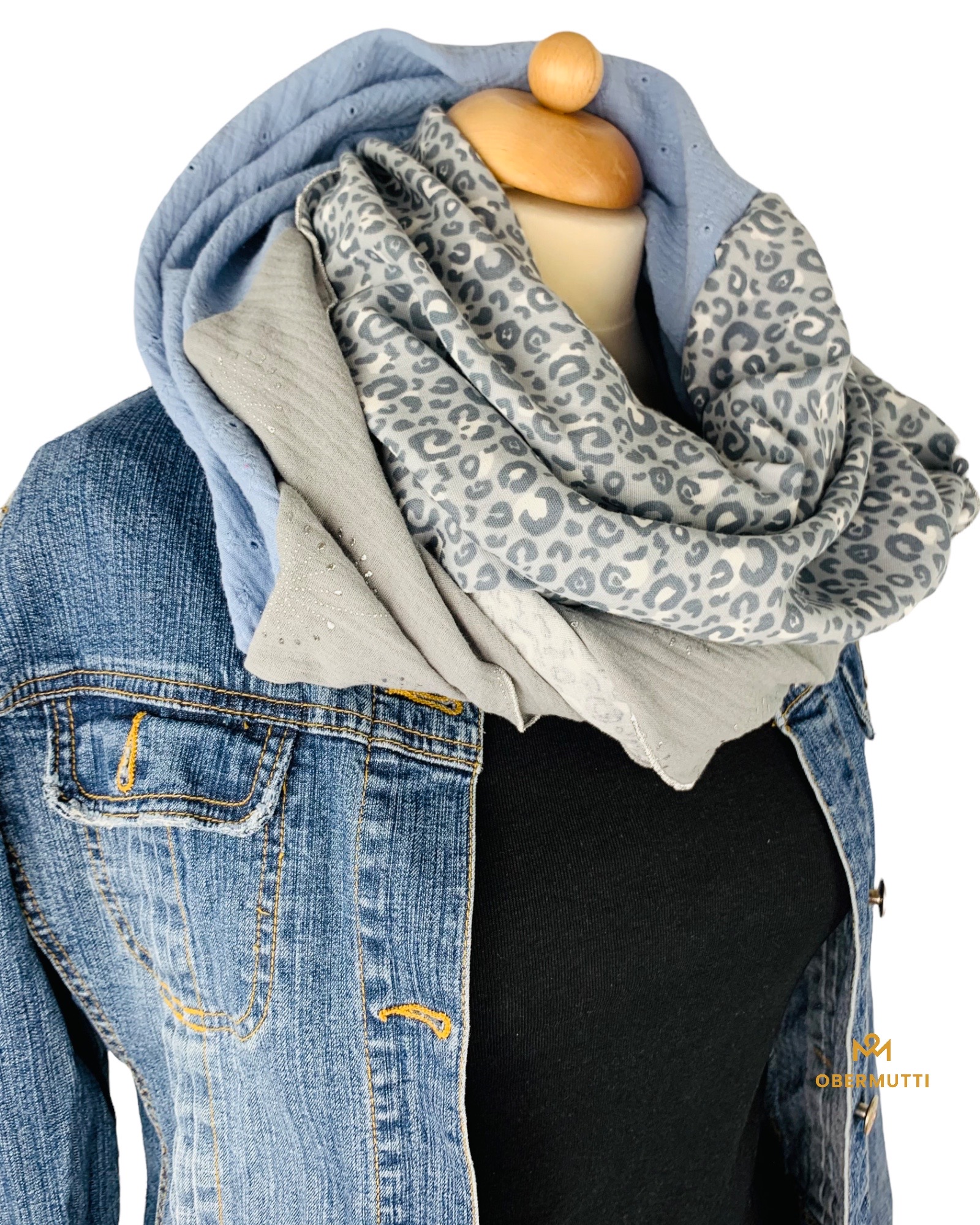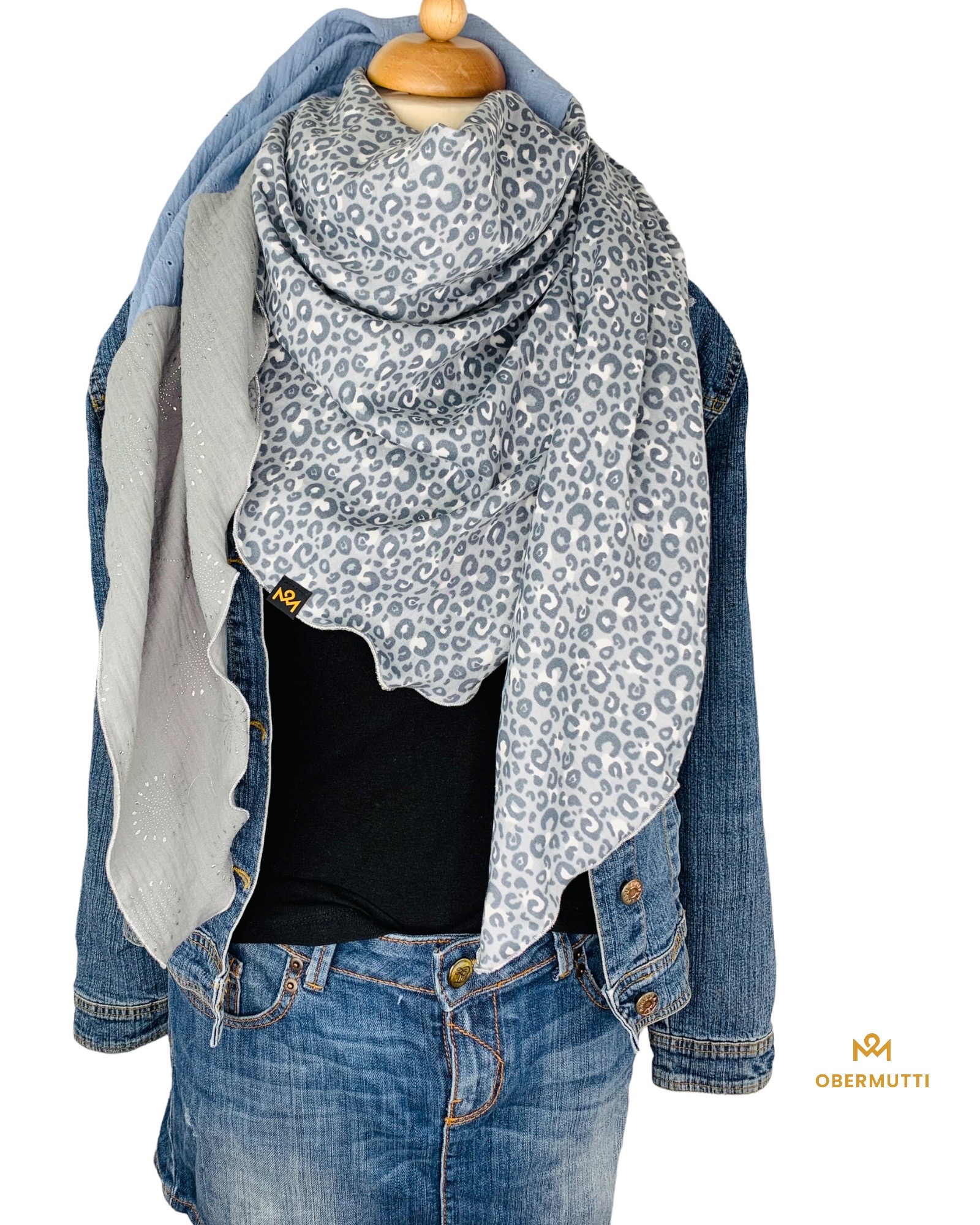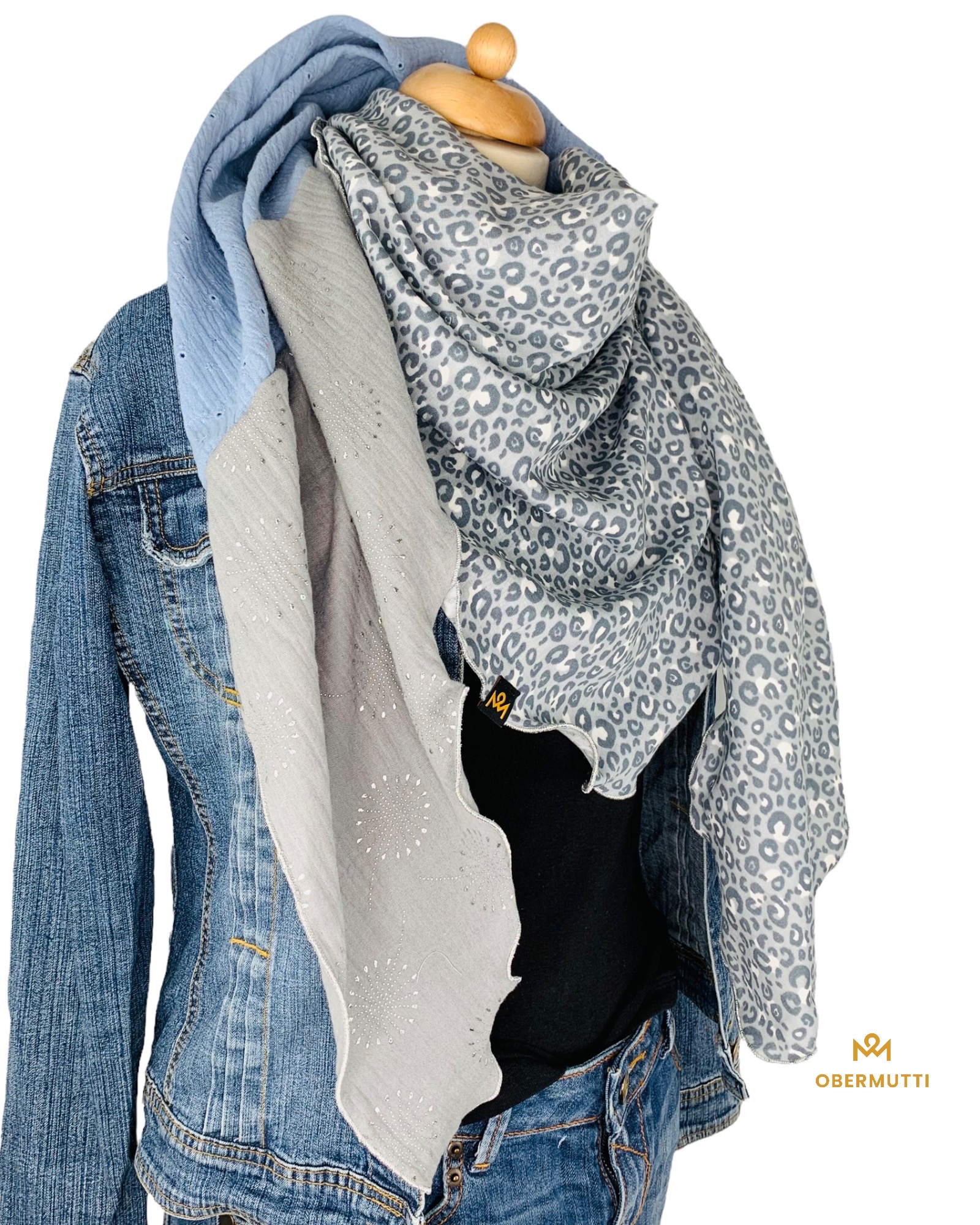Farben: Grau mit Pusteblumen, Hellblau Lochstickerei und Grau Leoprint