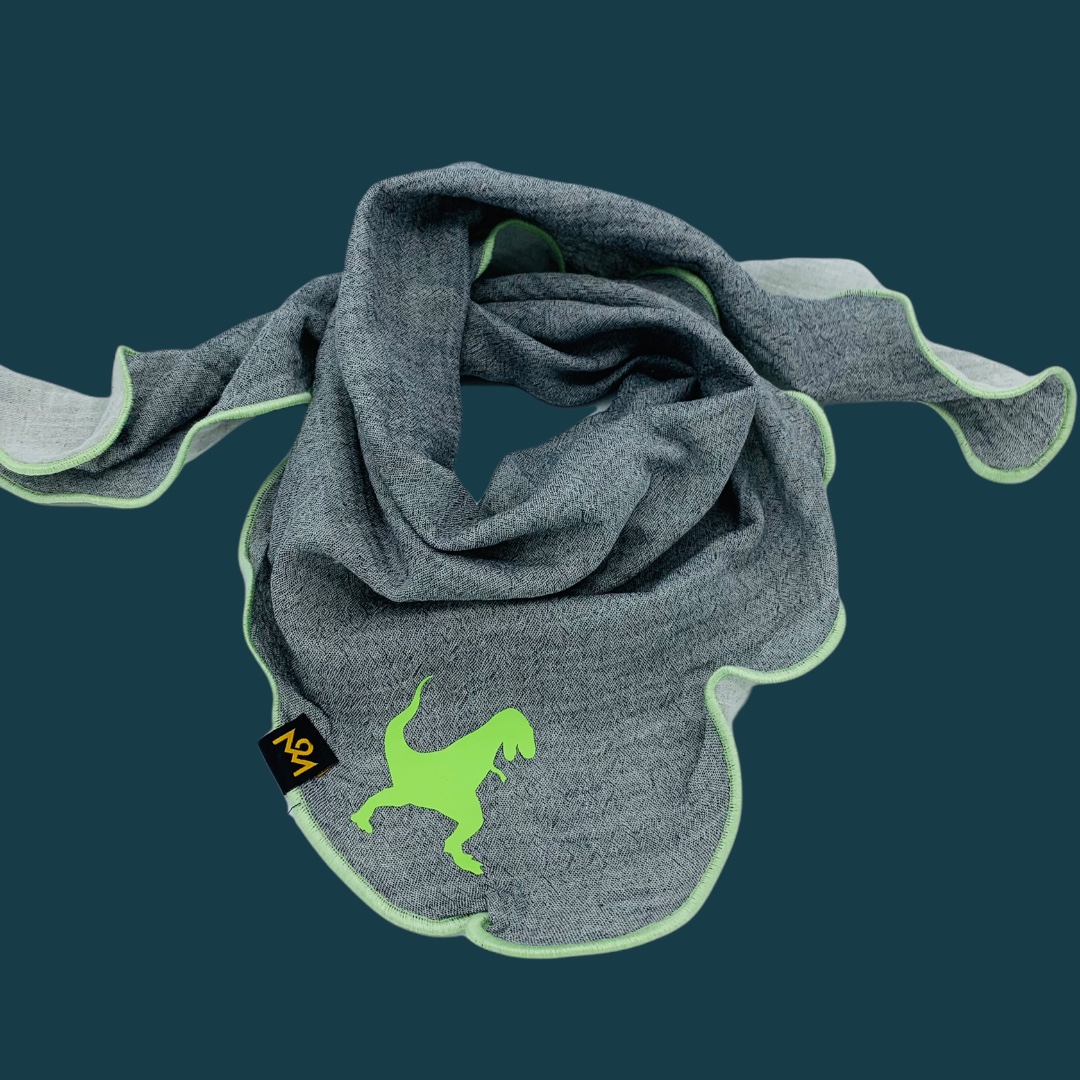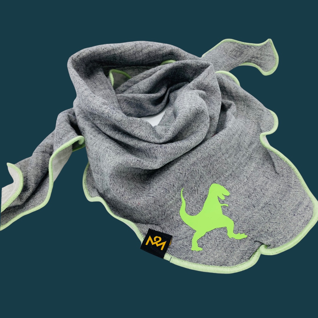 Dieses hochwertige, doppelt gewebte Tuch aus 100% Baumwollmusselin wurde in den Farben "Jeansgrau mit grünem Dino" gefertigt.
