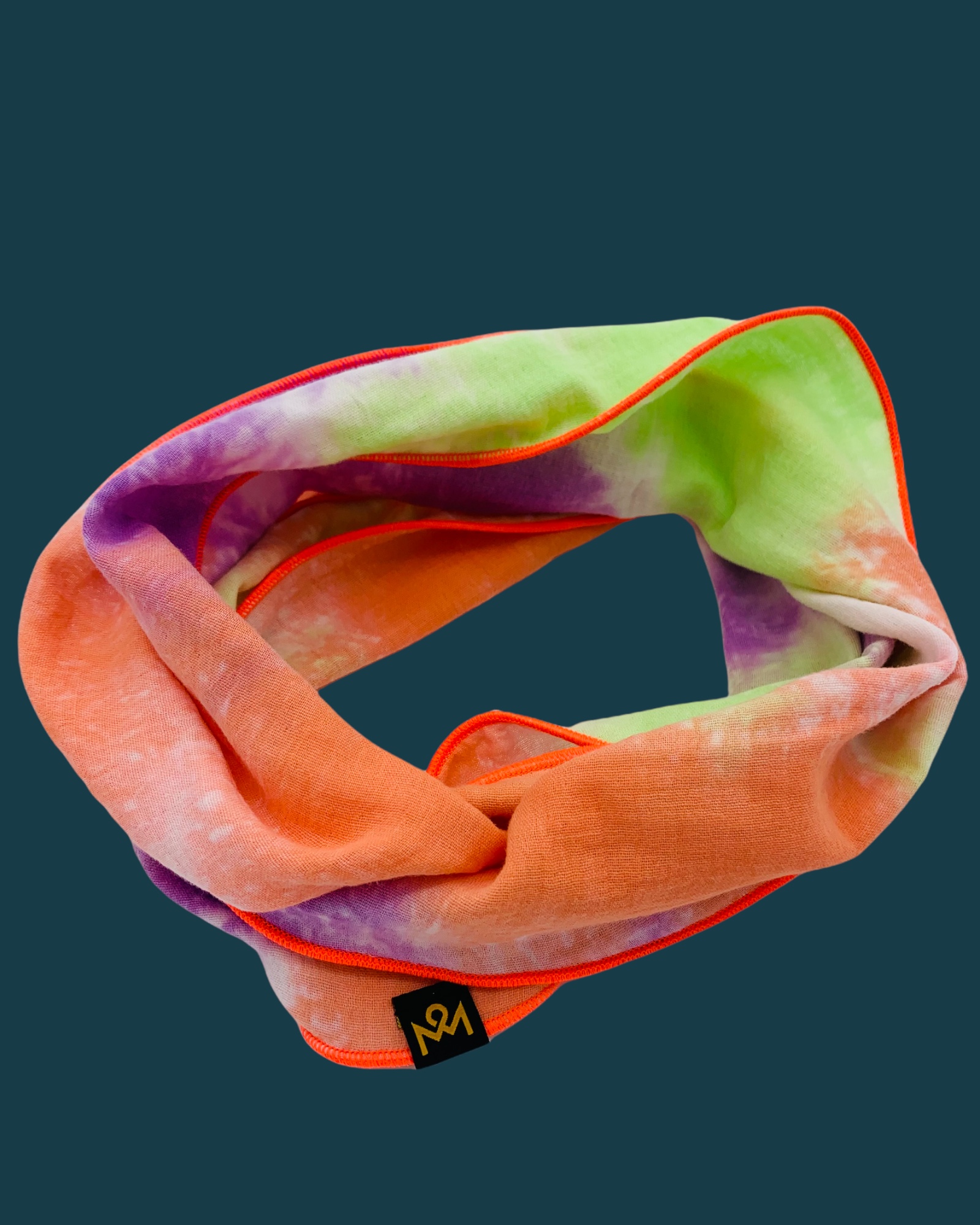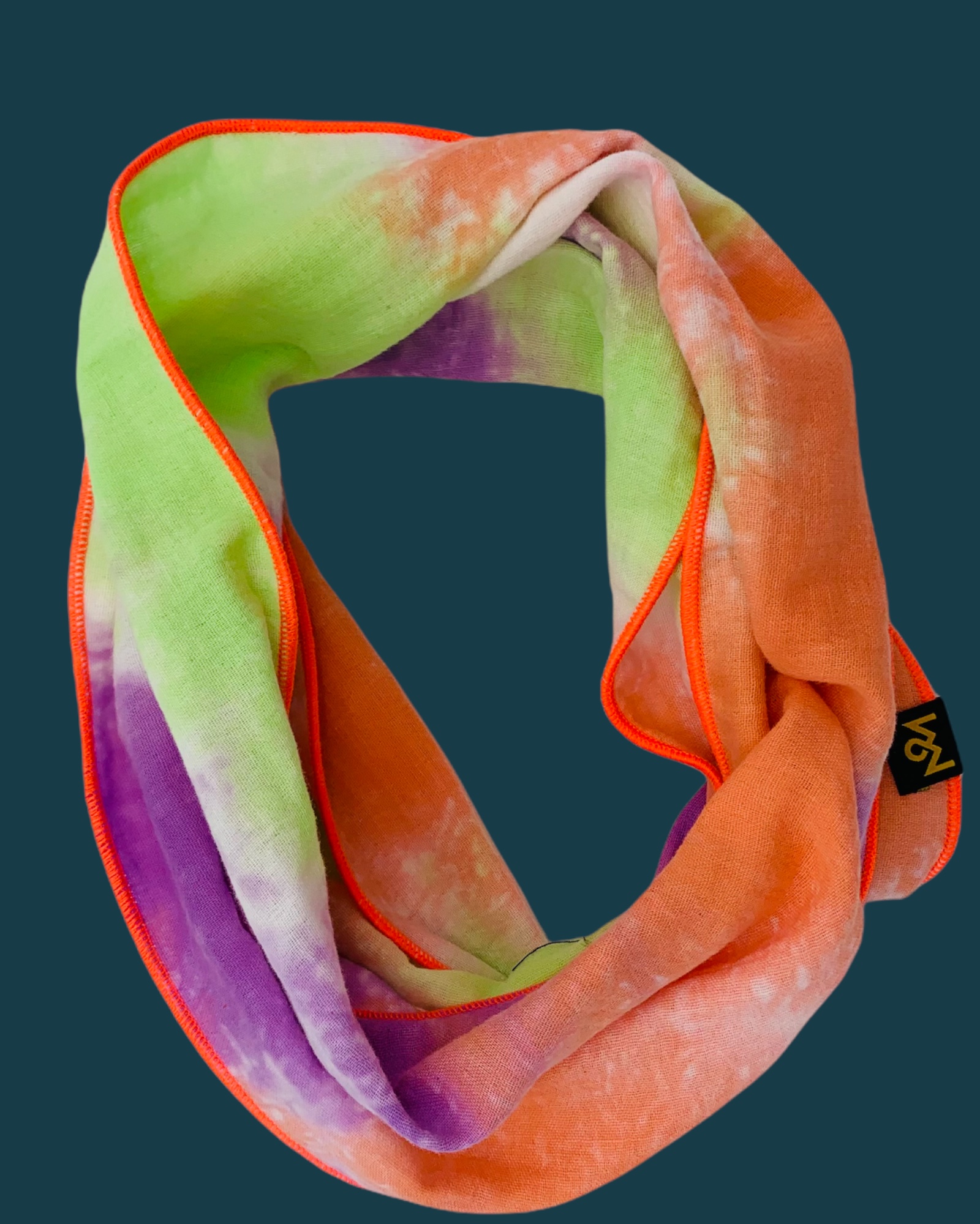 Dieser hochwertige, doppelt gewebte Schlauchschal aus 100% Baumwollmusselin wurde in den Farben "Lila, Orange, Grün Batik" gefertigt.