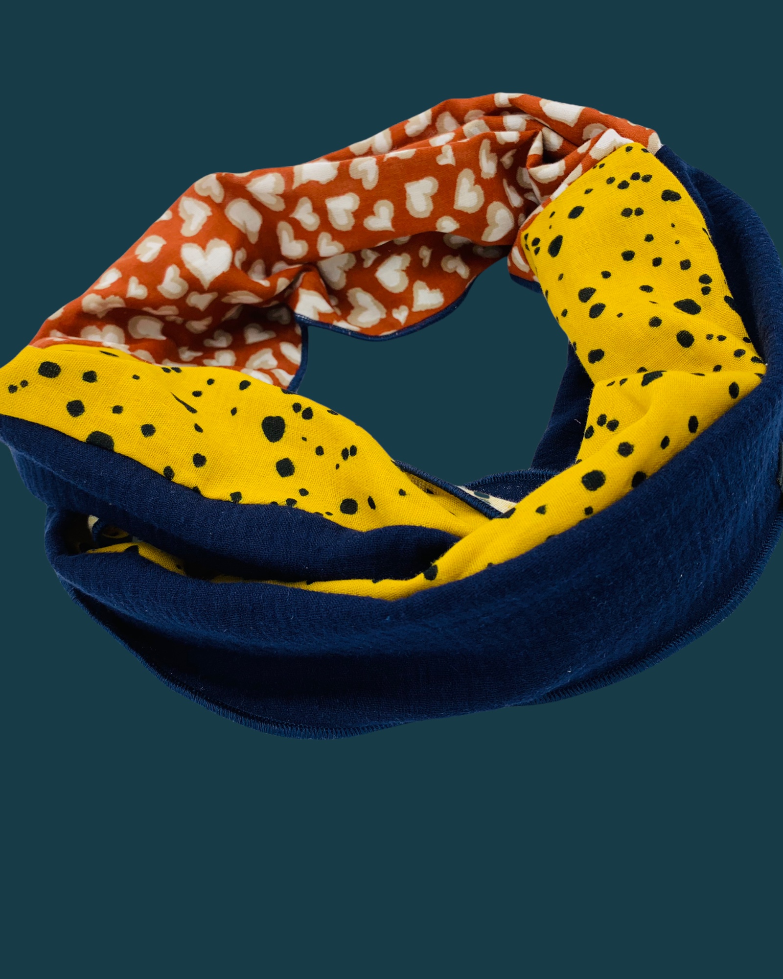 "Marineblau, Gelb mit roten Punkten und Rostrot mit Leoprint" gefertigt.