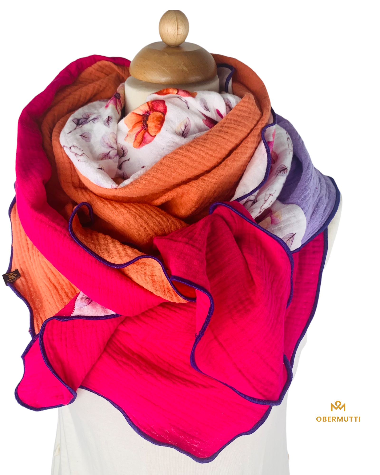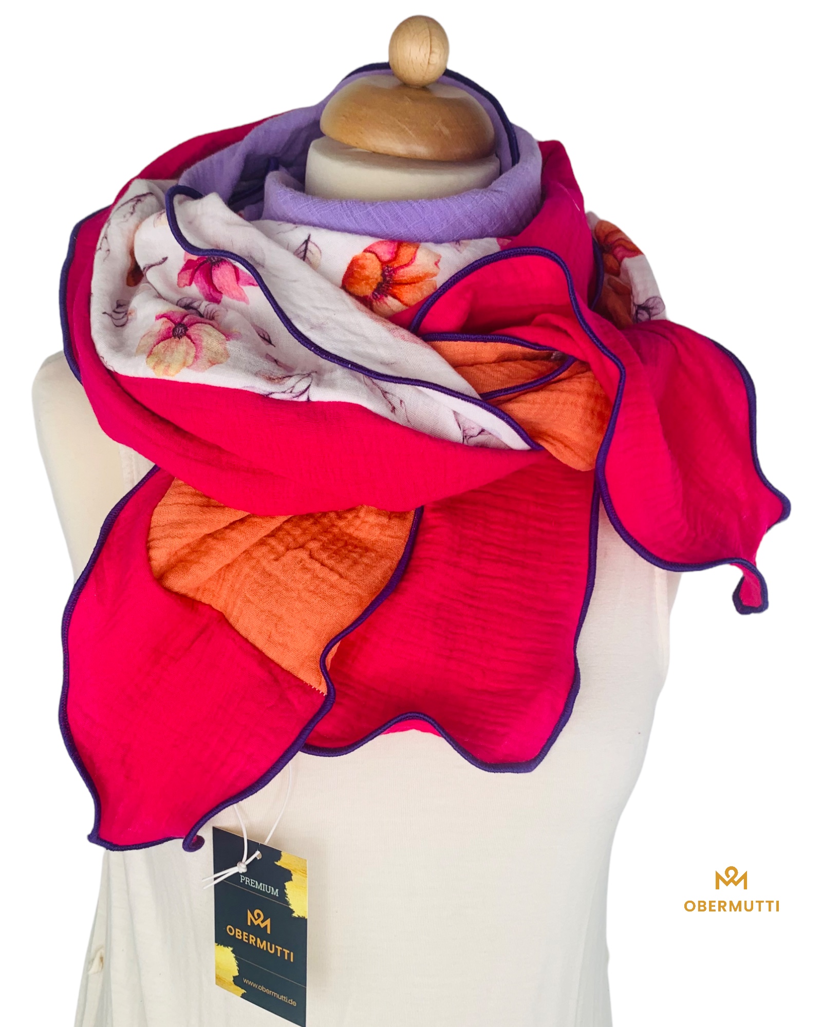 Der Schal besteht aus einem glatten, lockeren und feinfädigen Musselinbaumwollstoff.