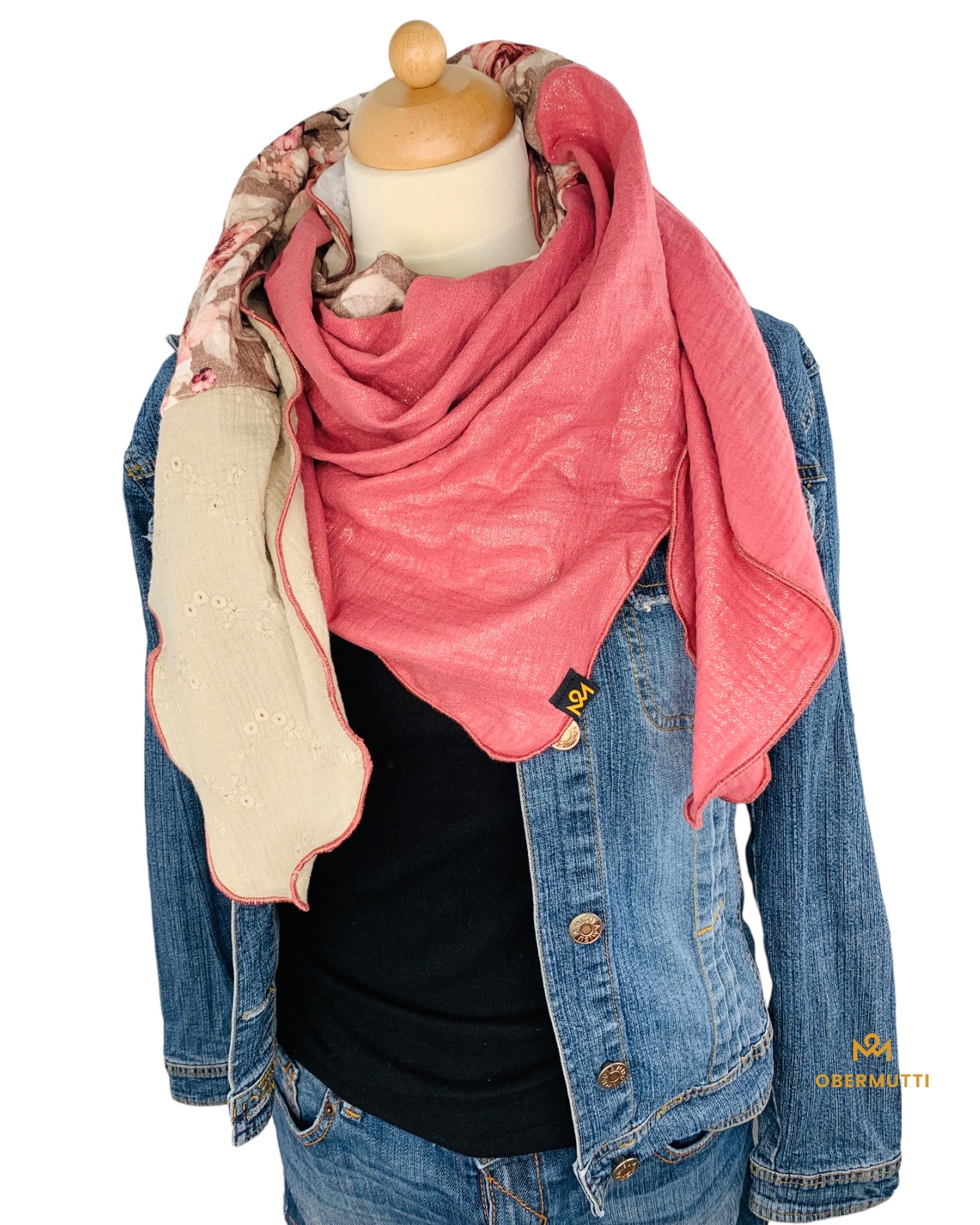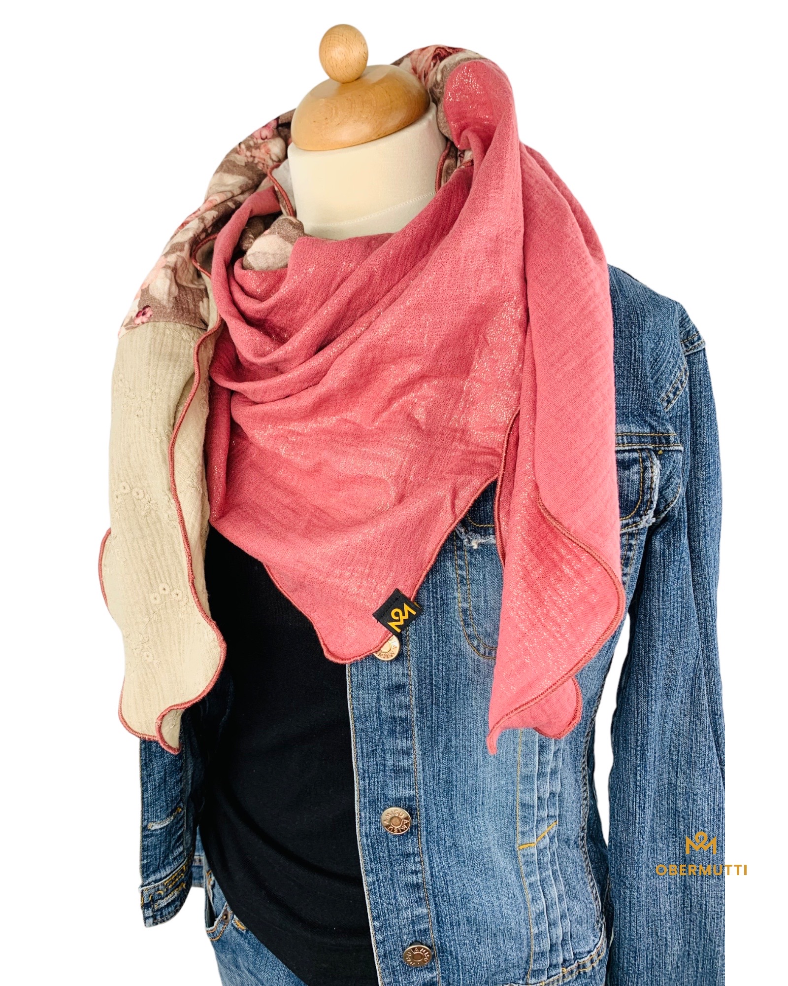 Die Einzigartigkeit des Designs wird durch die Struktur des weichen Baumwollmusselins in Kombination mit der Gewebekante in den Farben "Altrosa" bestimmt.