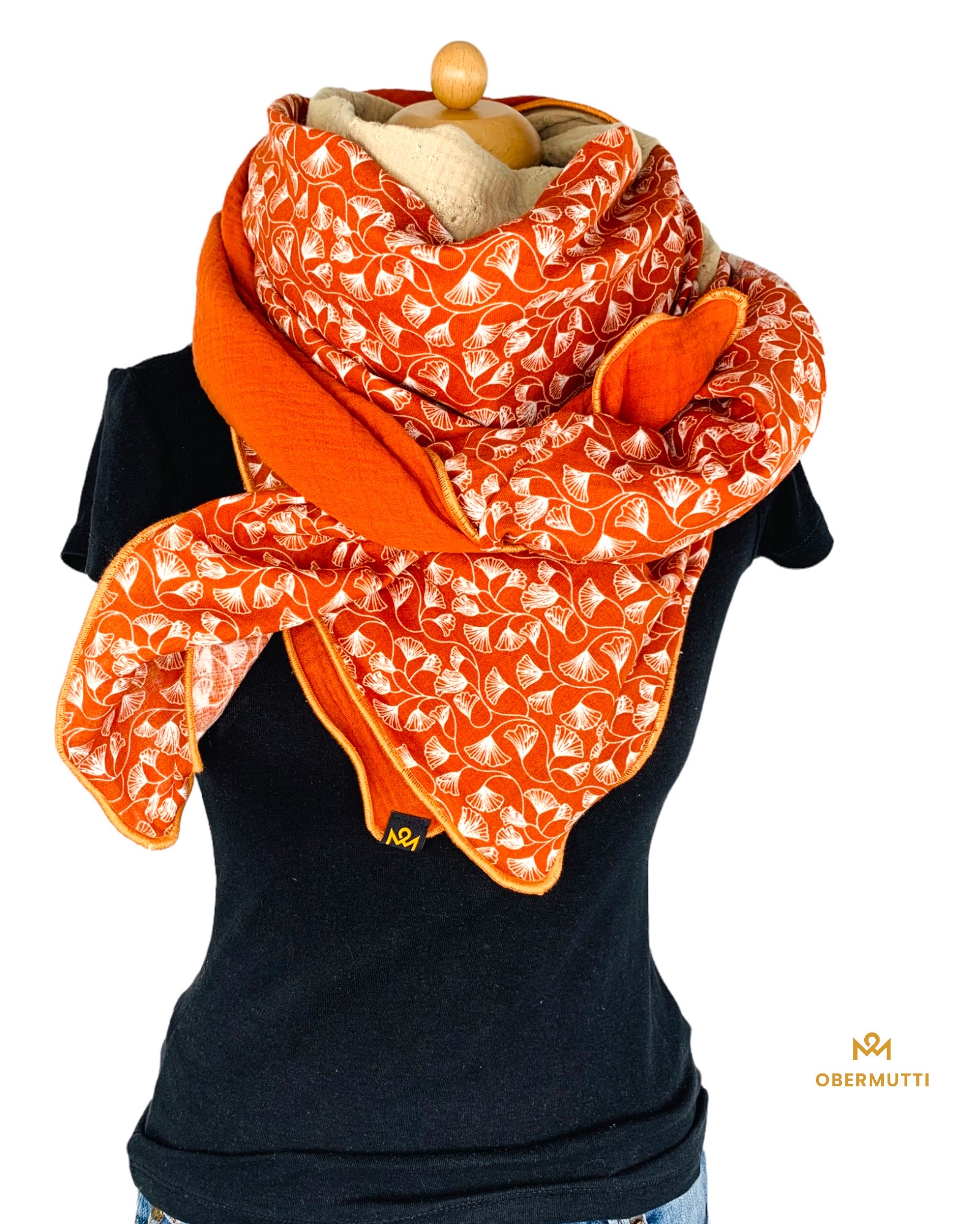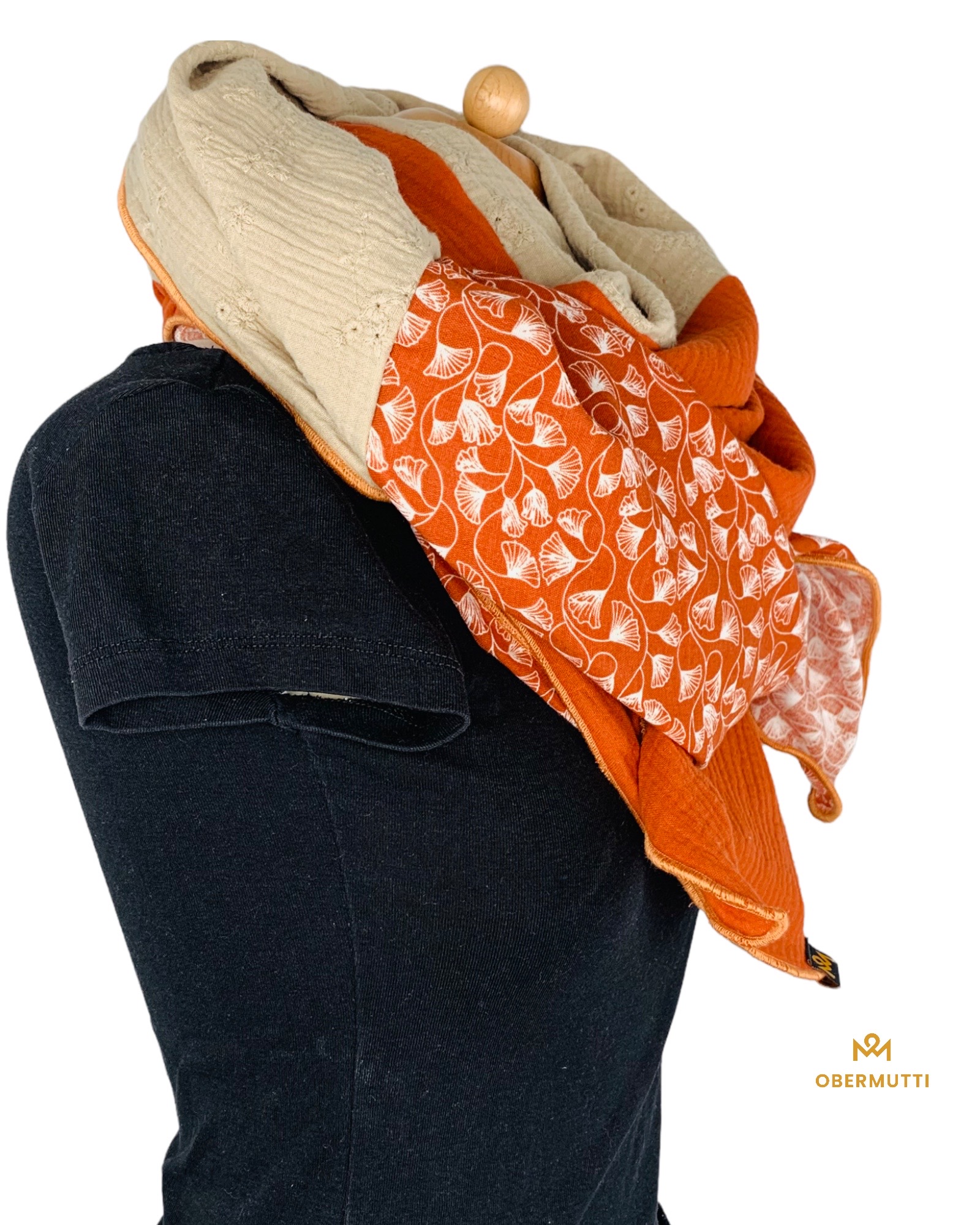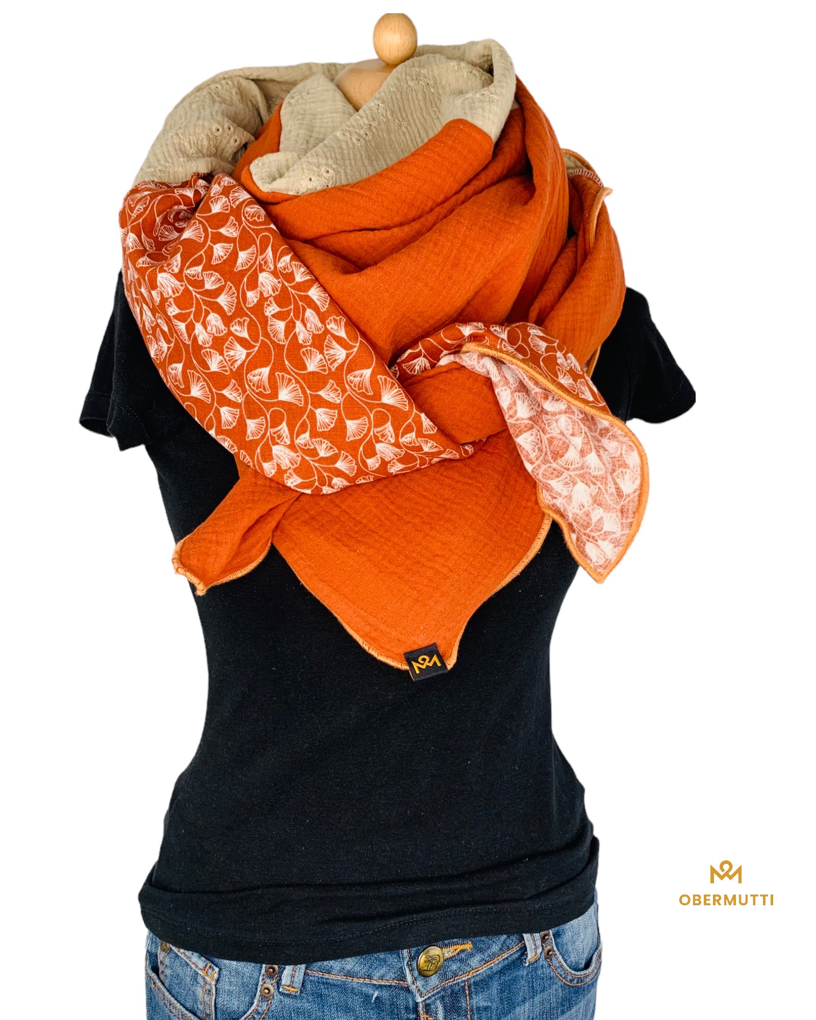 Die Einzigartigkeit des Designs wird durch die Struktur des weichen Baumwollmusselins in Kombination mit der Gewebekante in der Farbe "Rostrot" bestimmt.