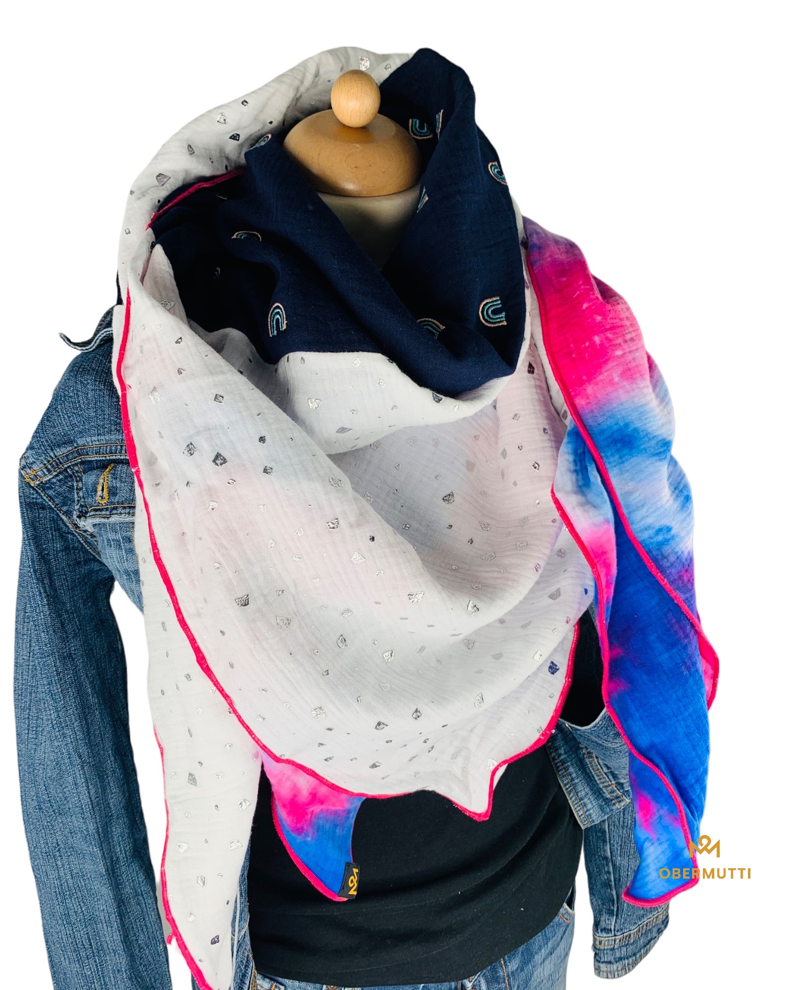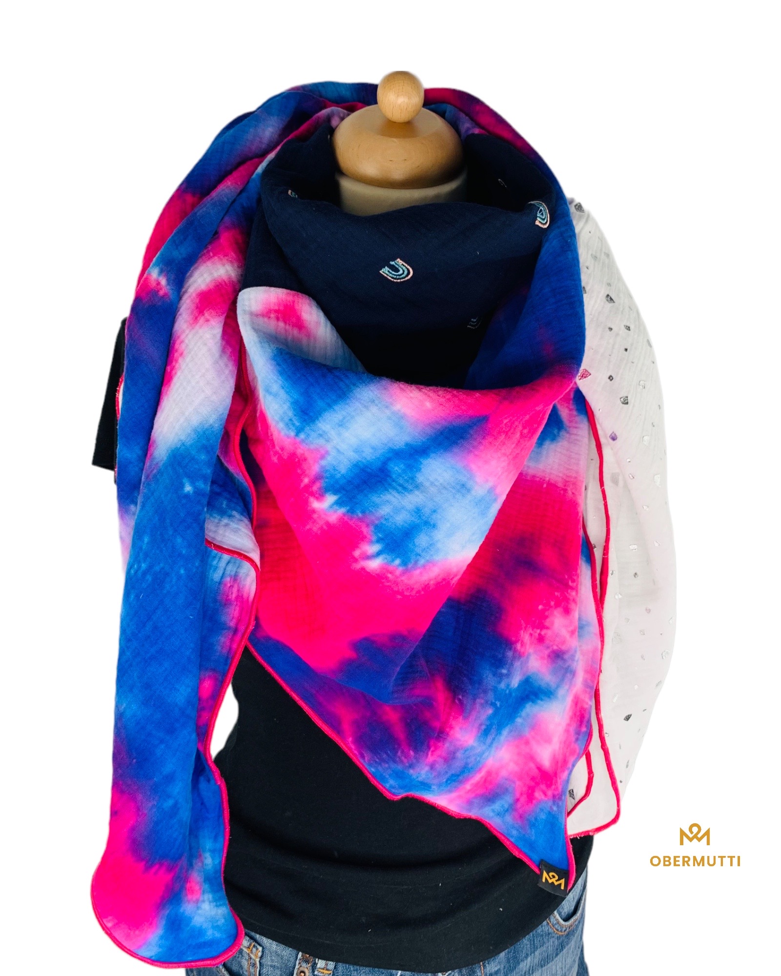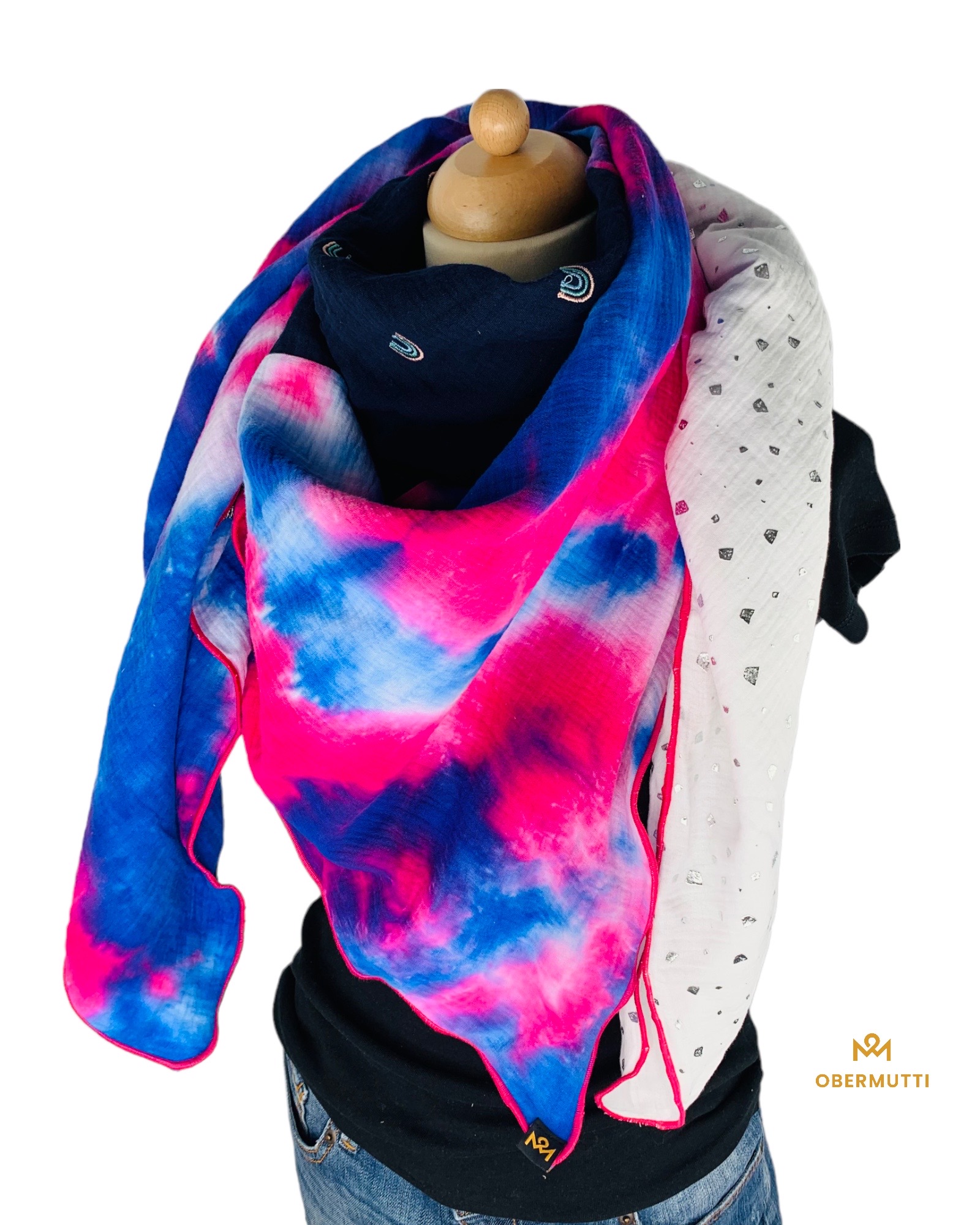 Farbe: Weiß Glitzerflakes, Dunkelblau mit Stickerei und Batik in Blau und Pink