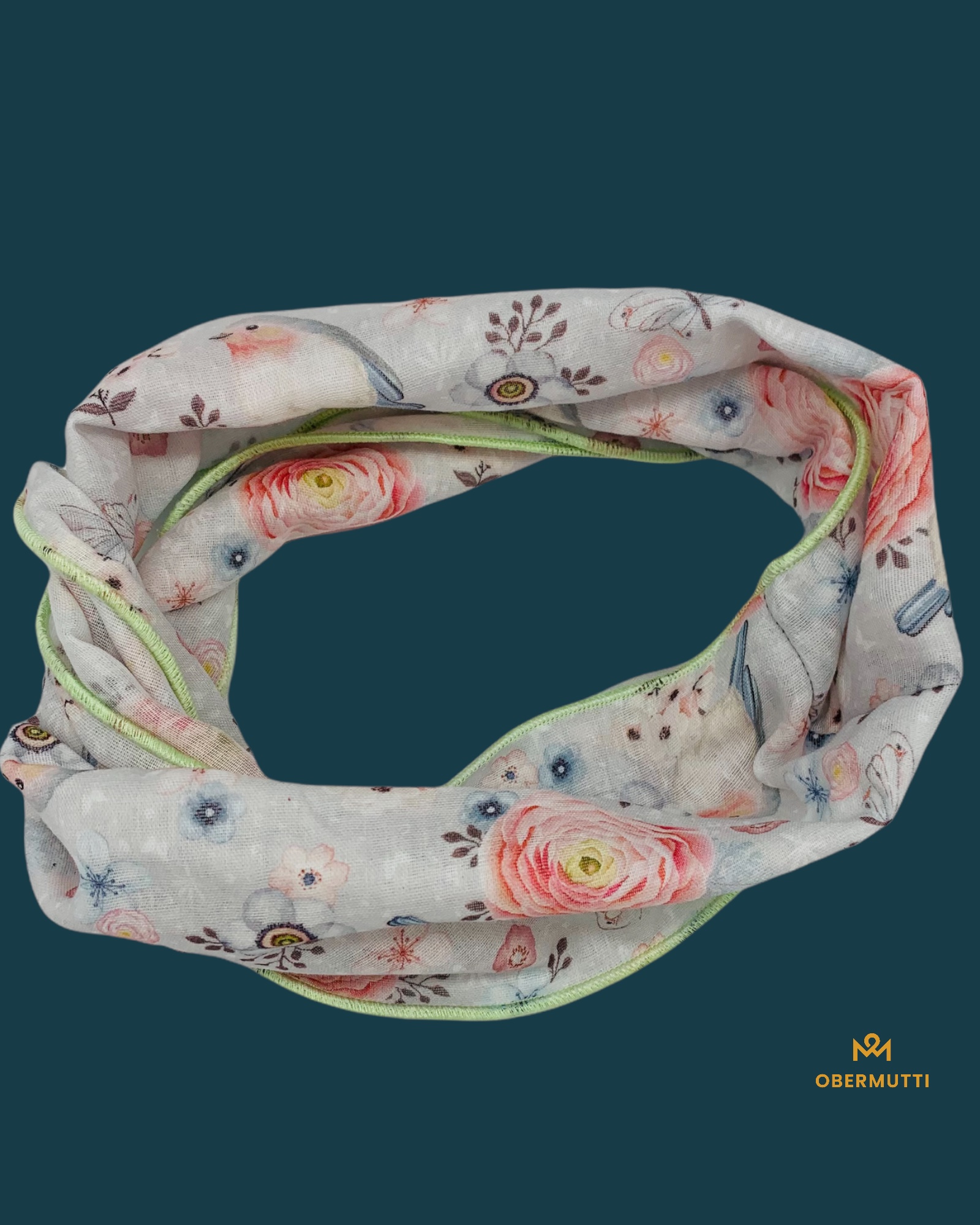 Dieser hochwertige, doppelt gewebte Schlauchschal aus 100% Baumwollmusselin wurde in den Farben "Weiß mit Blüten- und Vogelprint" gefertigt.