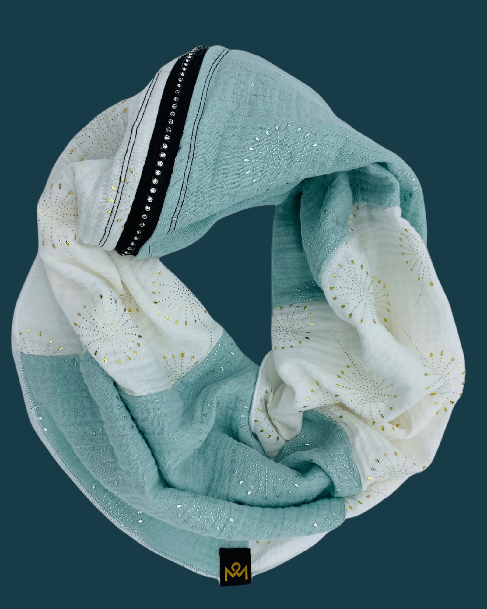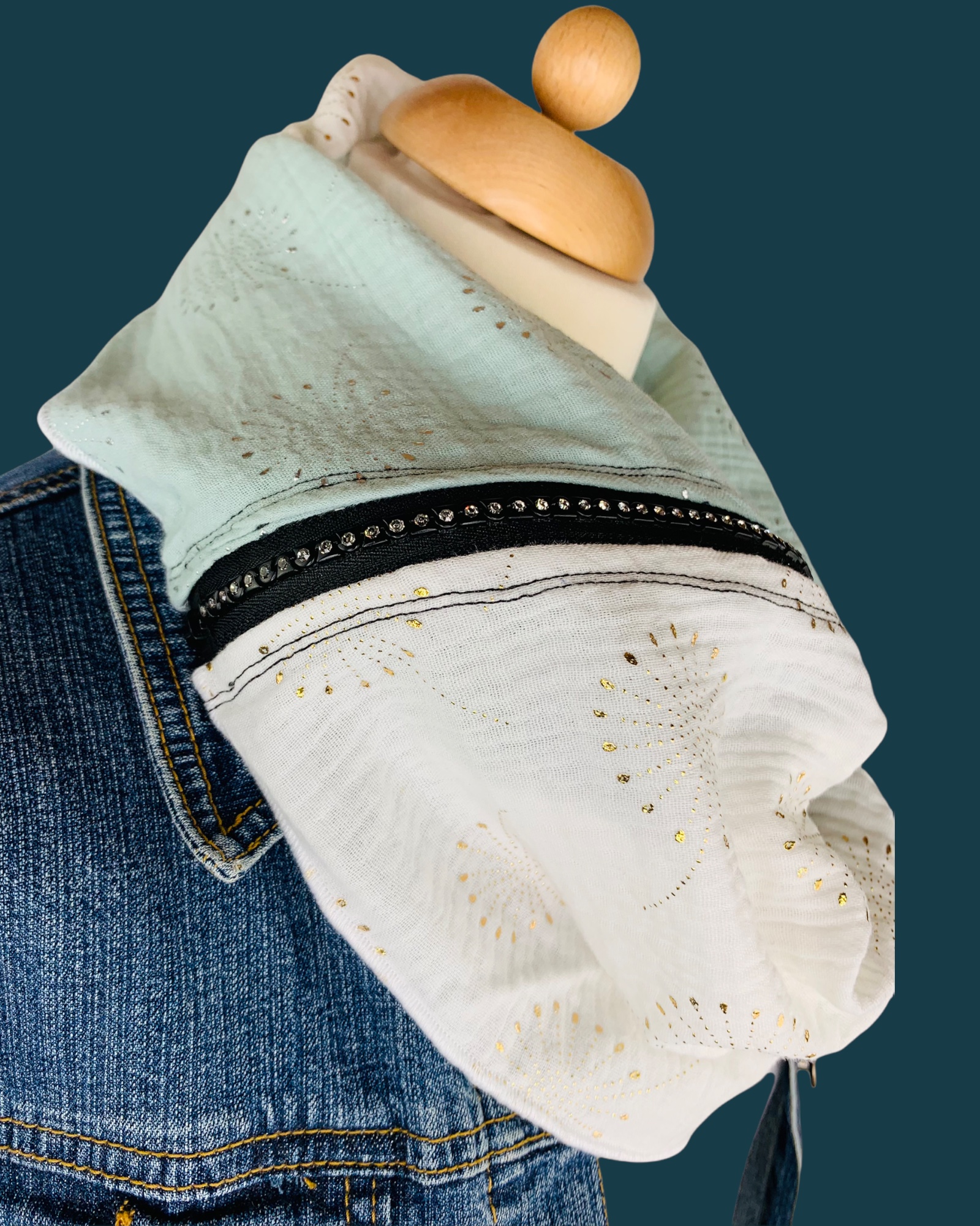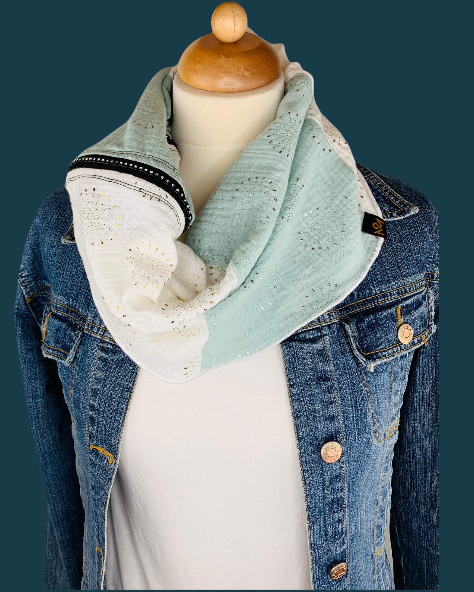Dieser Schal wurde mit einem Verschluss mit funkelnden Steinchen versehen. Er besteht aus zwei Seitenteilen und einem silberfarbigen Schieber mit diesem der Schal geschlossen und / oder vergrößert werden kann. Dieser Schal kann kann mit weiteren „OM Diamonds“ Schals kombiniert werden. Somit kann der Schal individuell für das Outfit angepasst werden. Der Wahnsinn!