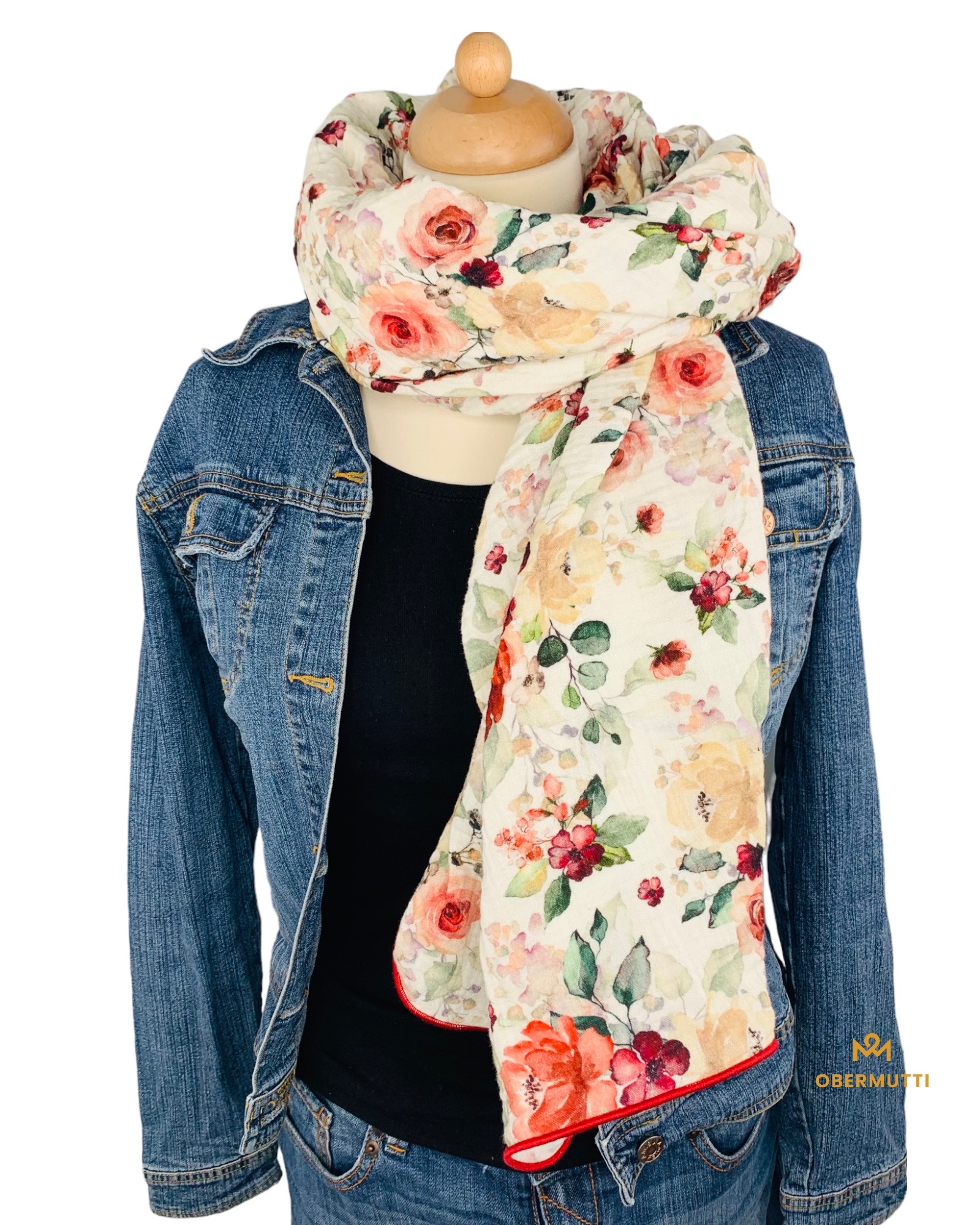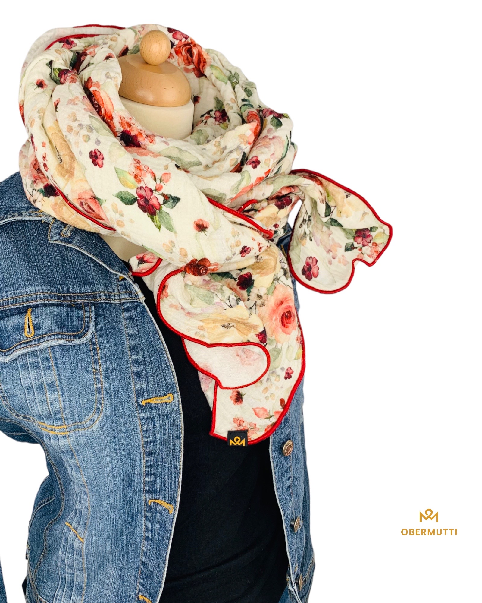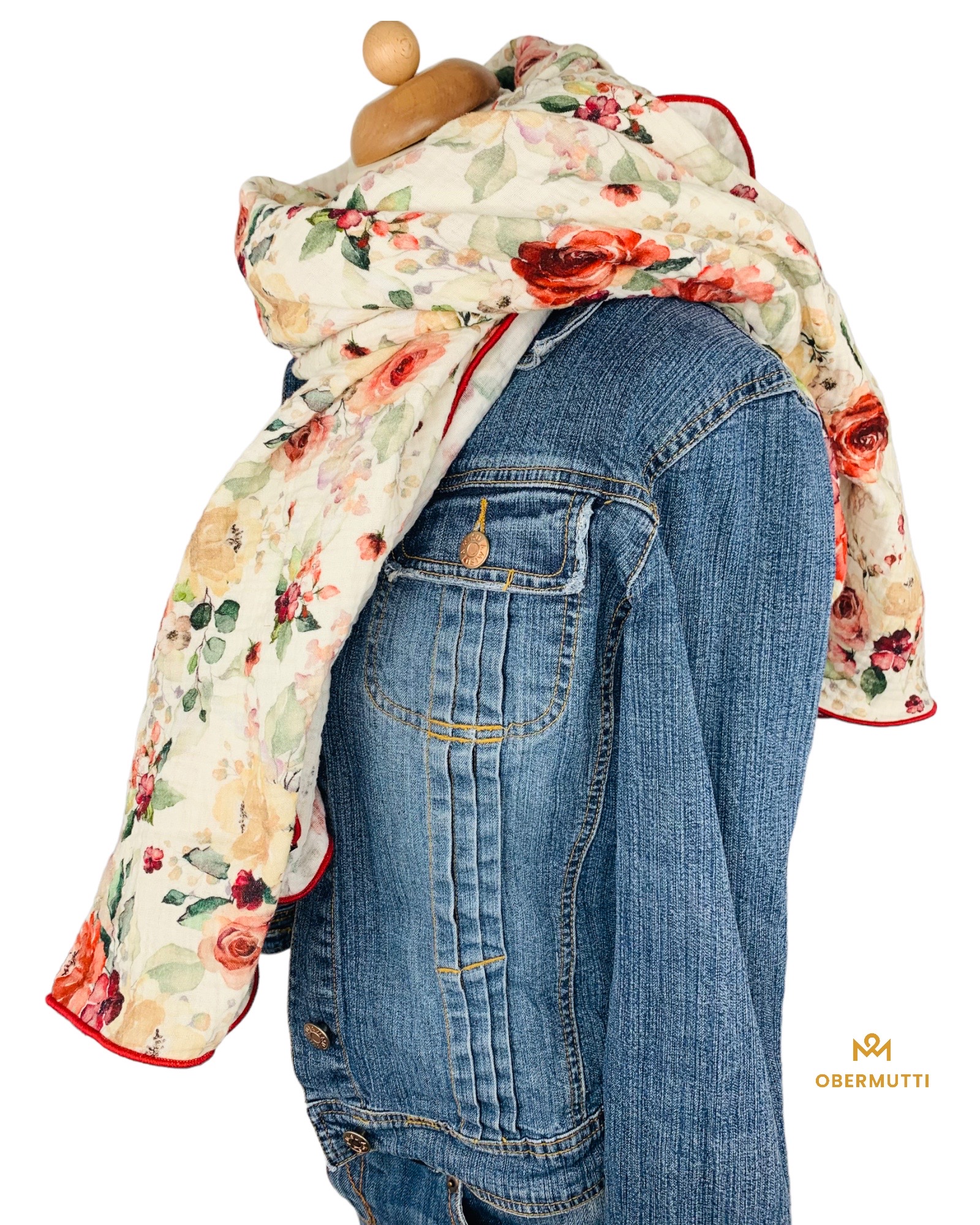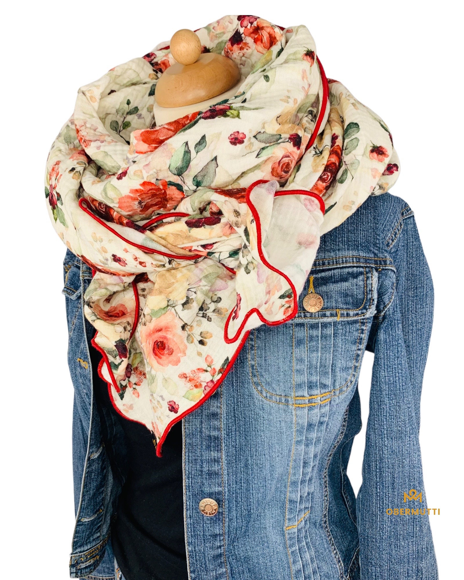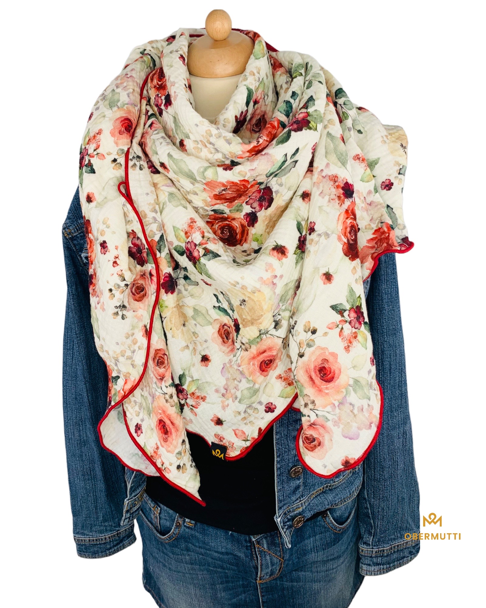 Die Einzigartigkeit des Designs wird durch die Struktur des weichen Baumwollmusselins in Kombination mit der Gewebekante in der Farbe "Rot" bestimmt.