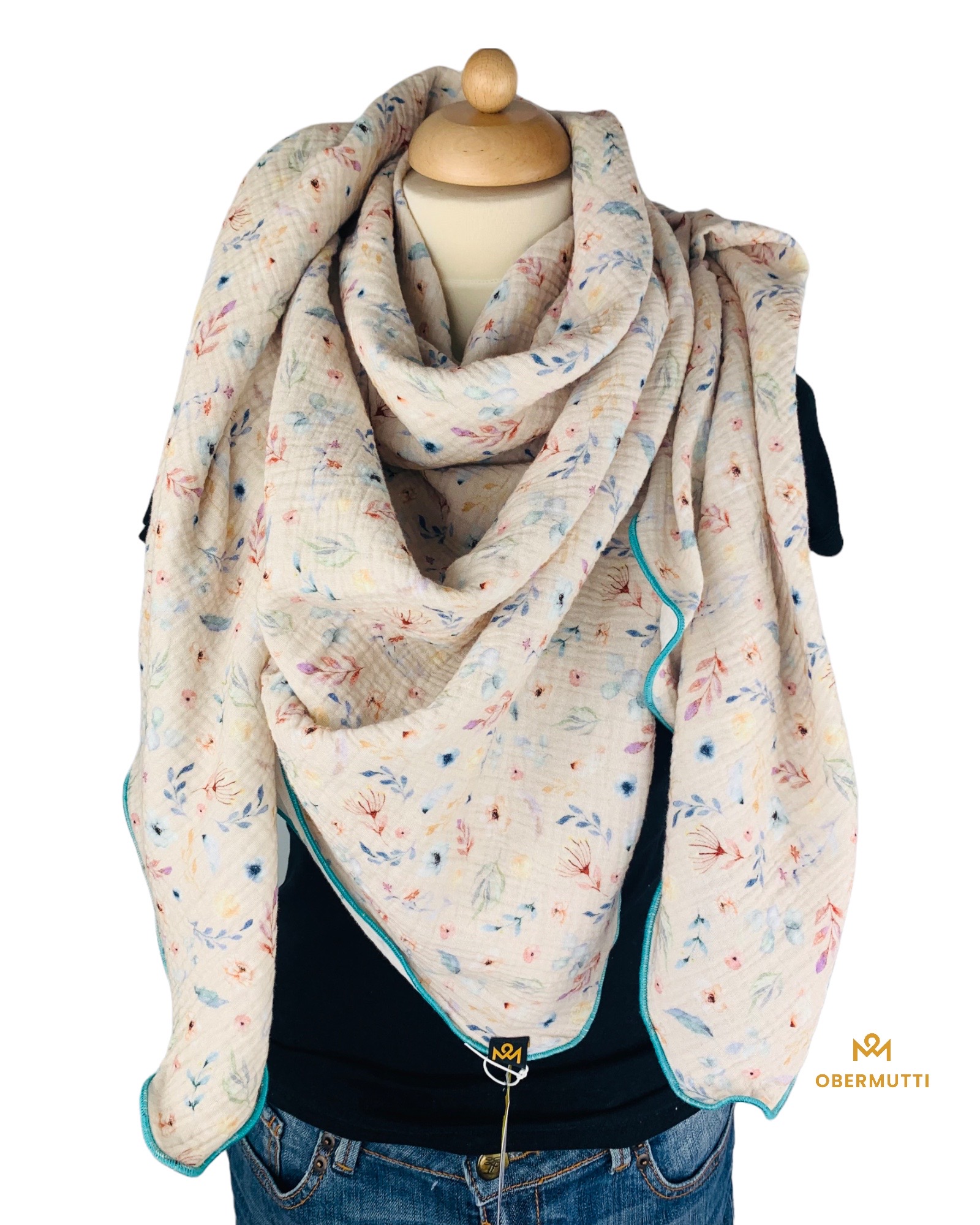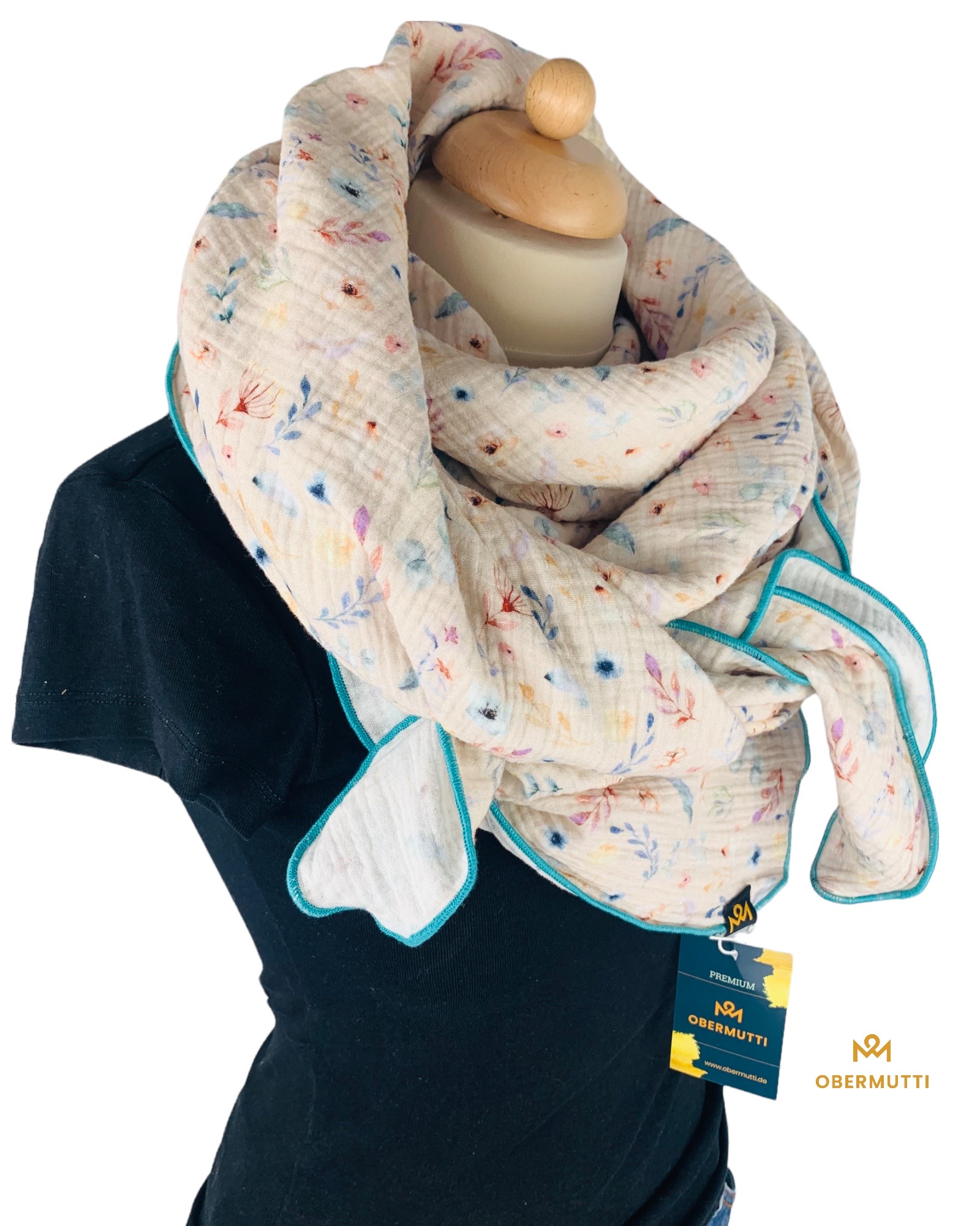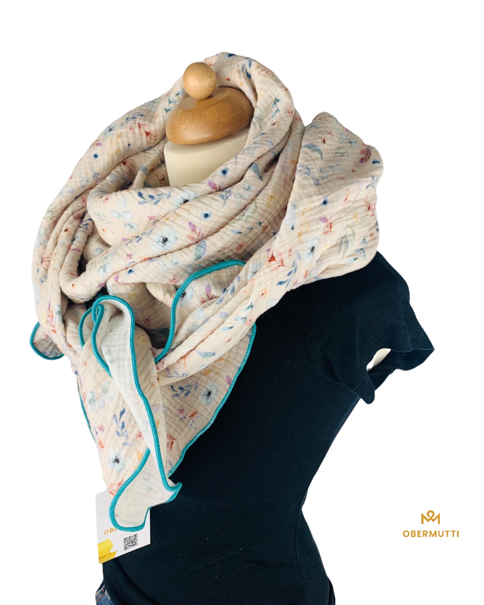 Die Einzigartigkeit des Designs wird durch die Struktur des weichen Baumwollmusselins in Kombination mit der Gewebekante in der Farbe "Türkis" bestimmt.