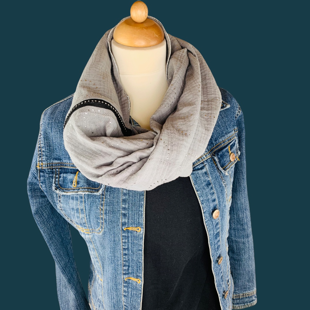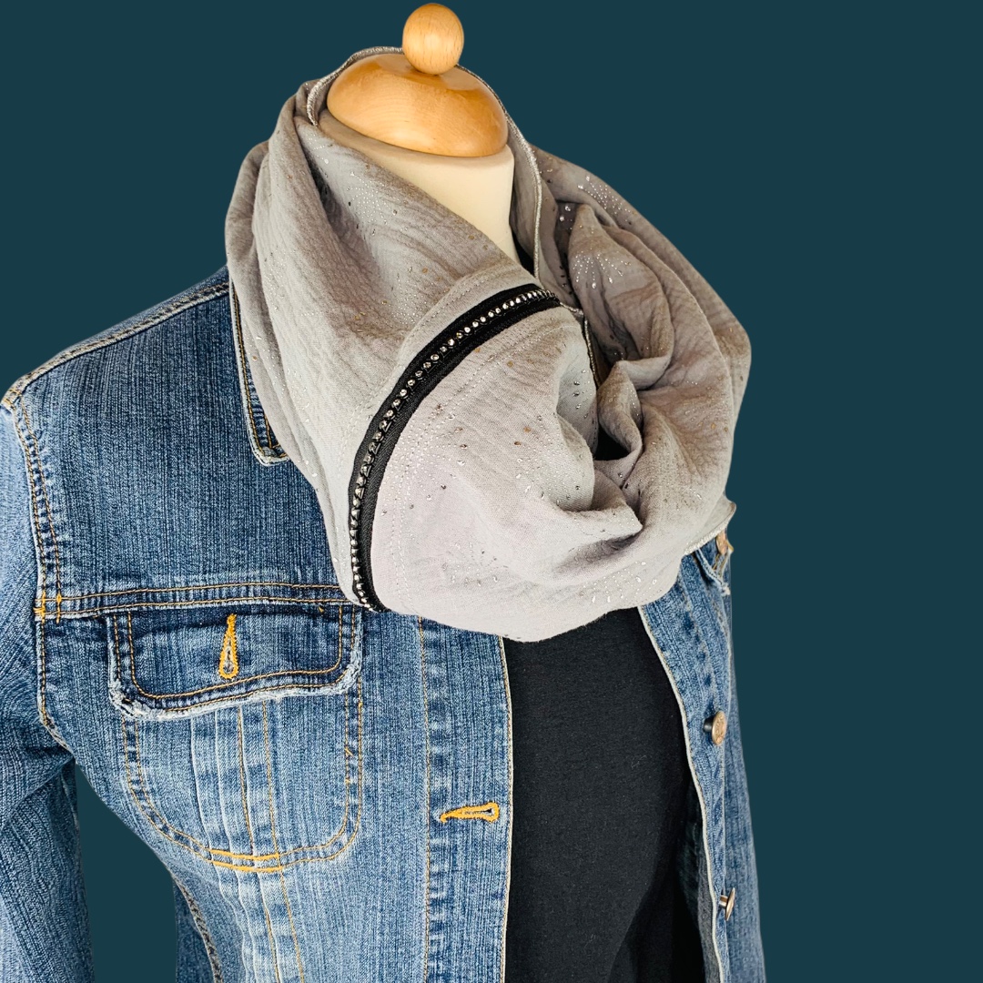 Dieser Schal wurde mit einem Verschluss mit funkelnden Steinchen versehen. Er besteht aus zwei Seitenteilen und einem silberfarbigen Schieber mit diesem der Schal geschlossen und / oder vergrößert werden kann. Dieser Schal kann kann mit weiteren „OM Diamonds“ Schals kombiniert werden. Somit kann der Schal individuell für das Outfit angepasst werden. Der Wahnsinn!