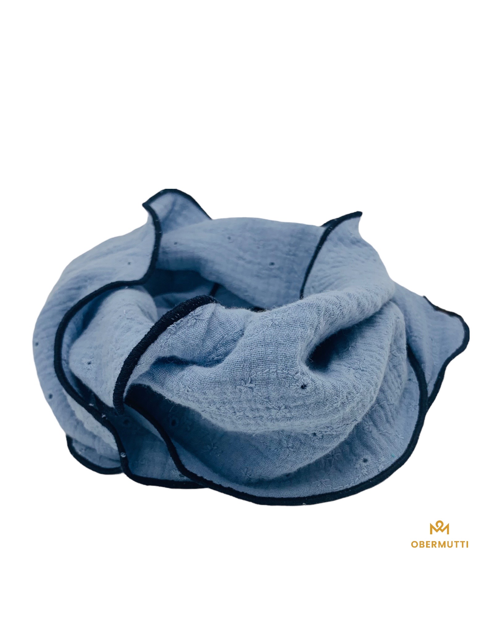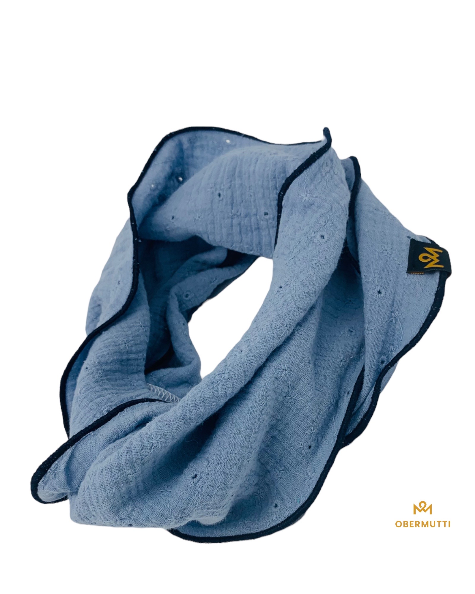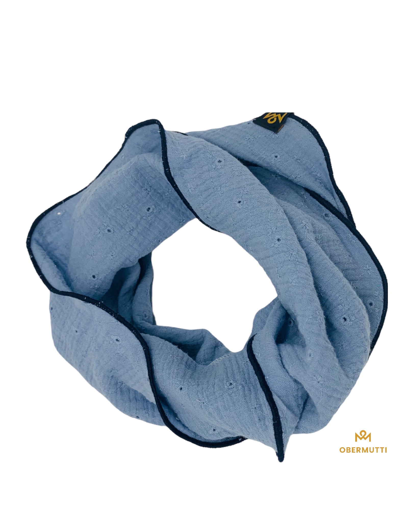 Dieser hochwertige, doppelt gewebte Schlauchschal aus 100% Baumwollmusselin wurde in der Farbe "Hellblau Lochstickerei" gefertigt.