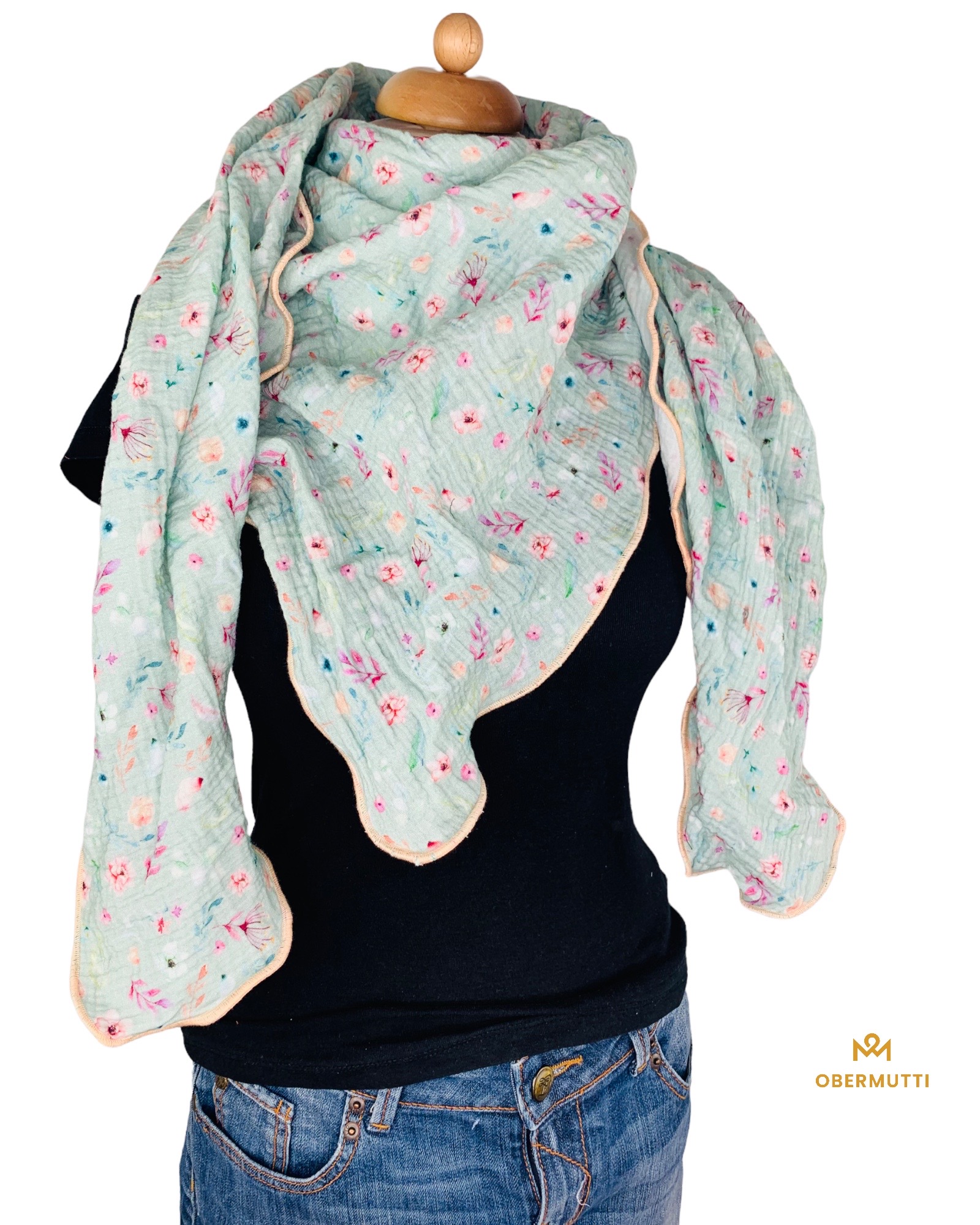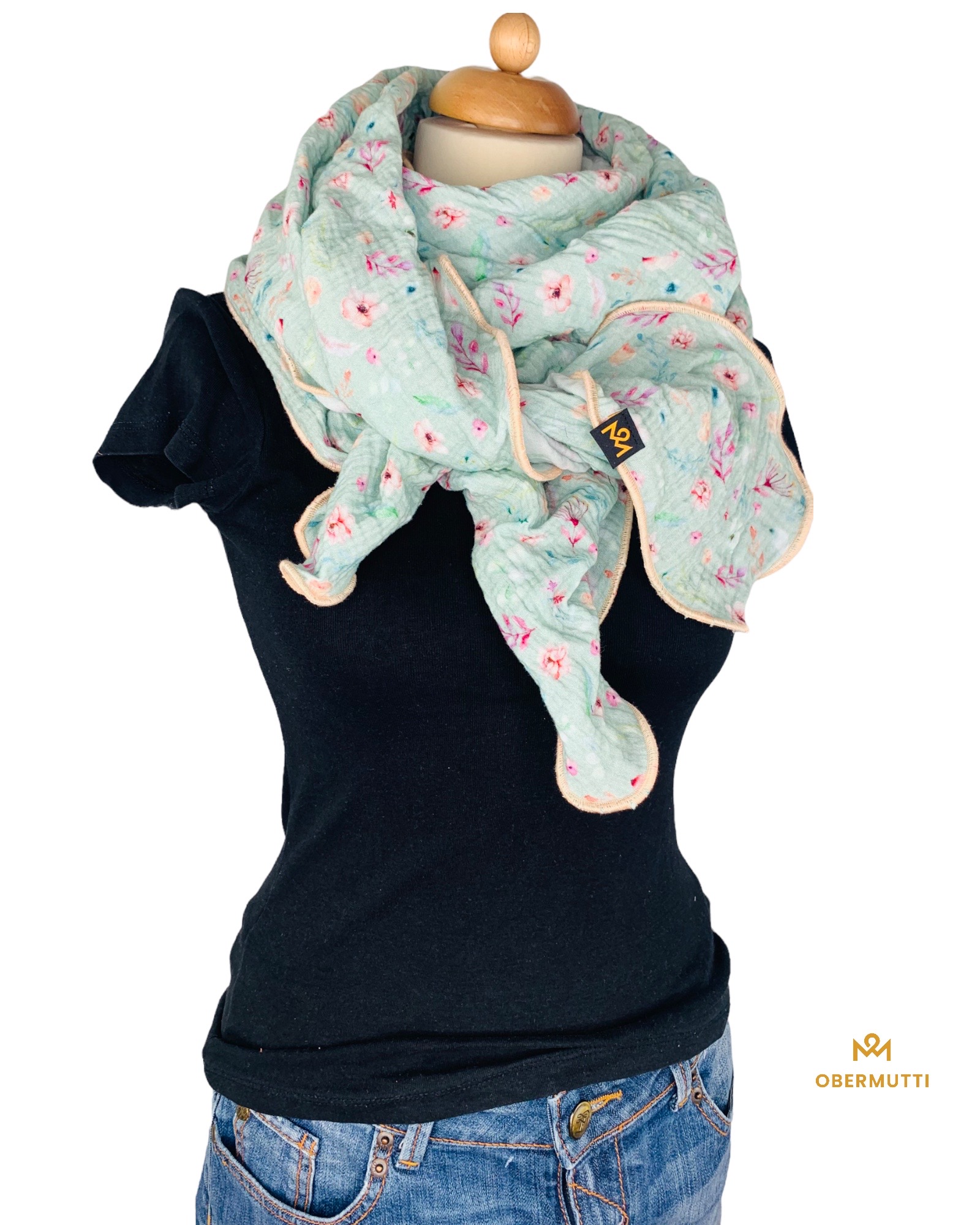 Der Schal besteht aus einem glatten, lockeren und feinfädigen Musselinbaumwollstoff.