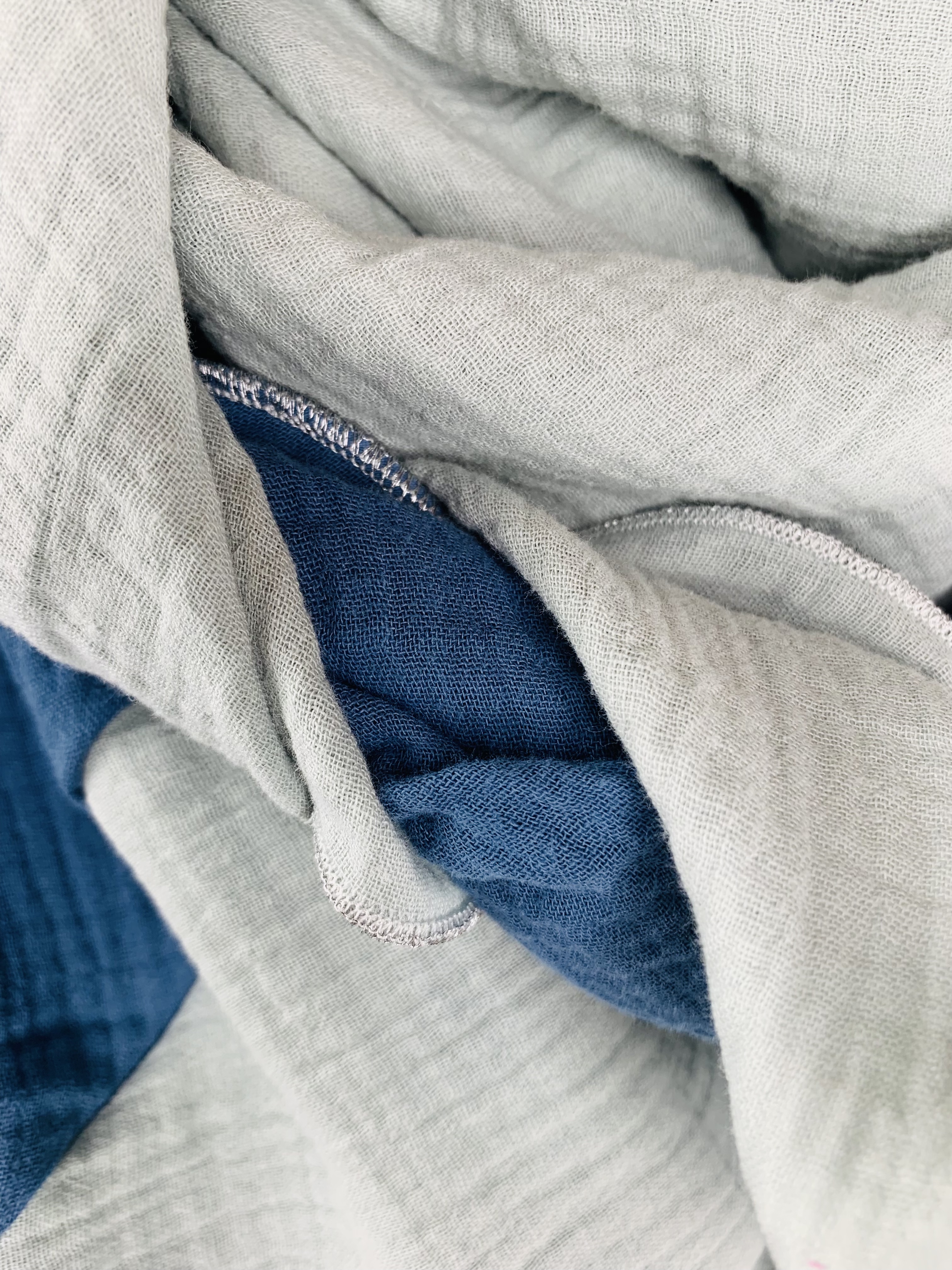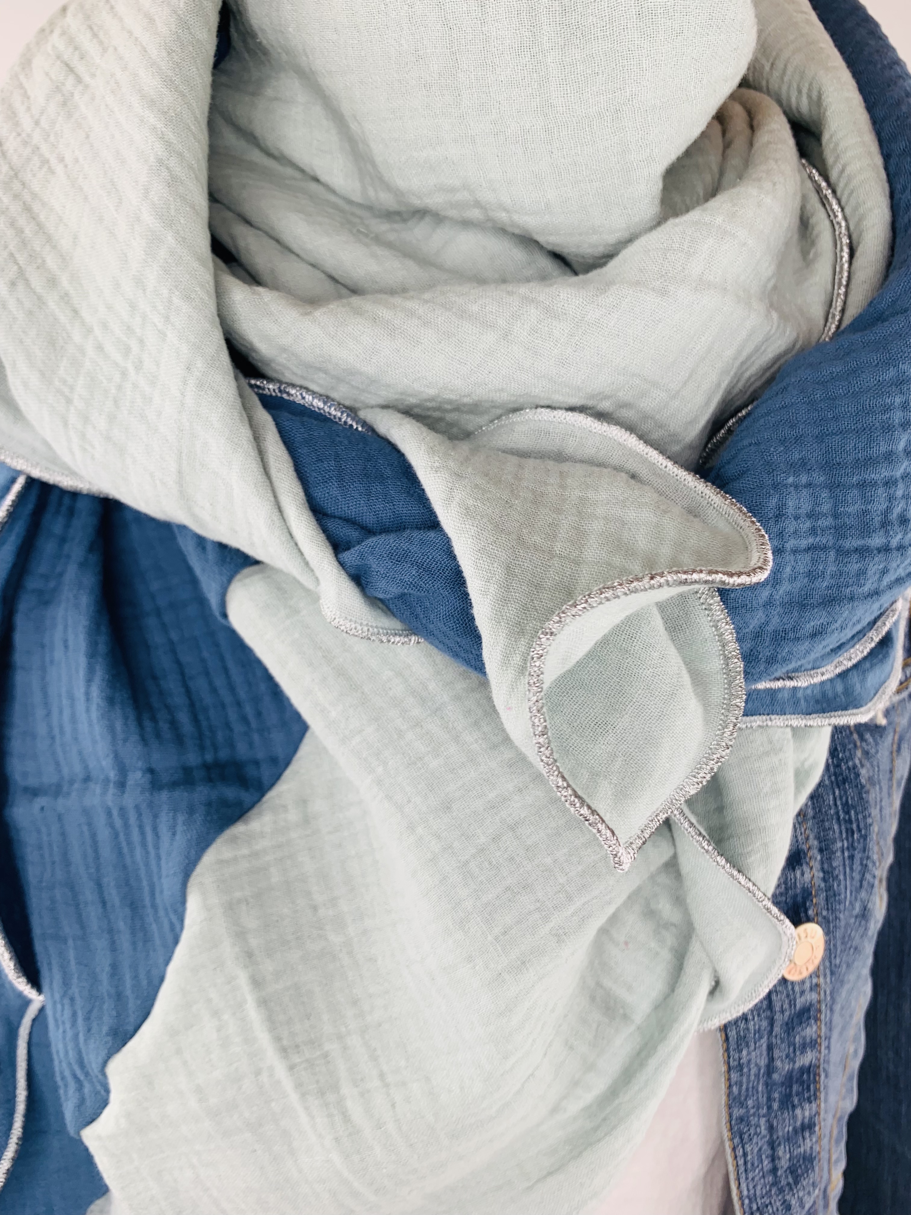 Die Einzigartigkeit des Designs wird durch die Struktur des weichen Baumwollmusselins in Kombination mit der Gewebekante in der Farbe "Silber" bestimmt.