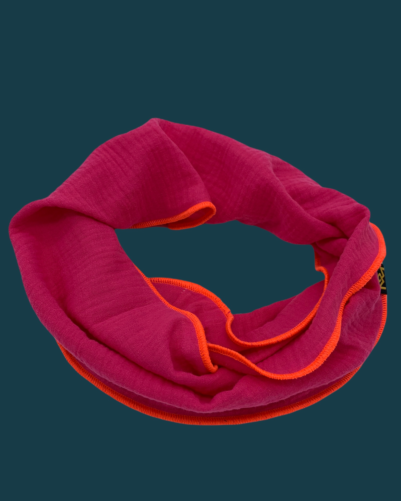 Dieses hochwertige, doppelt gewebte Schlauchschal aus 100% Baumwollmusselin wurde in der Farbe "Pink mit veredelter Gewebekante" gefertigt.