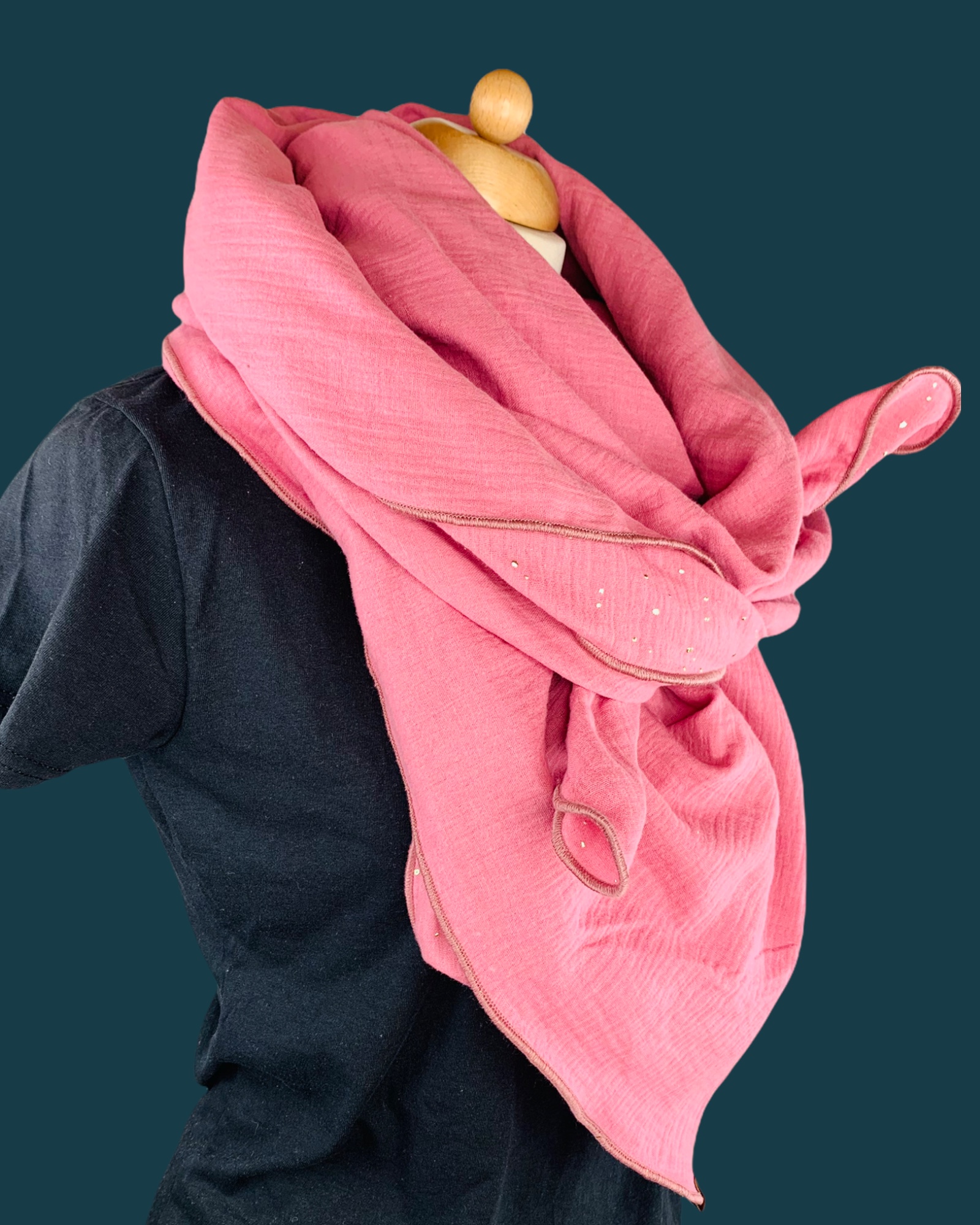 Der Schal besteht aus einem glatten, lockeren und feinfädigen Baumwollstoff.