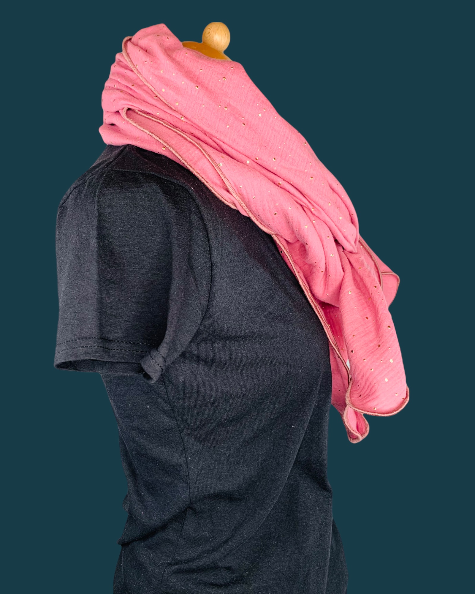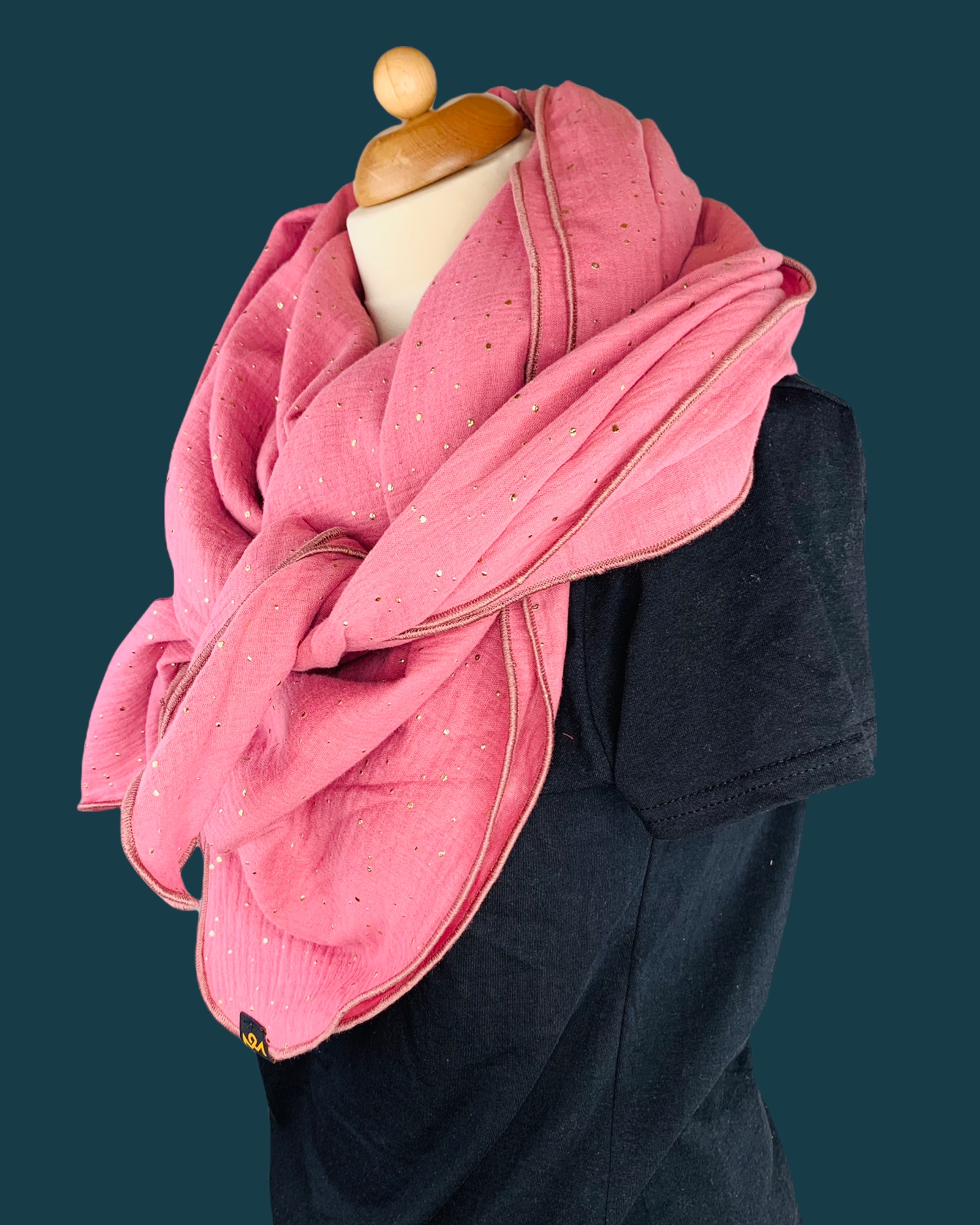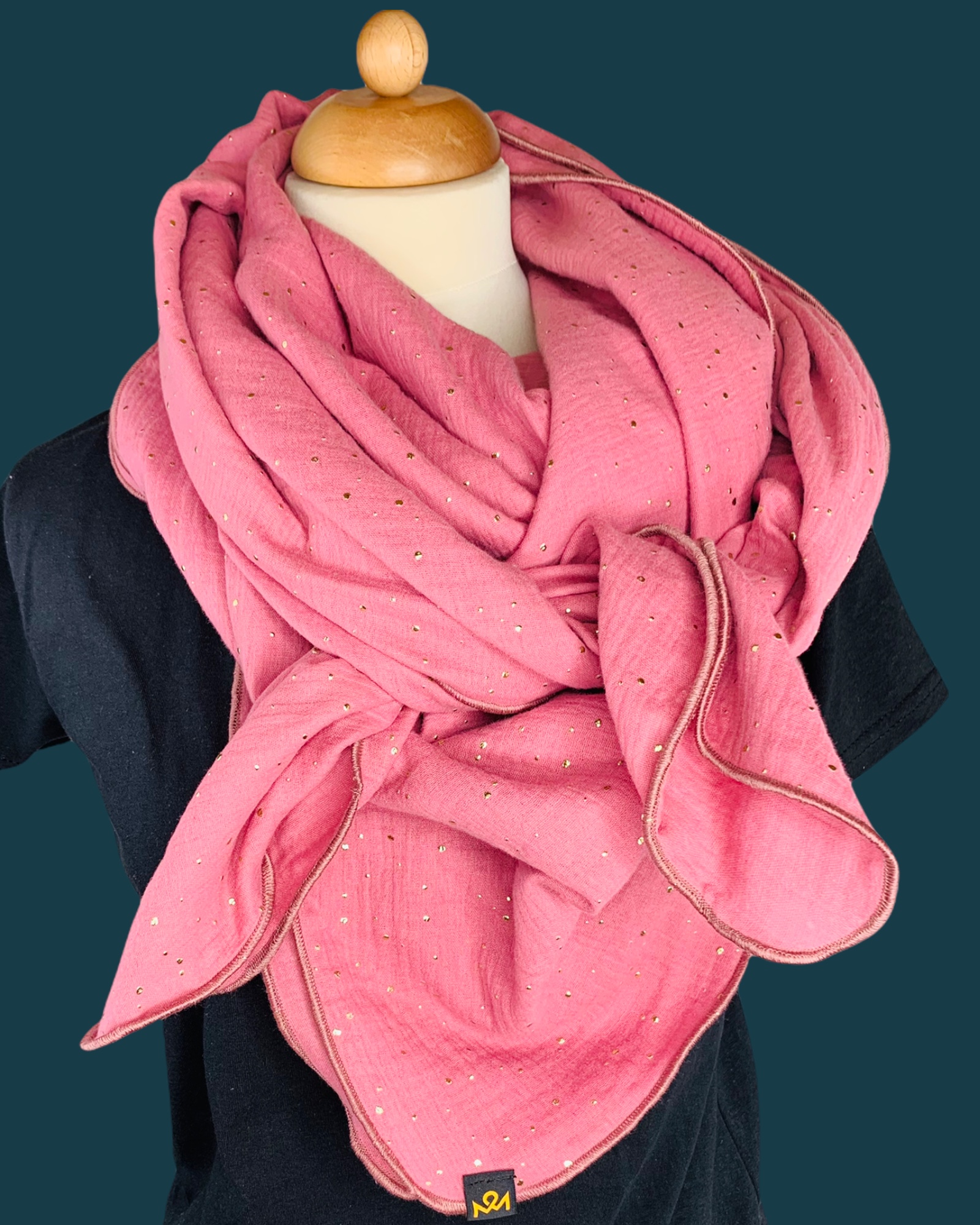 Dieses hochwertige, doppelt gewebte Tuch aus 100% Baumwolle wurde in den Farben "Rosa mit goldenen Tropfen" gefertigt.