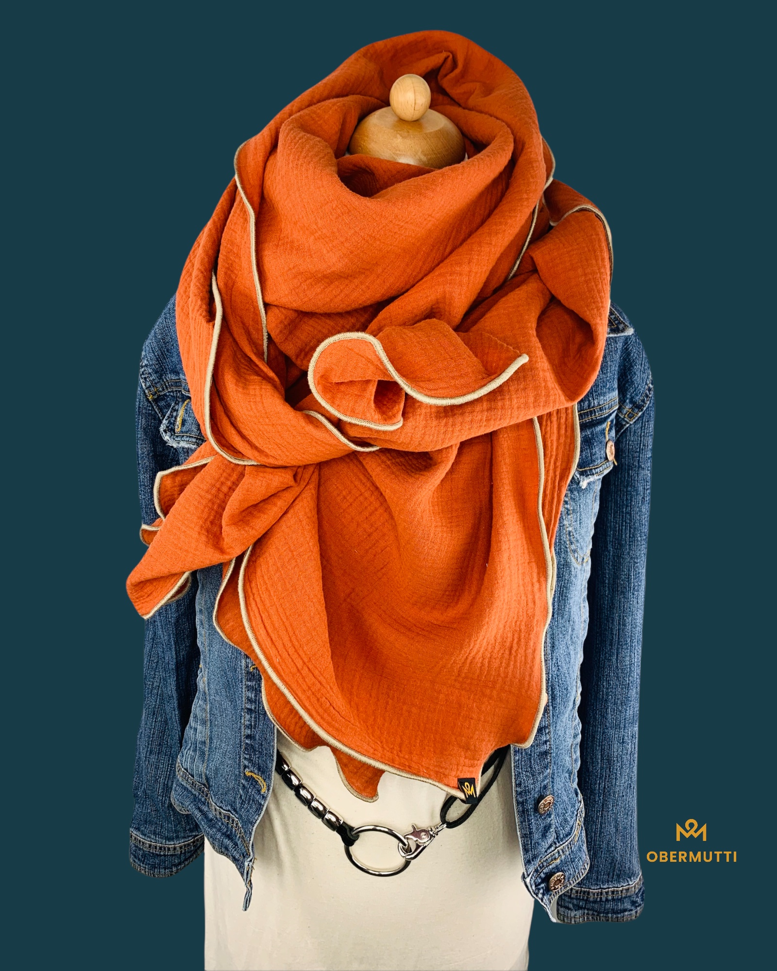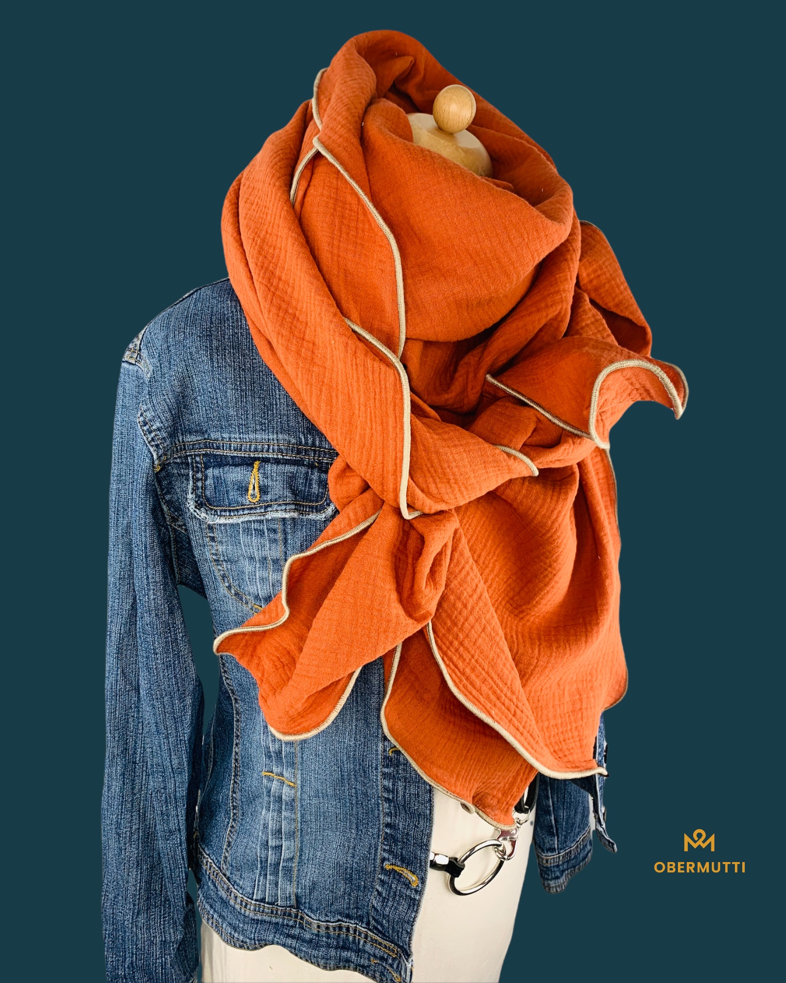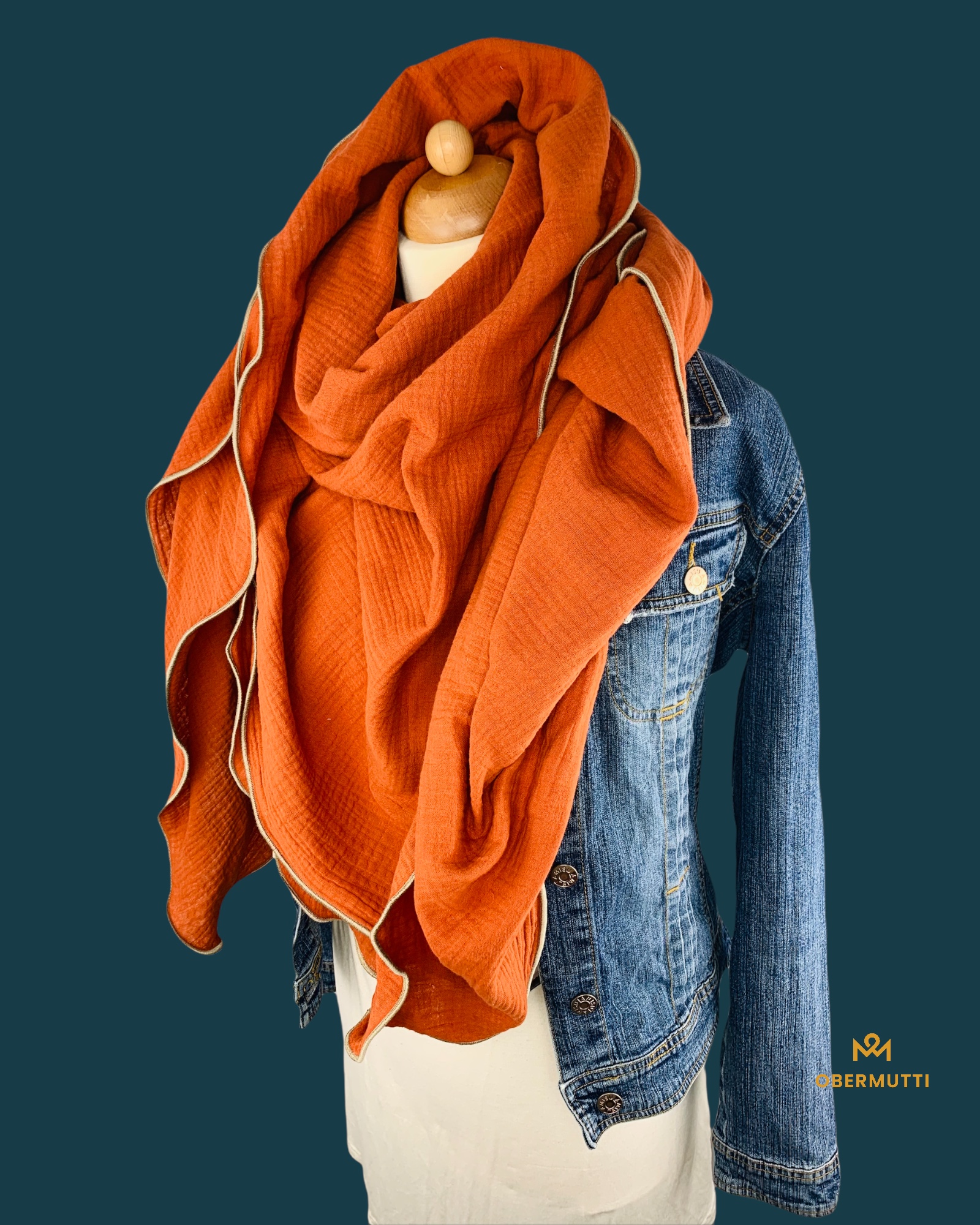 Die Einzigartigkeit des Designs wird durch die Struktur des weichen Baumwollmusselins in Kombination mit der Gewebekante in der Farbe "Creme" bestimmt.