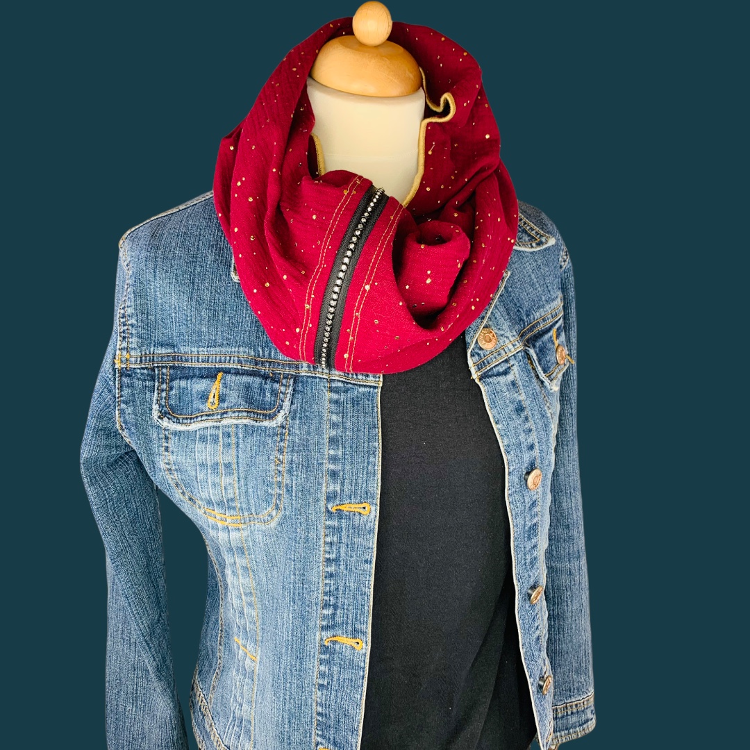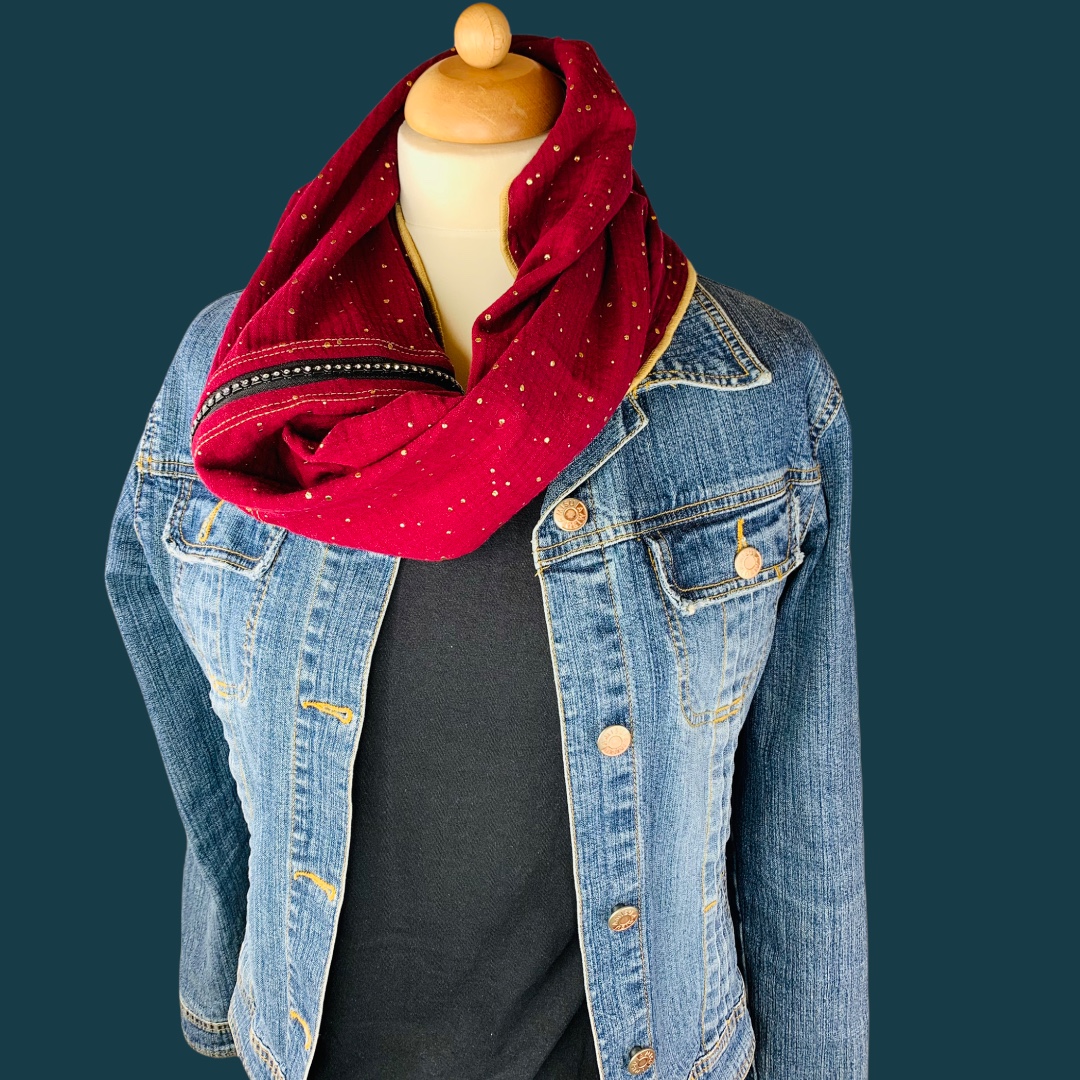 Dieses hochwertige, doppelt gewebte Schlauchschal aus 100% Baumwolle wurde in der Farbe "Weinrot mit goldenen Tropfen“ gefertigt.