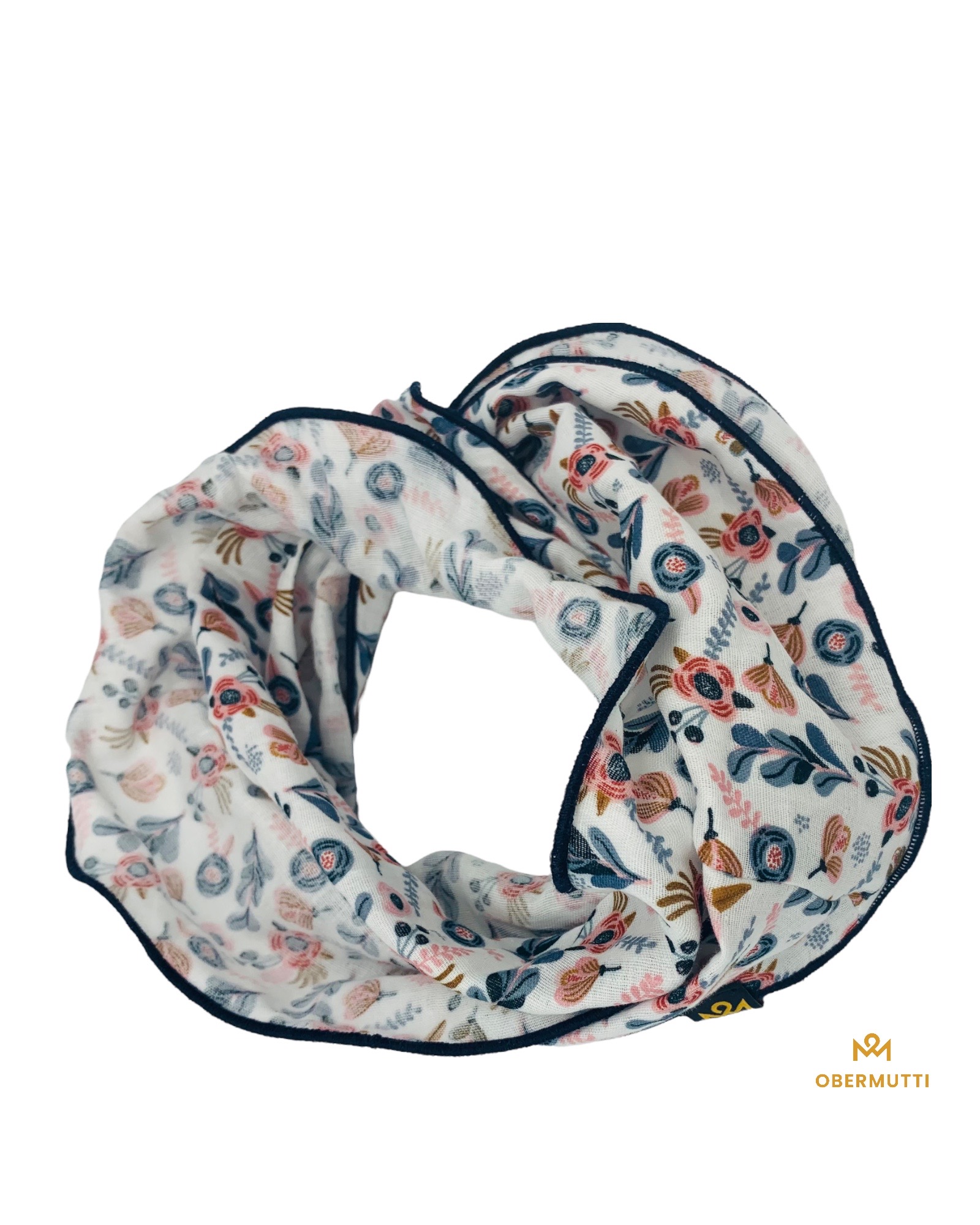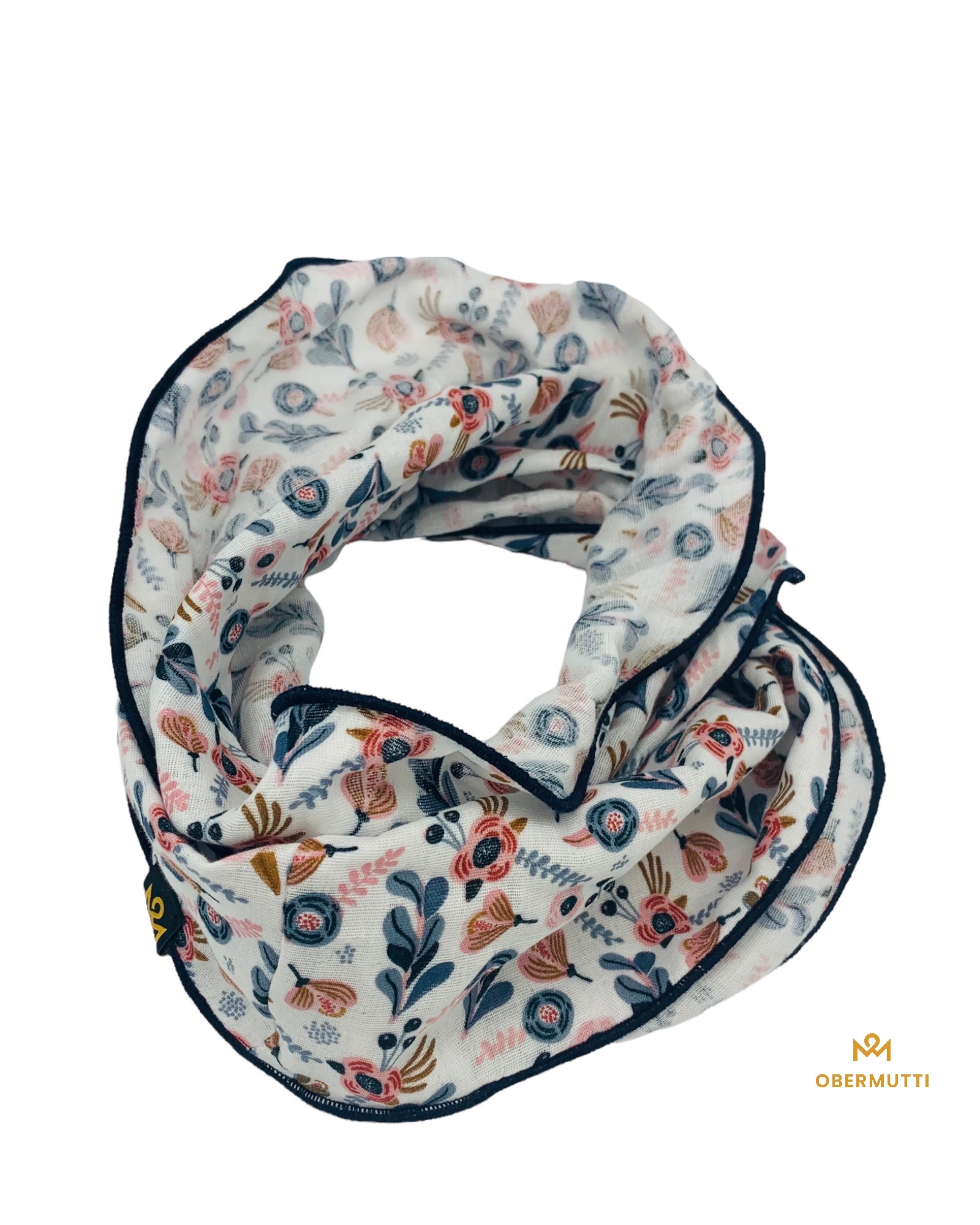 Dieser hochwertige, doppelt gewebte Schlauchschal aus 100% Baumwollmusselin wurde in der Farbe "Weiß mit blauem Blumenmuster" gefertigt.