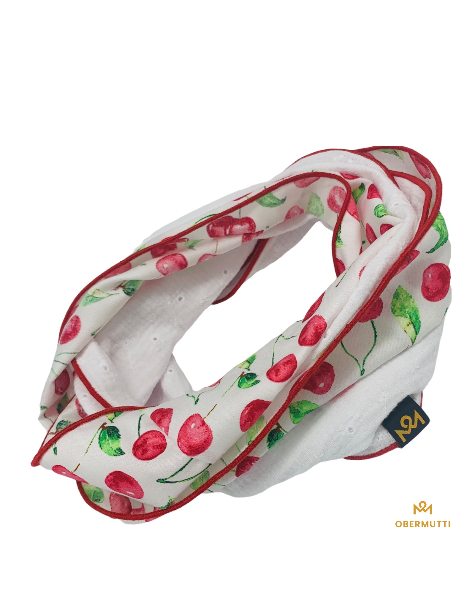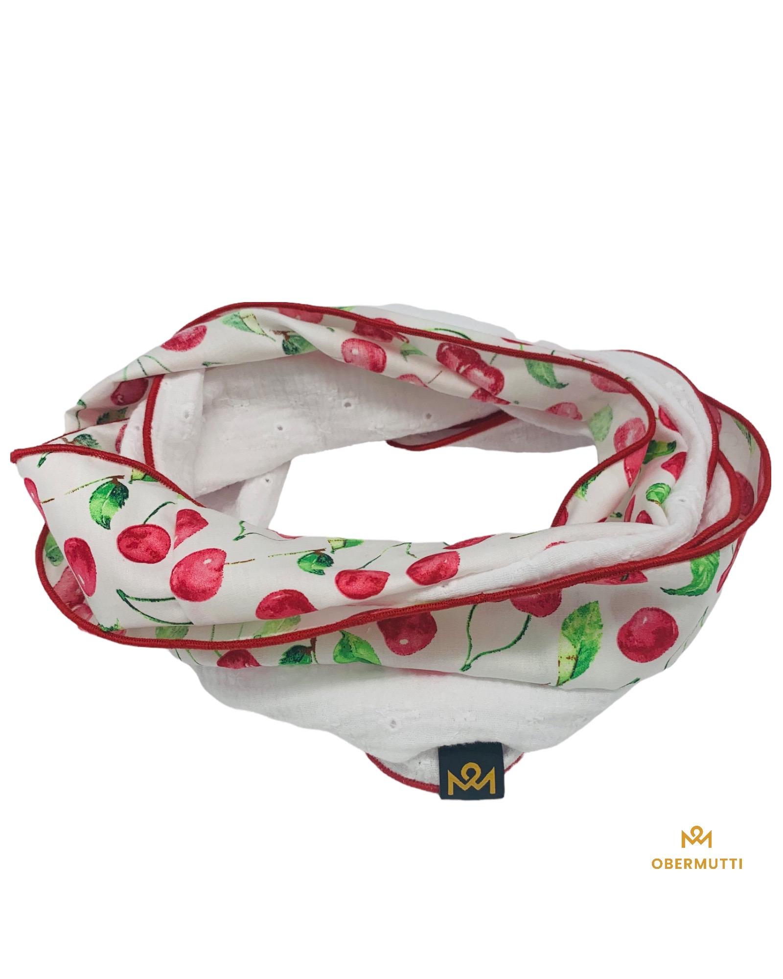 Dieser hochwertige, doppelt gewebte Schlauchschal aus 100% Baumwollmusselin wurde in der Farbe "Weiß mit Kirschprint und Weiß Lochstickerei" gefertigt.