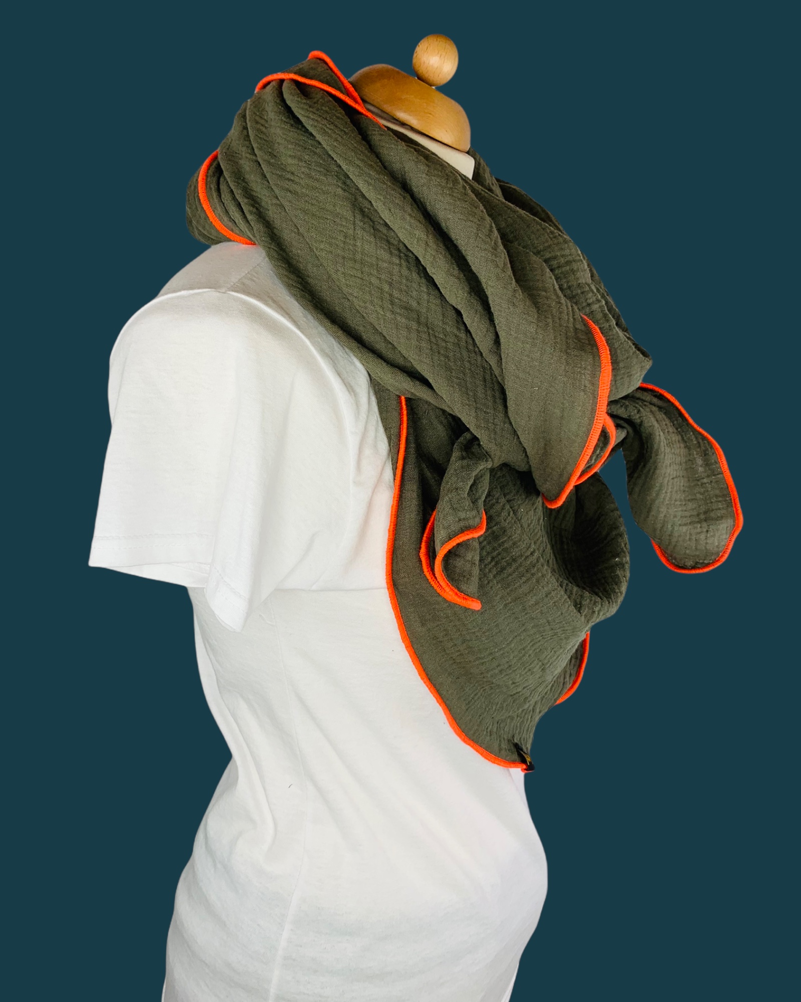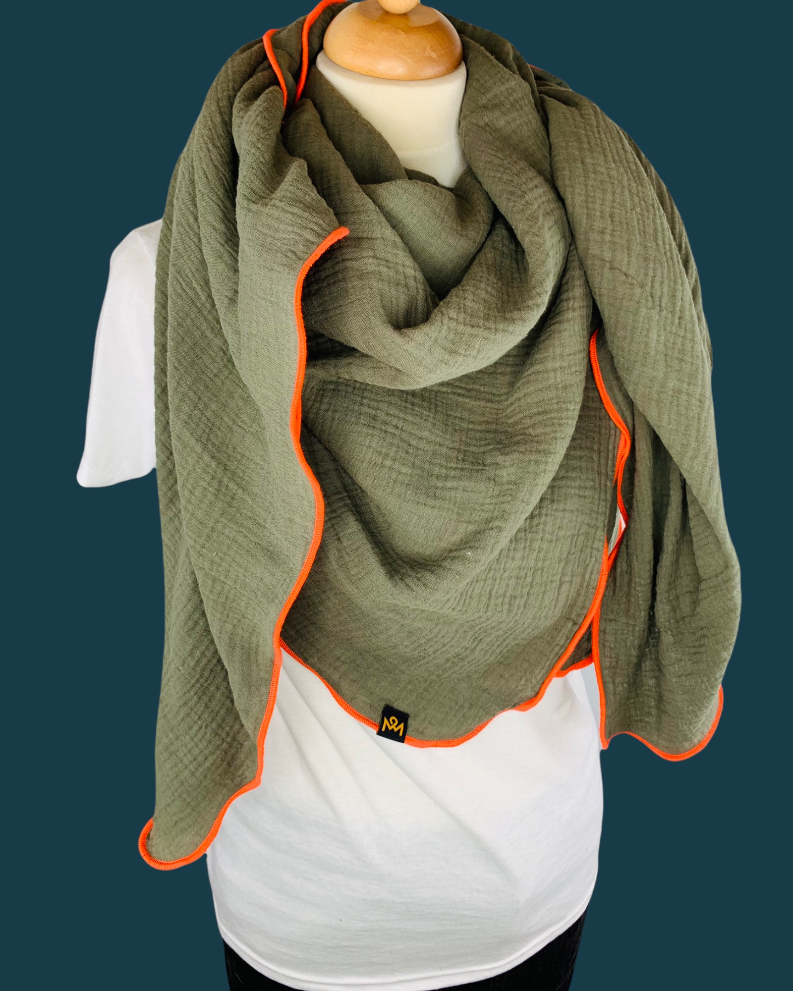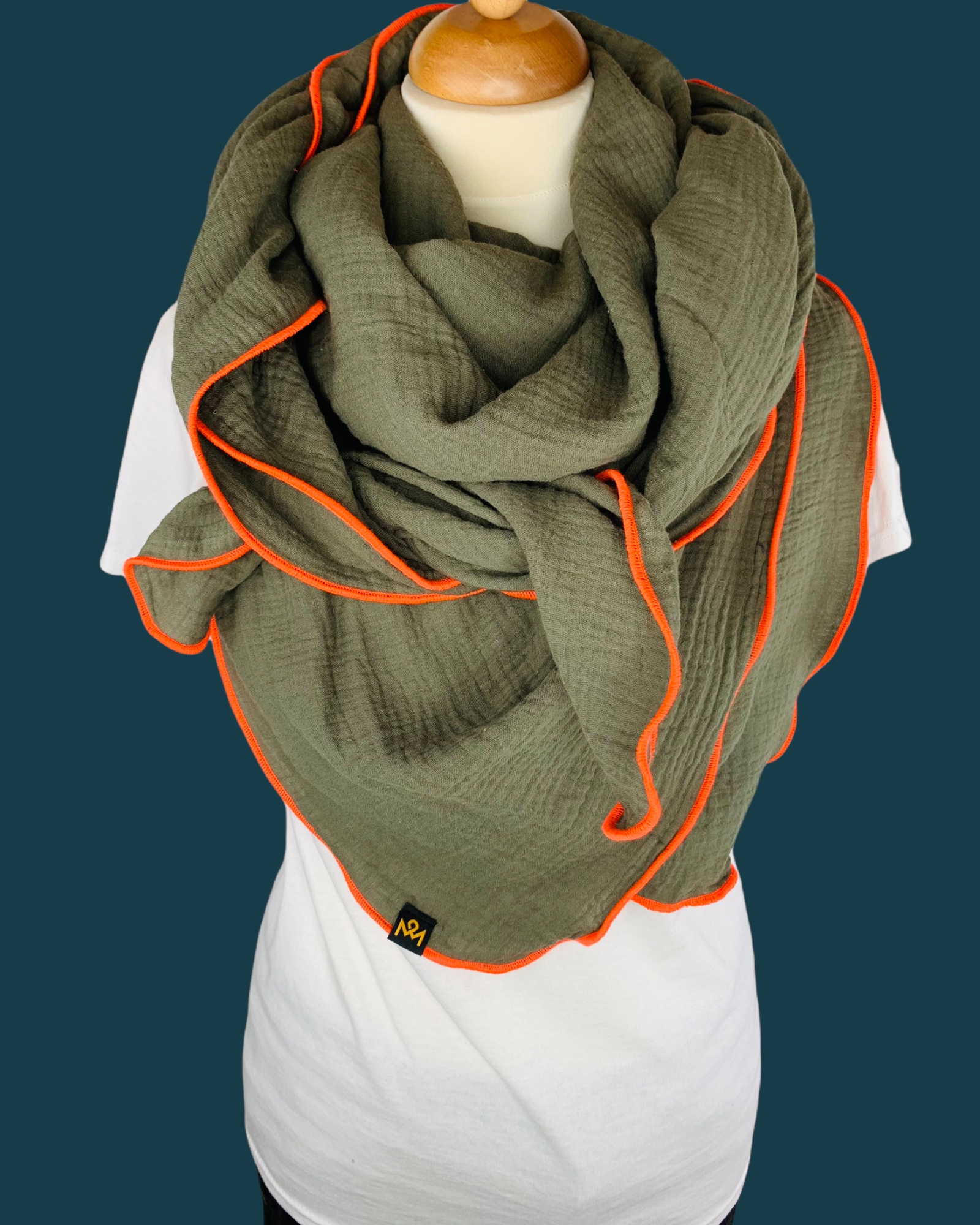 Die Einzigartigkeit des Designs wird durch die Struktur des weichen Baumwollmusselins in Kombination mit der Gewebekante in der Farbe "Orange" bestimmt.