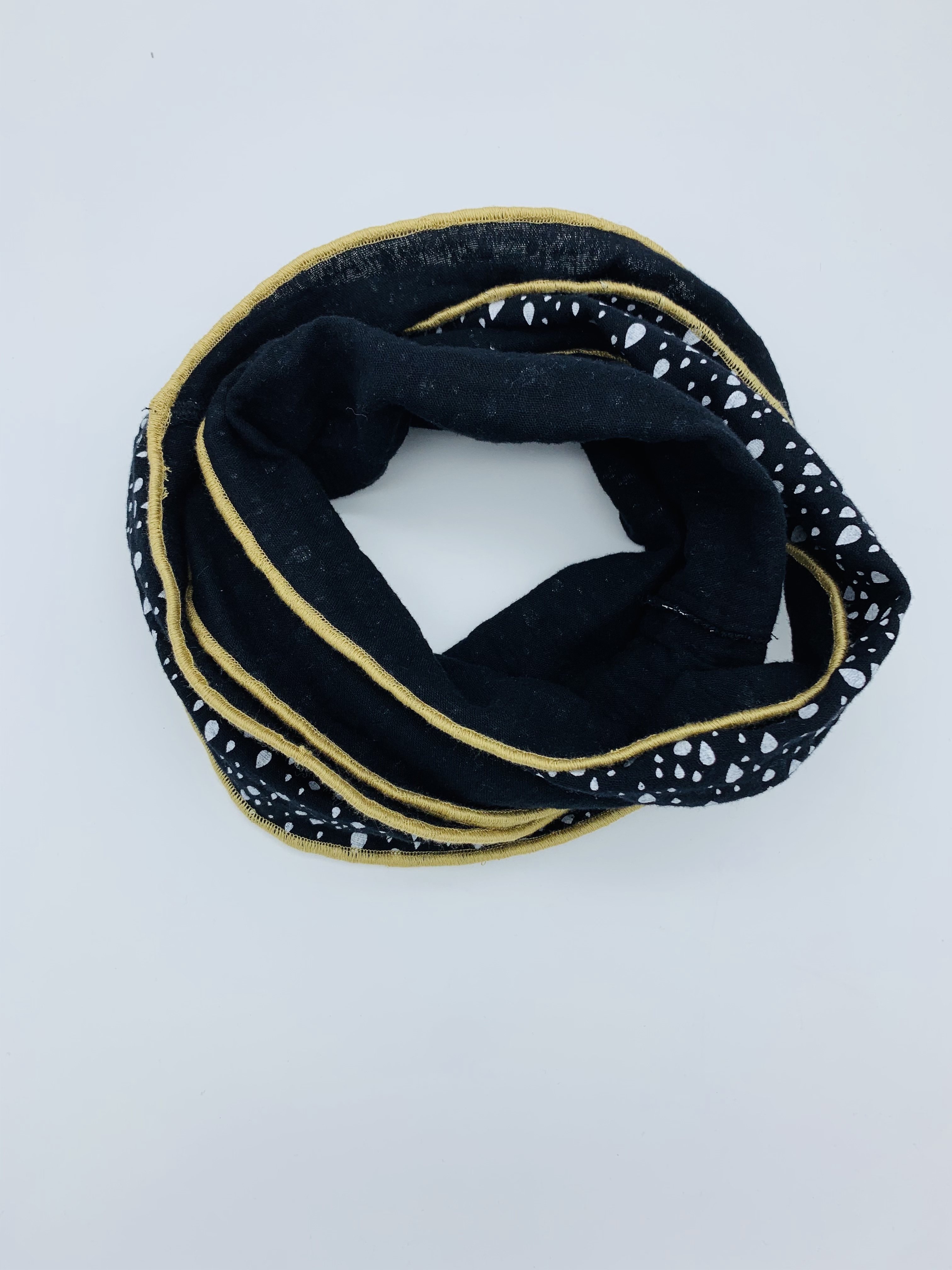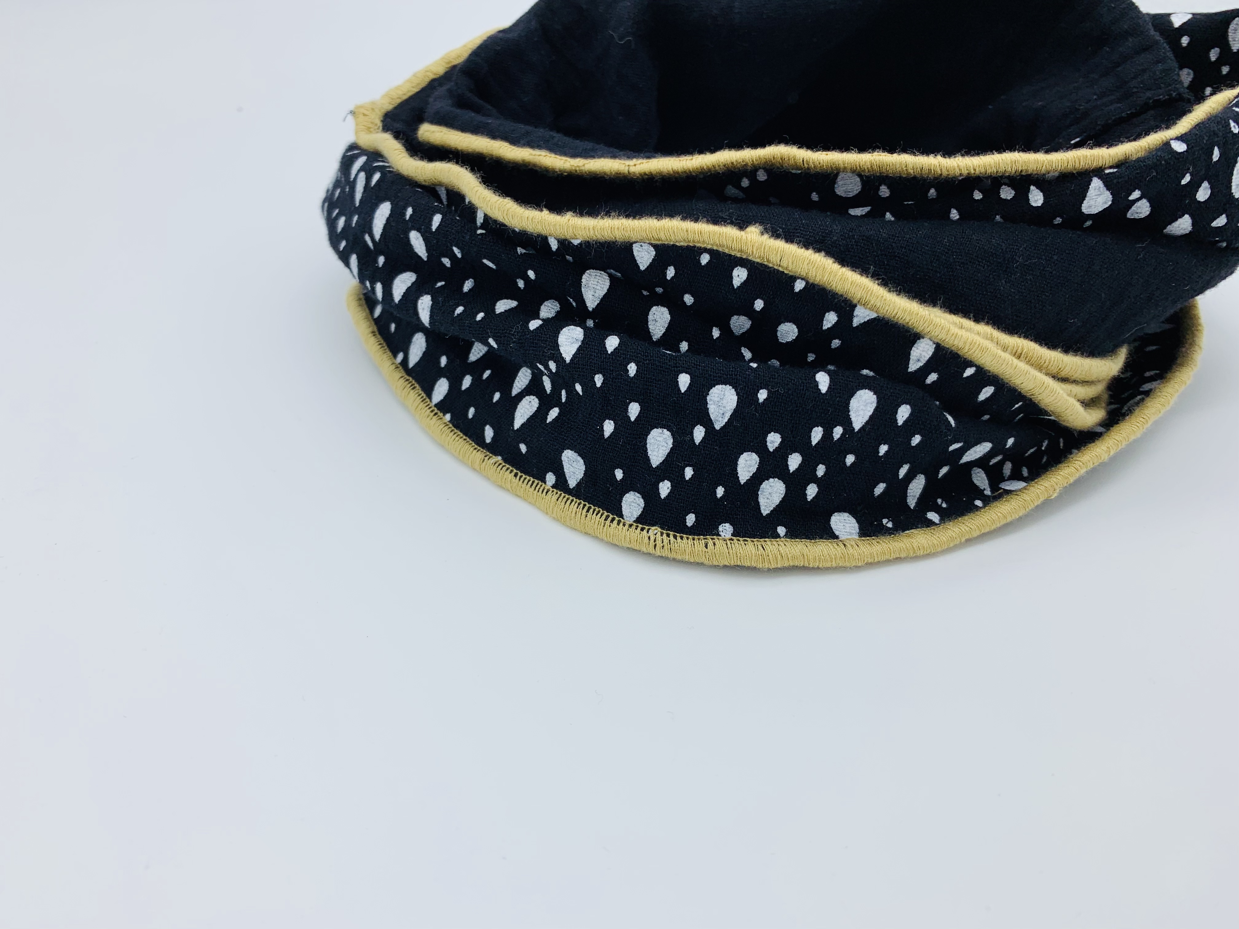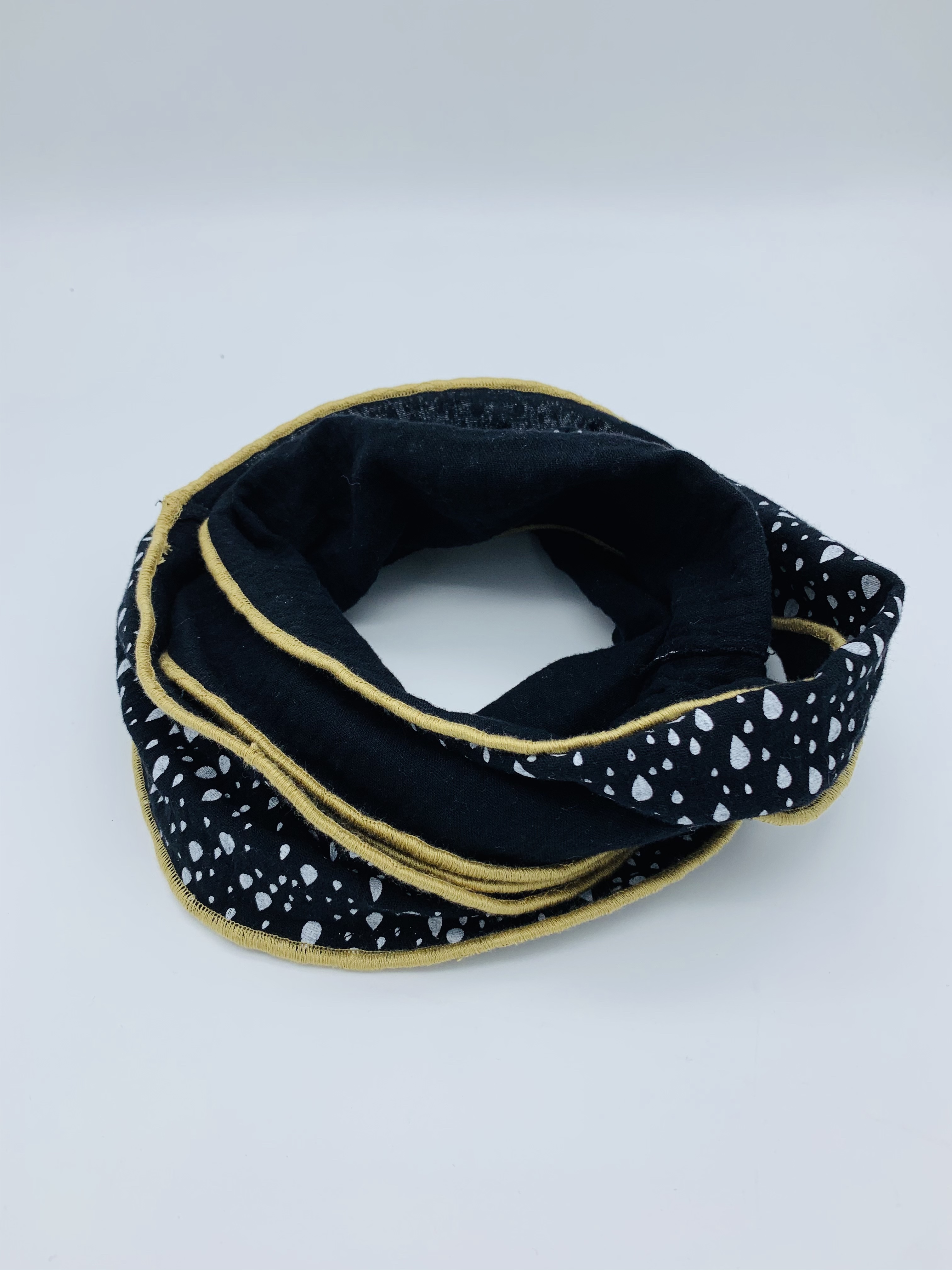 Dieser hochwertige, doppelt gewebte Schlauchschal aus 100% Baumwollmusselin wurde in den Farben "Schwarz mit weißen Regentropfen" gefertigt.
