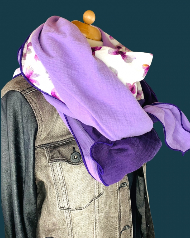 Die Einzigartigkeit des Designs wird durch die Struktur des weichen Baumwollmusselins in Kombination mit der Gewebekante in den Farben "Lila" bestimmt.