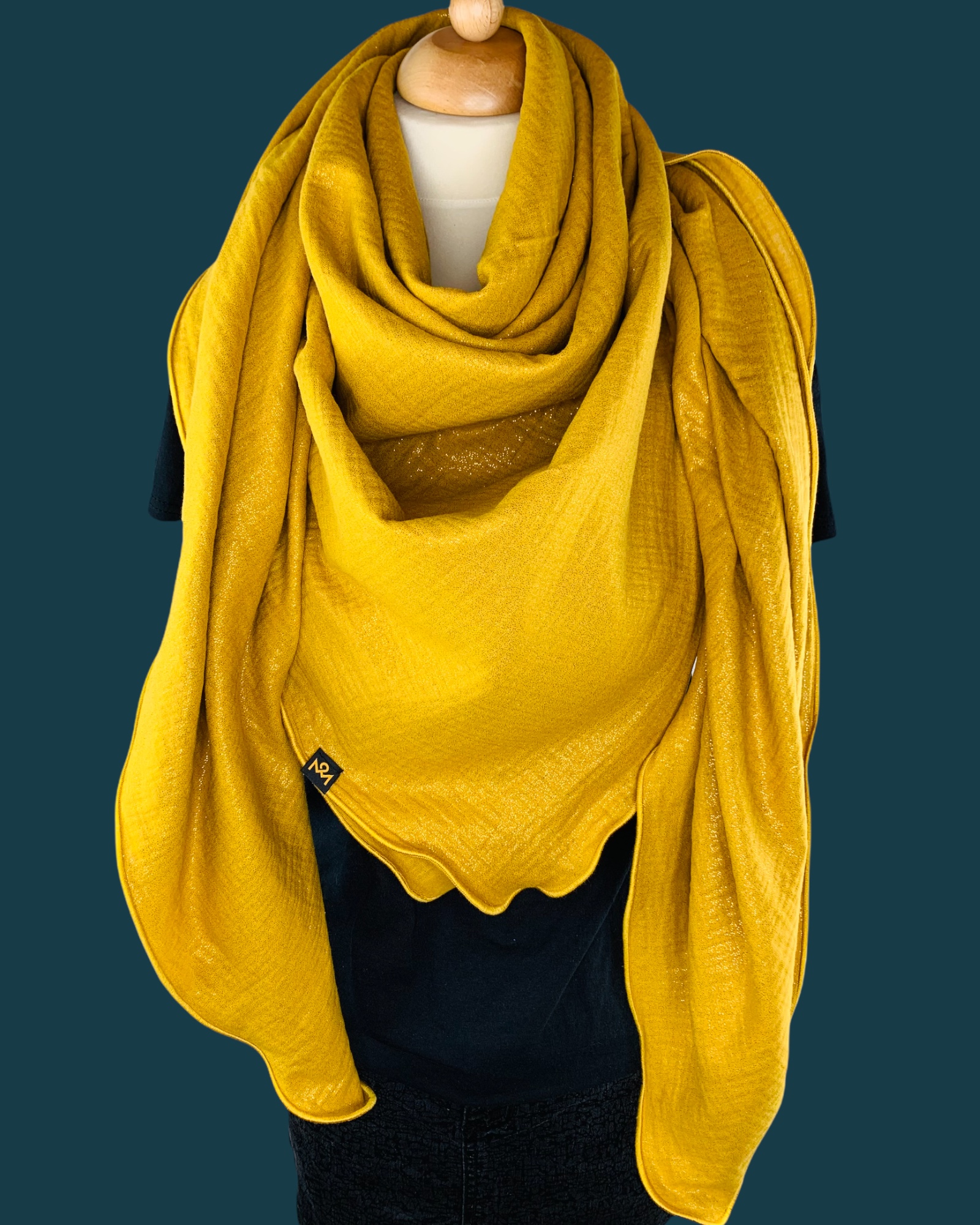 Die Einzigartigkeit des Designs wird durch die Struktur des weichen Baumwollmusselins in Kombination mit der Gewebekante in den Farben "Gold" bestimmt.