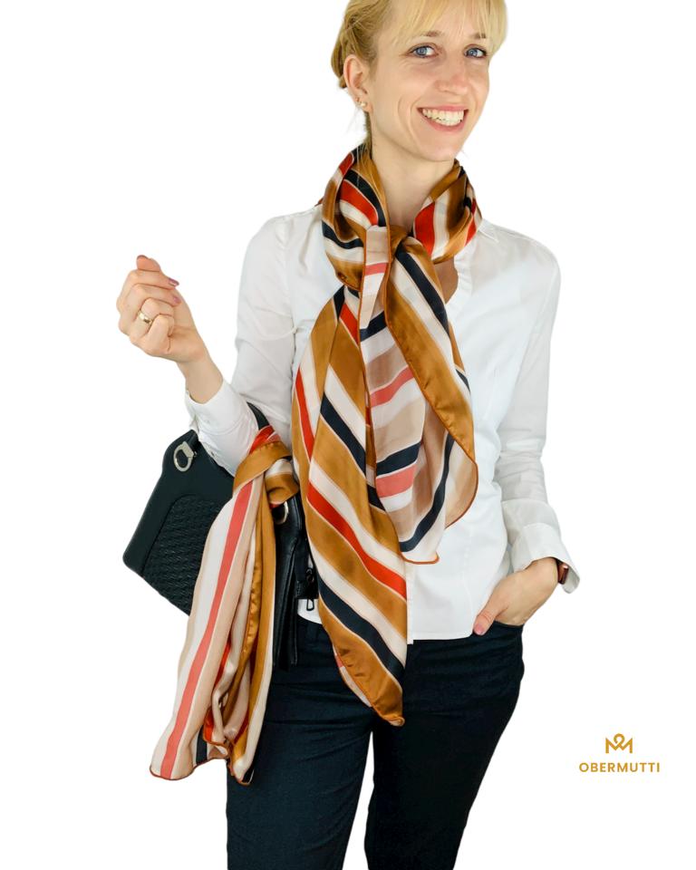 Diese luxuriösen Tücher aus 100 % Seide wurden mit einem Streifenprint in den Farben