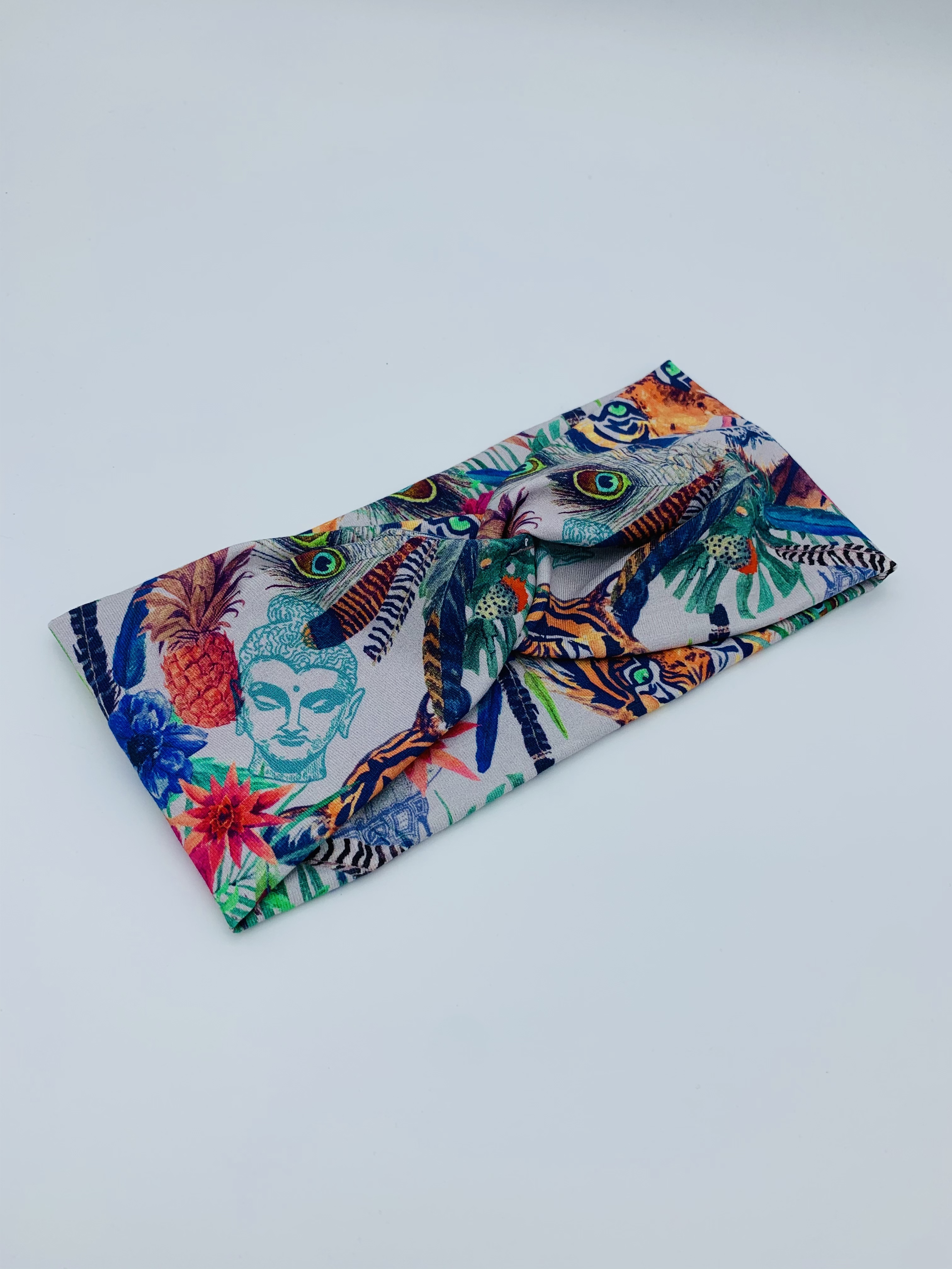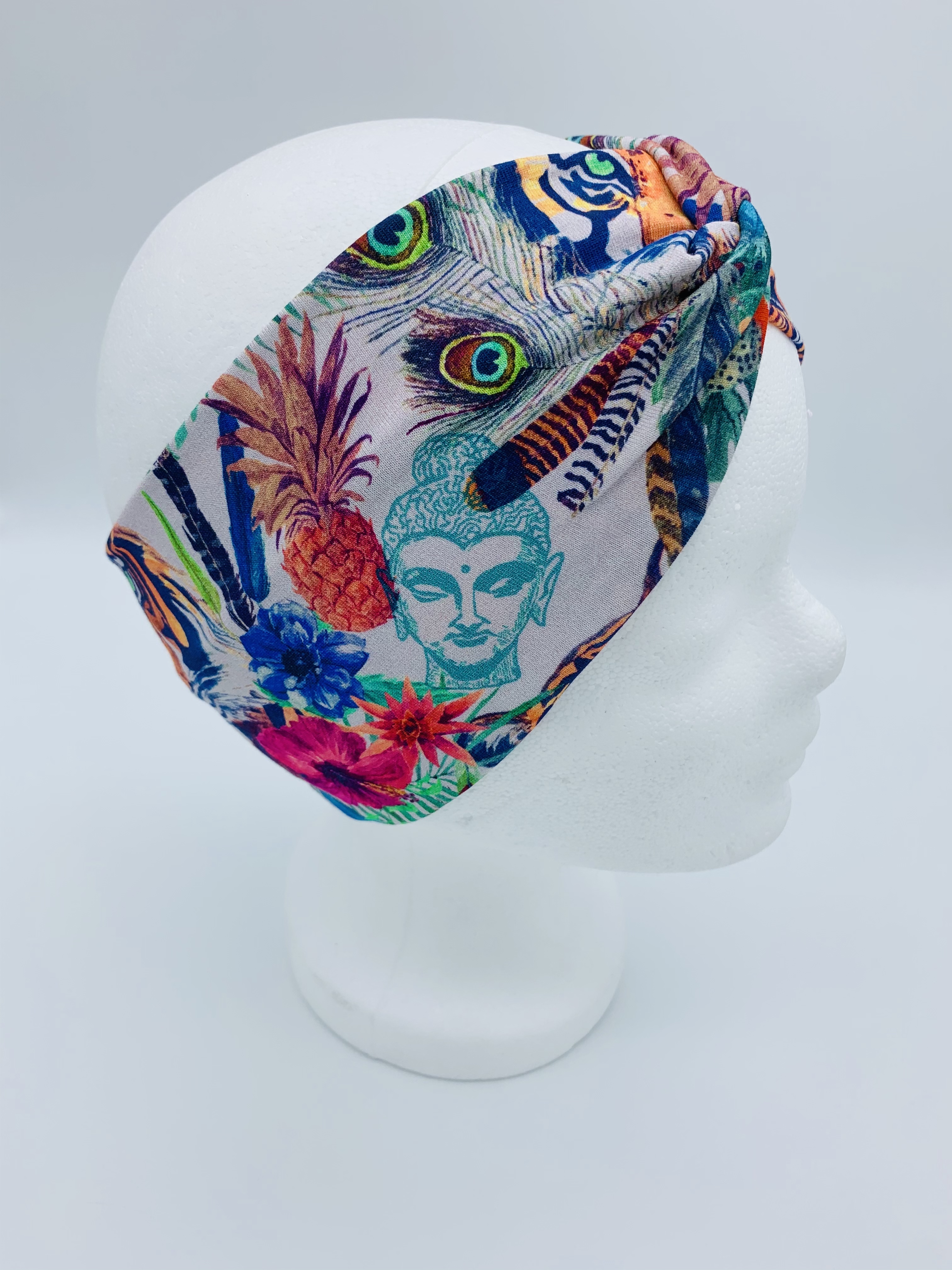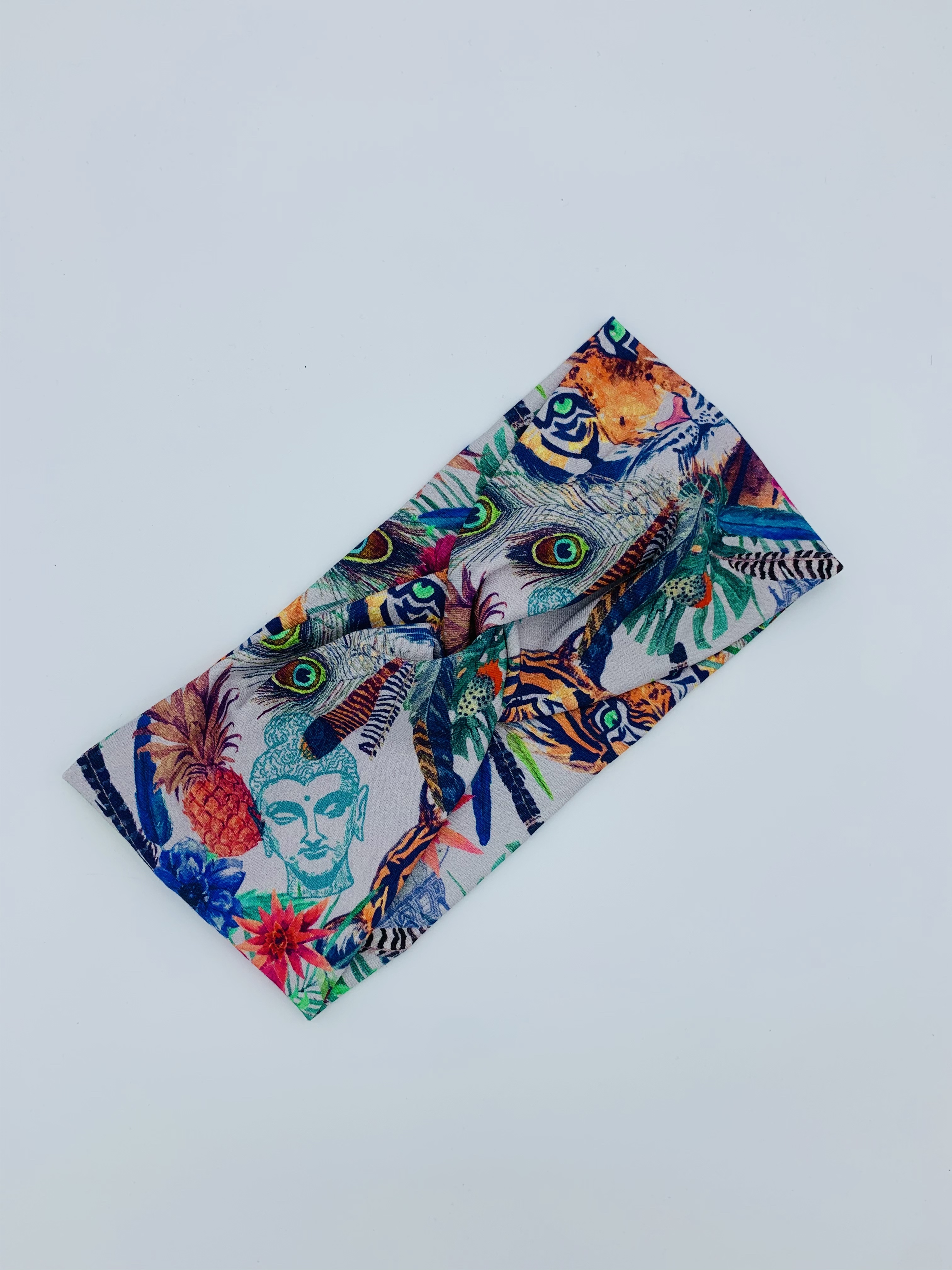 Stirnband aus Baumwolljersey in Hellgrau mit bunten Tigern, Budda's und Federn