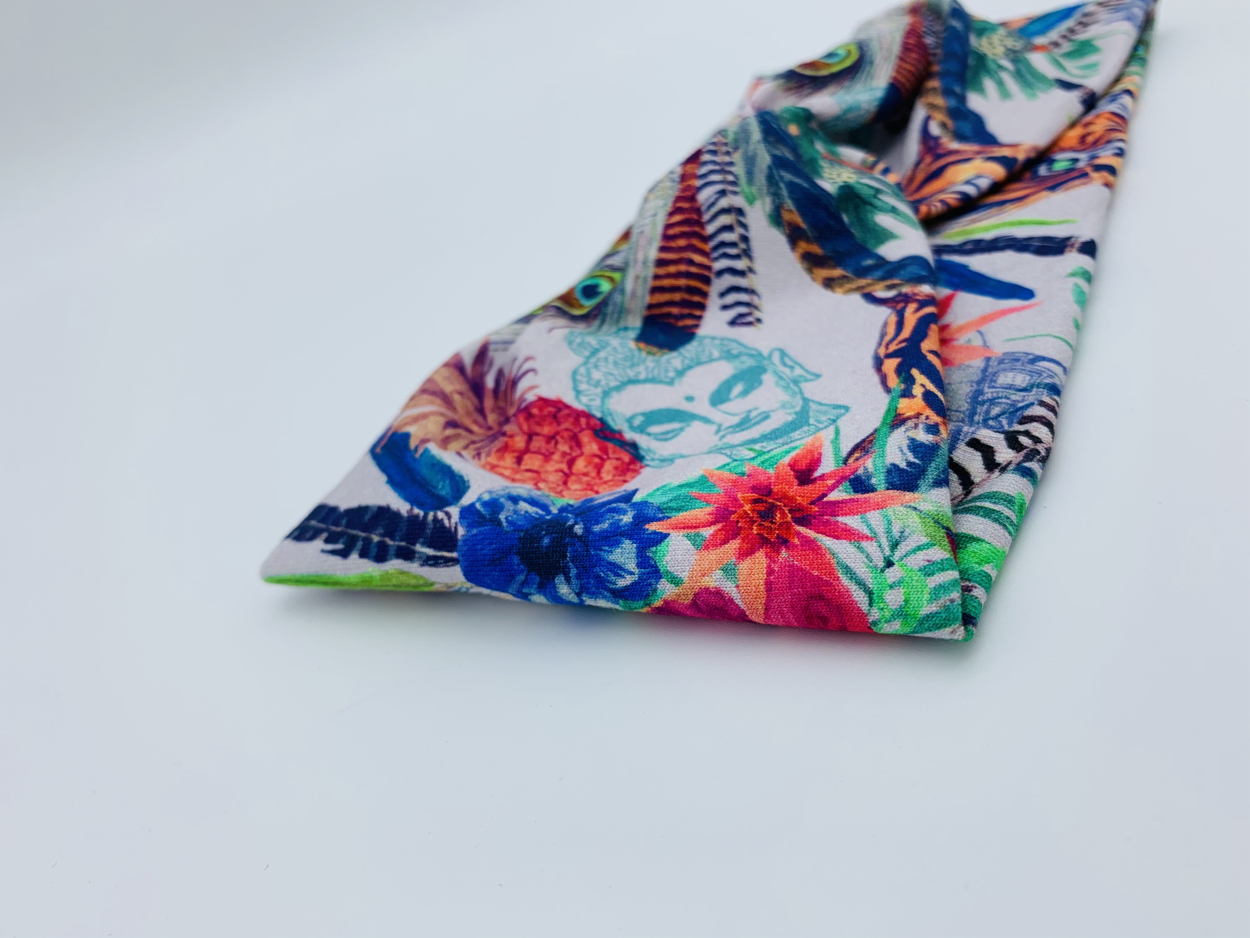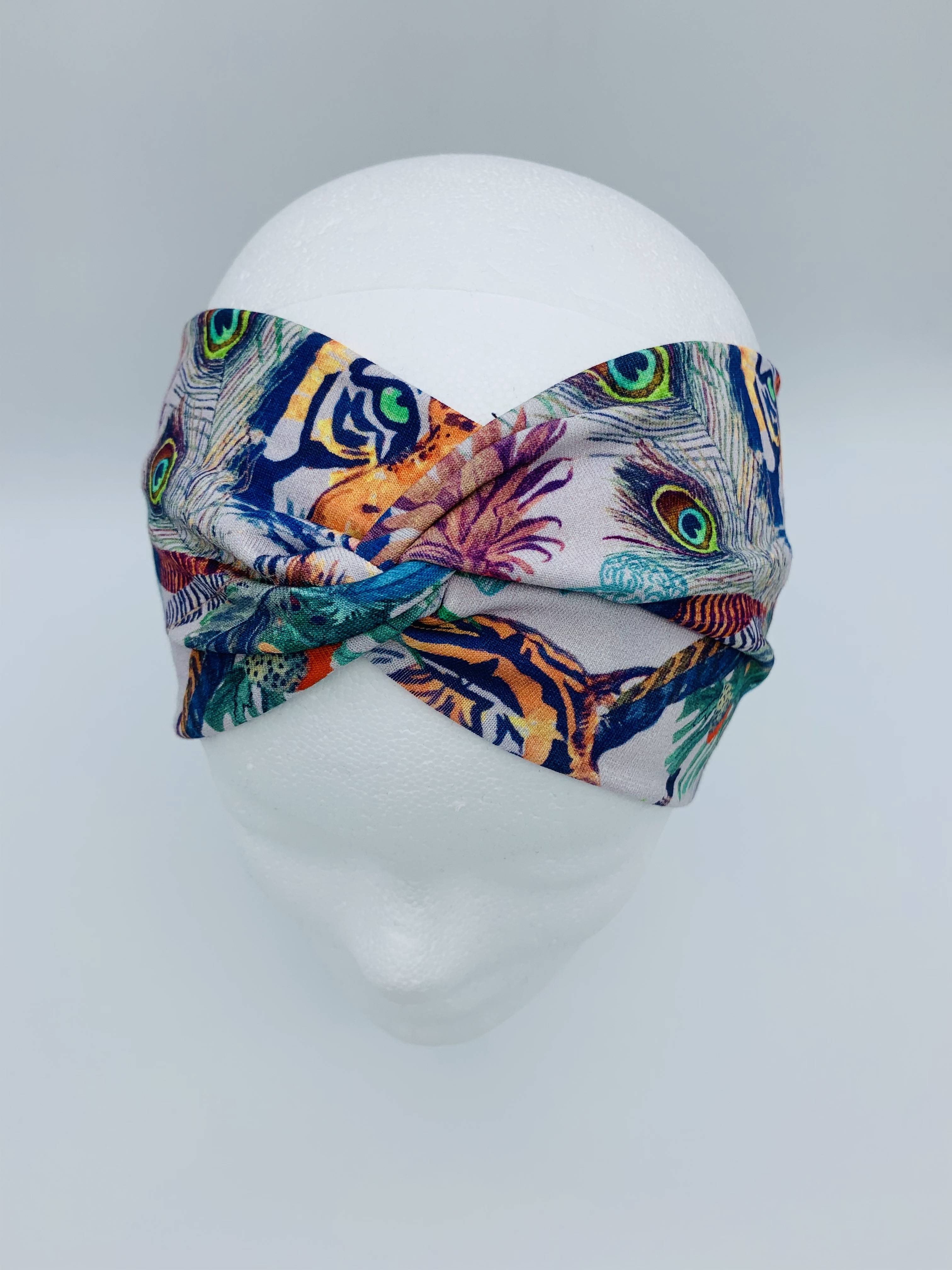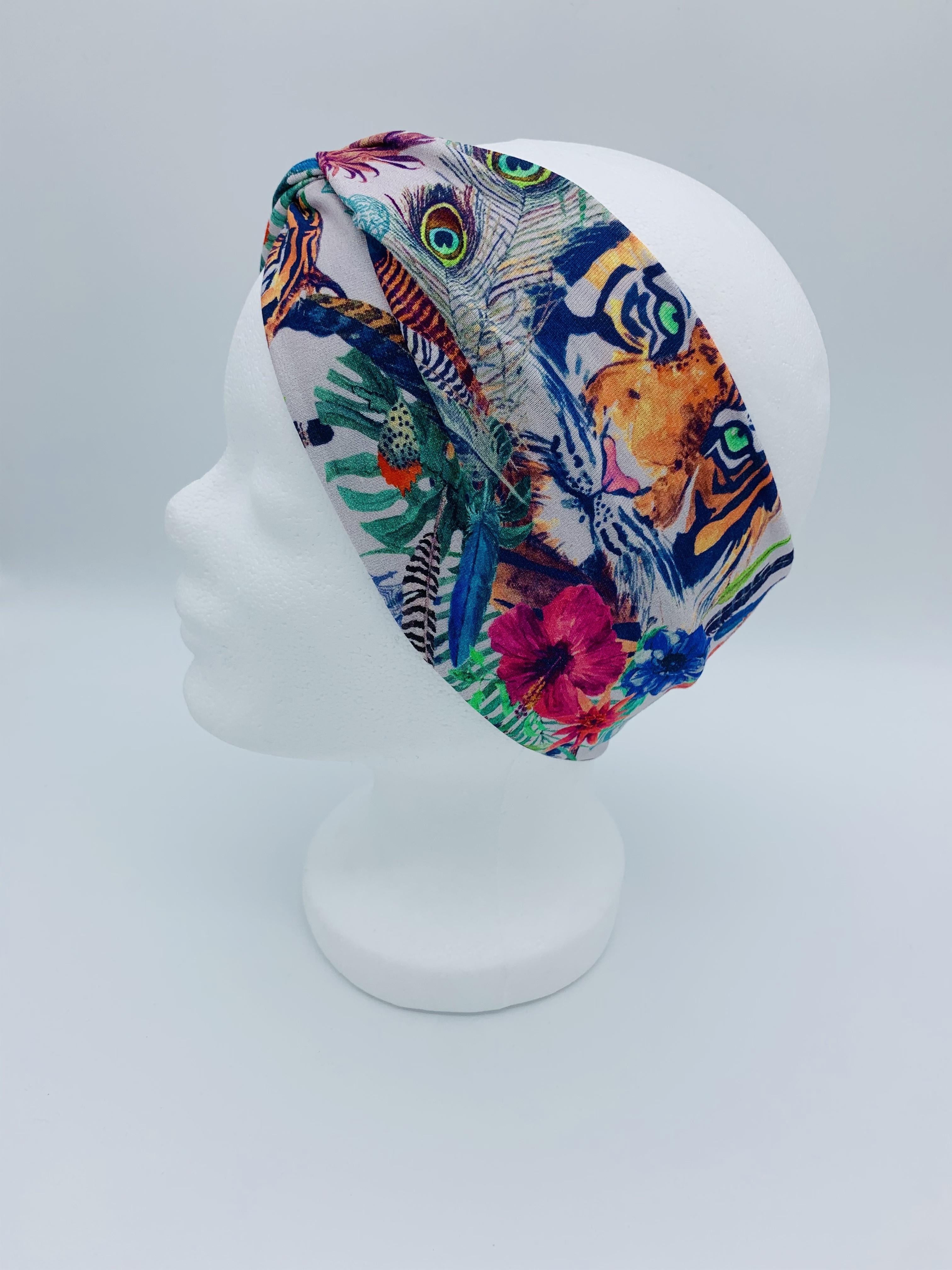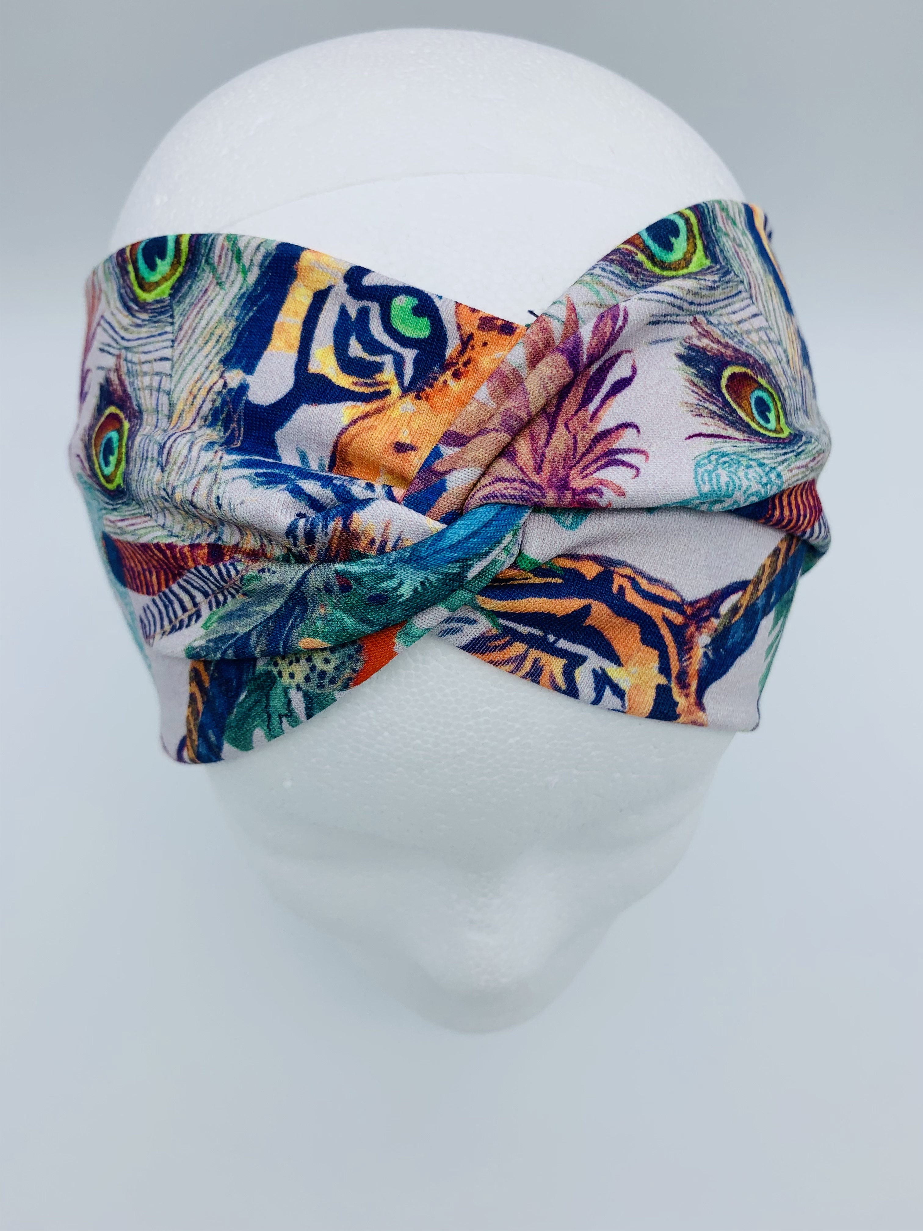 Stirnband aus Baumwolljersey in Hellgrau mit bunten Tigern, Budda's und Federn